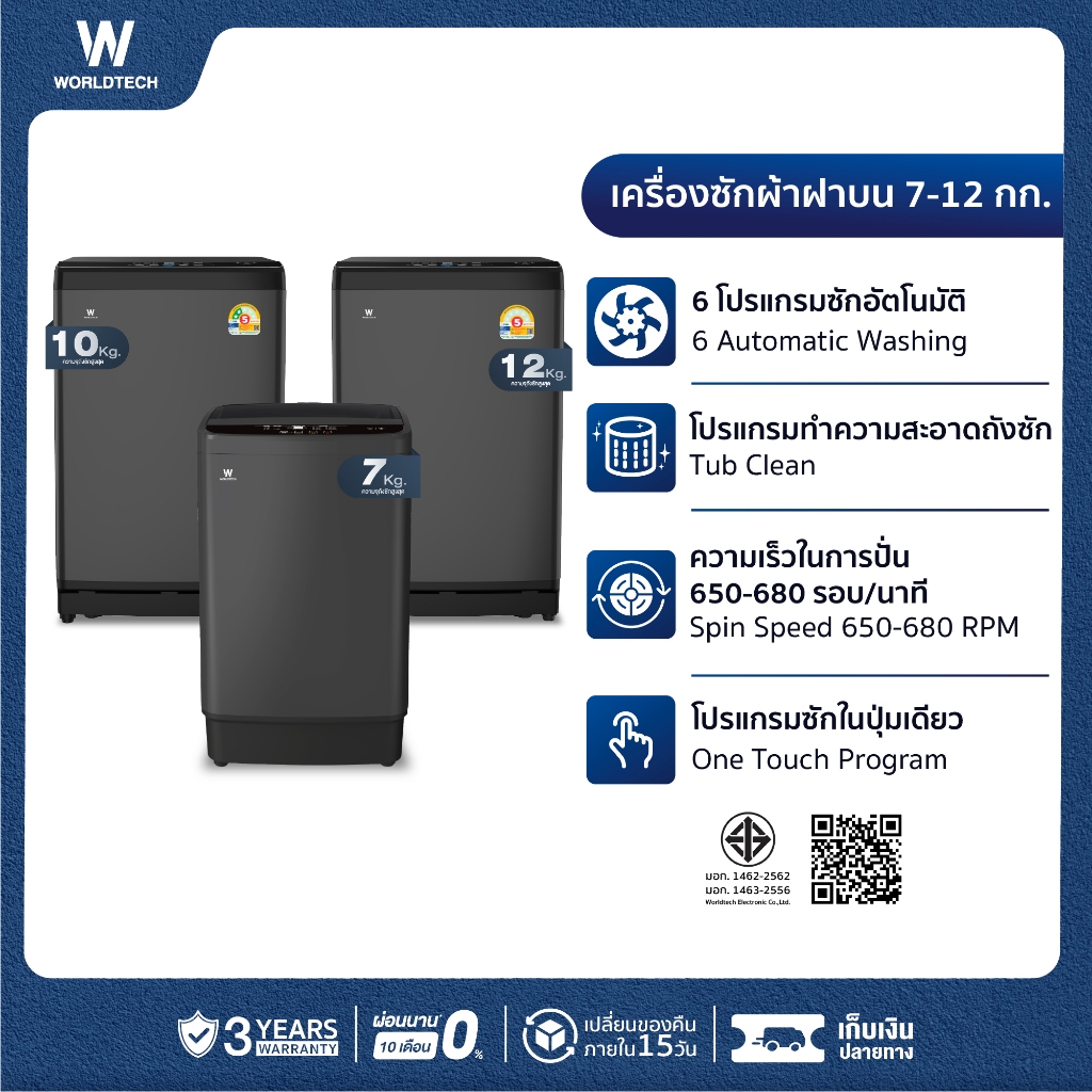 [พร้อมส่ง] Worldtech เครื่องซักผ้าฝาบน ความจุ 7-12 Kg เครื่องซักผ้า อัตโนมัติ