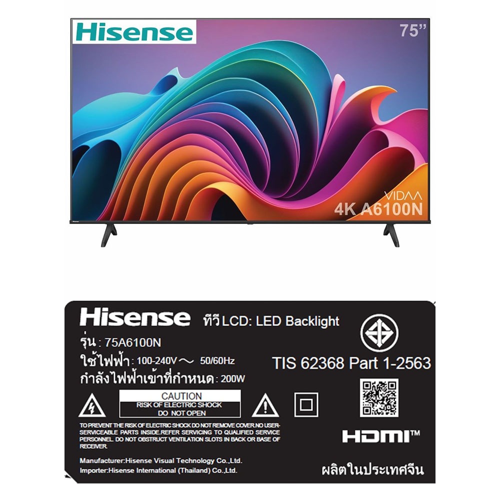 ไฮเซนส์ สมาร์ททีวี VIDAA UHD ขนาด 75 นิ้ว รุ่น 75A6100N HISENSE SMART TV VIDAA UHD 75-INCH MODEL 75A6100N