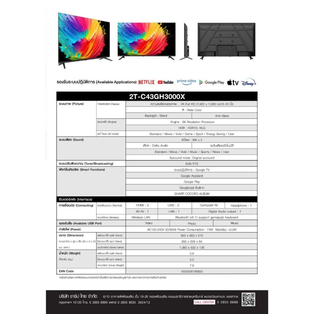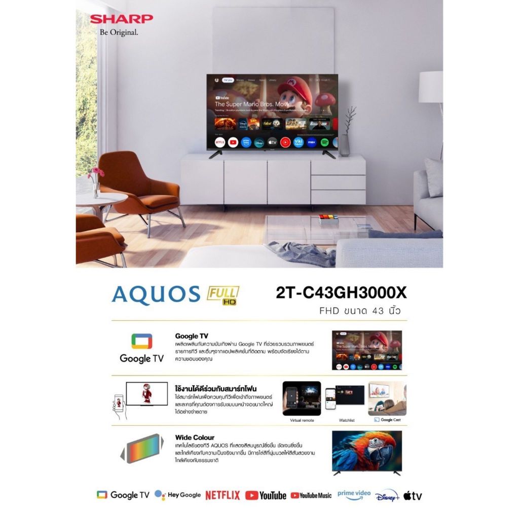 ใหม่2025 SHARP สมาร์ททีวี Full HD GoogleTV ขนาด 43 นิ้ว รุ่น 2T-C43GH3000X