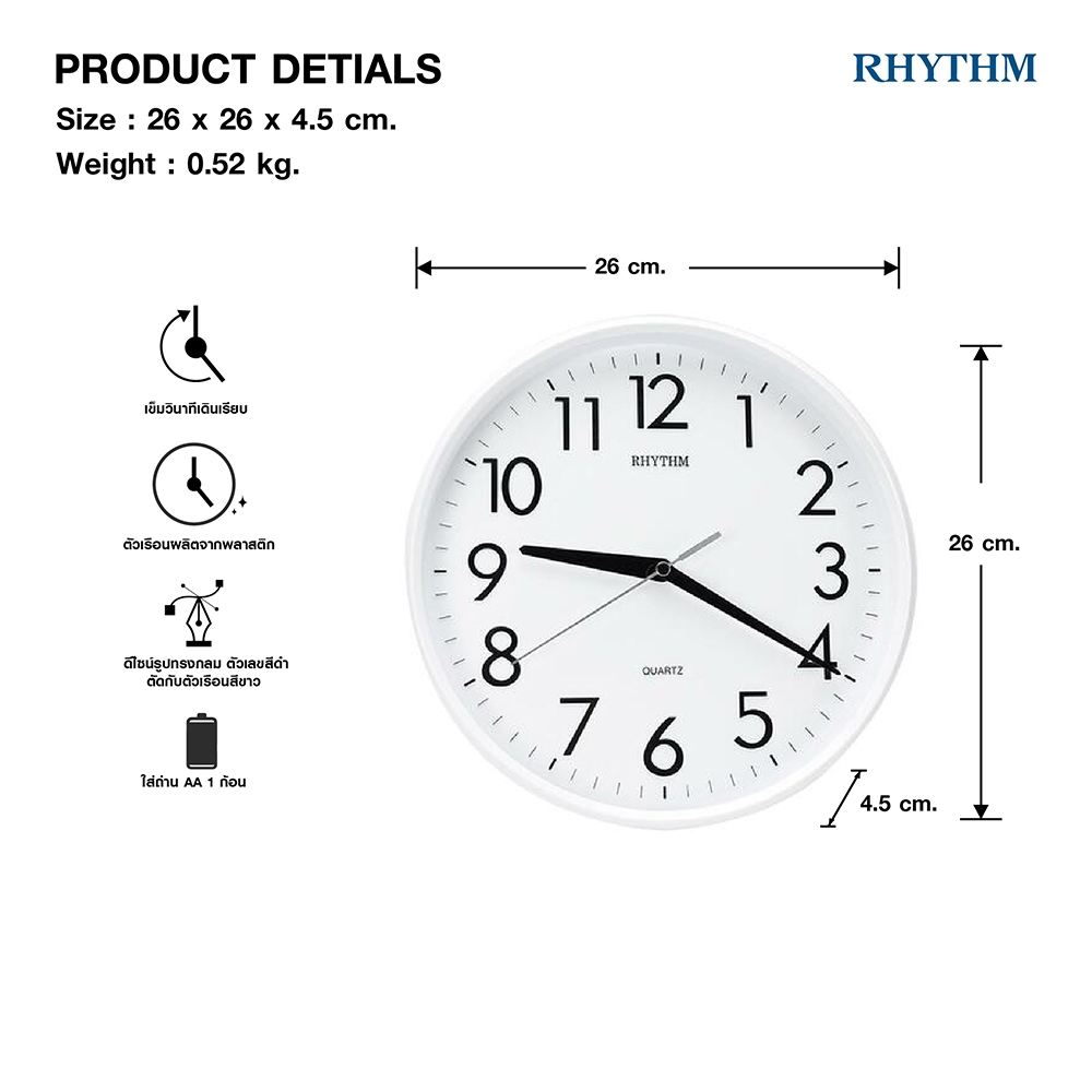 นาฬิกาแขวน RHYTHM นาฬิกาเลขสามมิติ ขนาด 26 ซม.-CMG716NR
