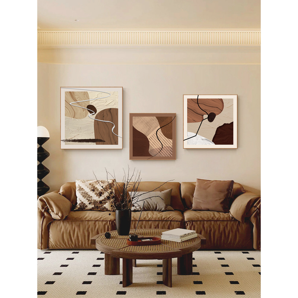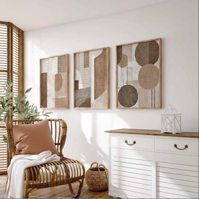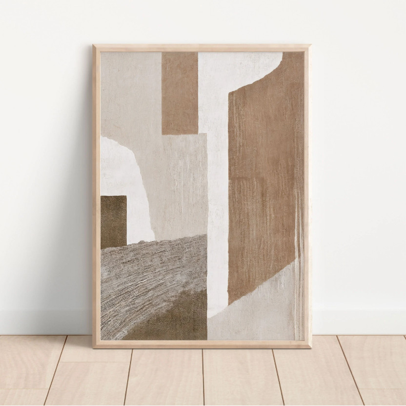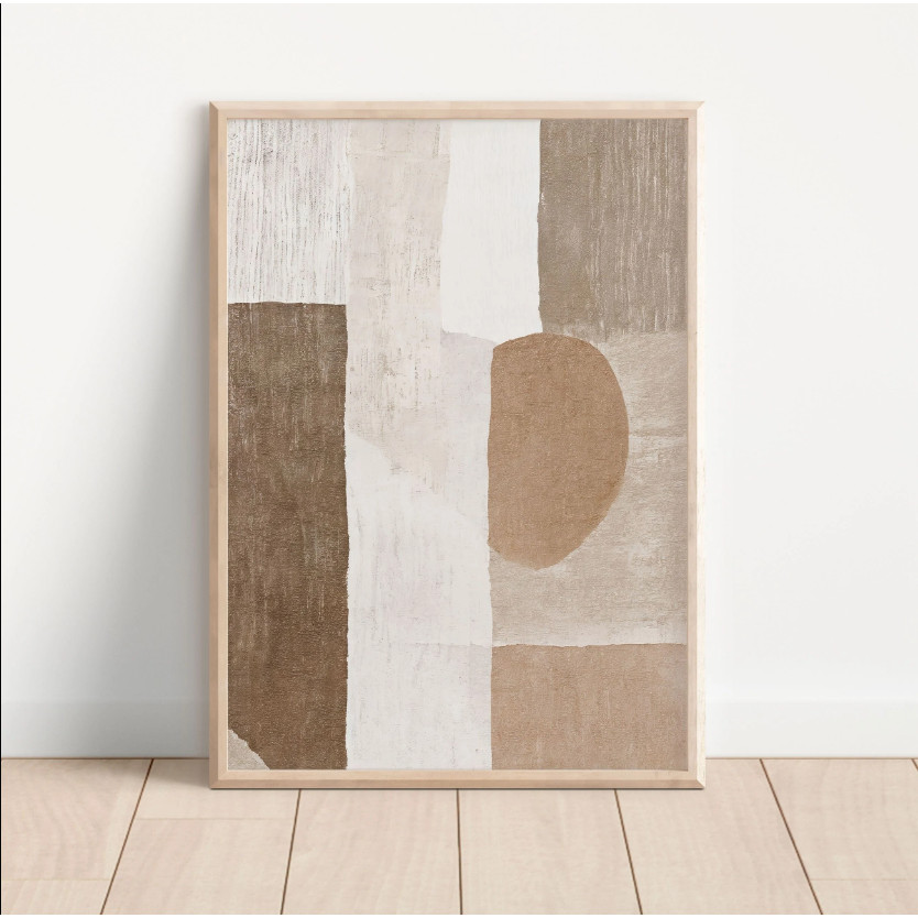 (พร้อมกรอบ) ศิลปะผนังนามธรรมเป็นกลางพิมพ์สีน้ําตาลและสีเบจเรขาคณิต โบโฮ ภาพพิมพ์ที่ทันสมัย