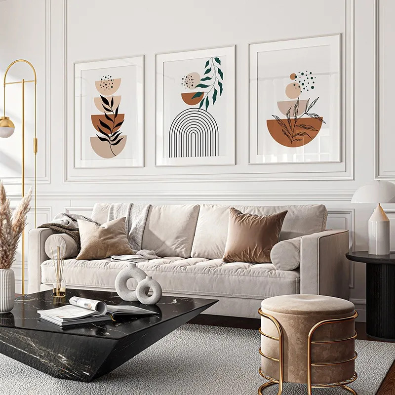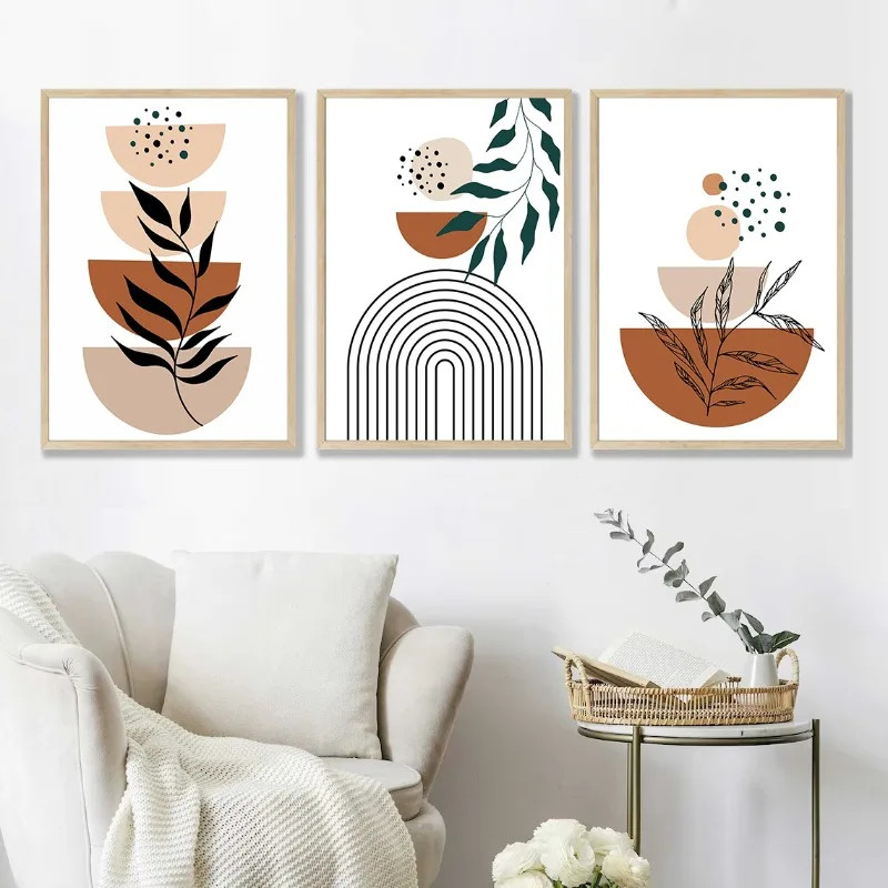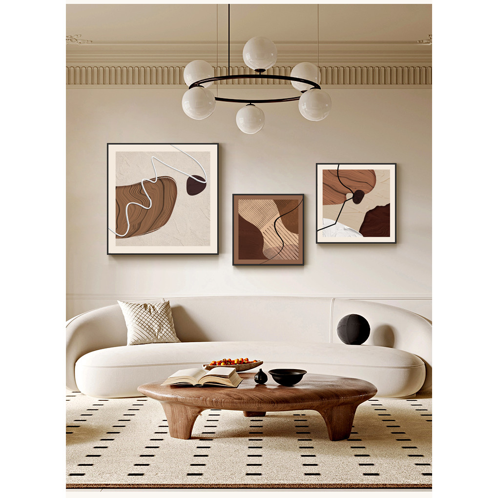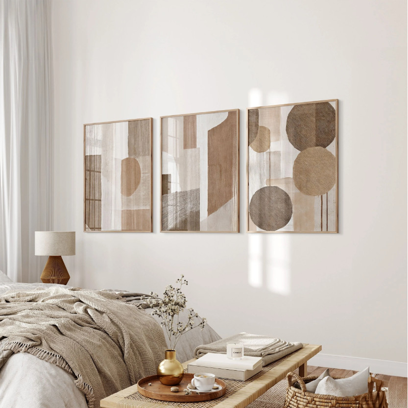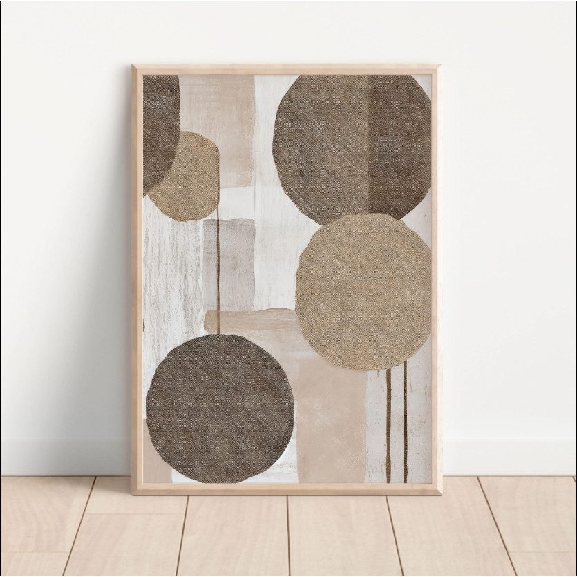 (พร้อมกรอบ) ศิลปะผนังนามธรรมเป็นกลางพิมพ์สีน้ําตาลและสีเบจเรขาคณิต โบโฮ ภาพพิมพ์ที่ทันสมัย