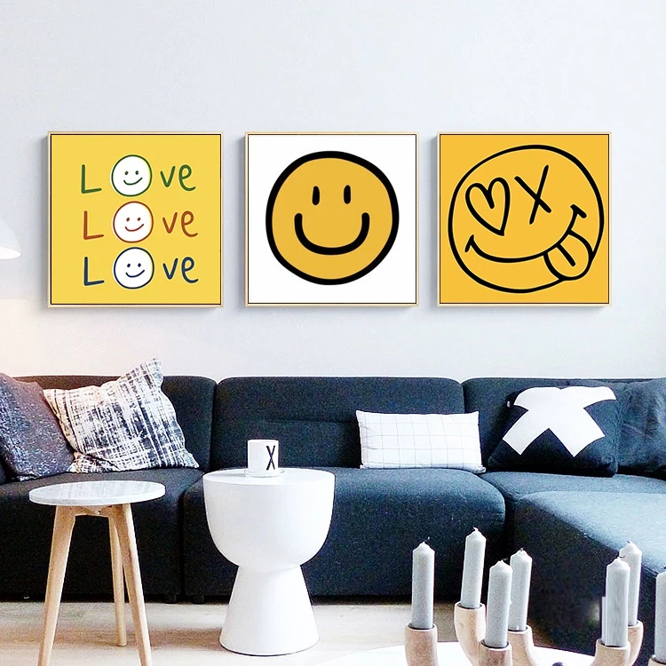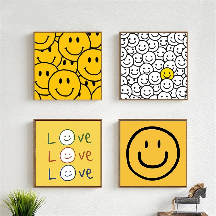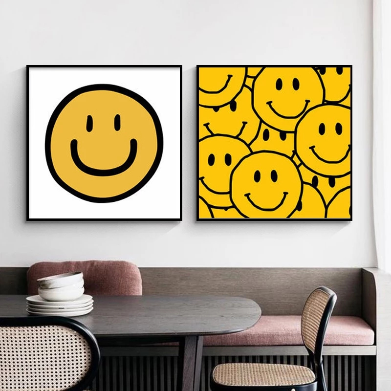 (พร้อมส่งจากไทย ภาพรวมกรอบ) รูปหน้ายิ้มน่ารัก สีเหลือง สําหรับตกแต่งผนังห้องนอน