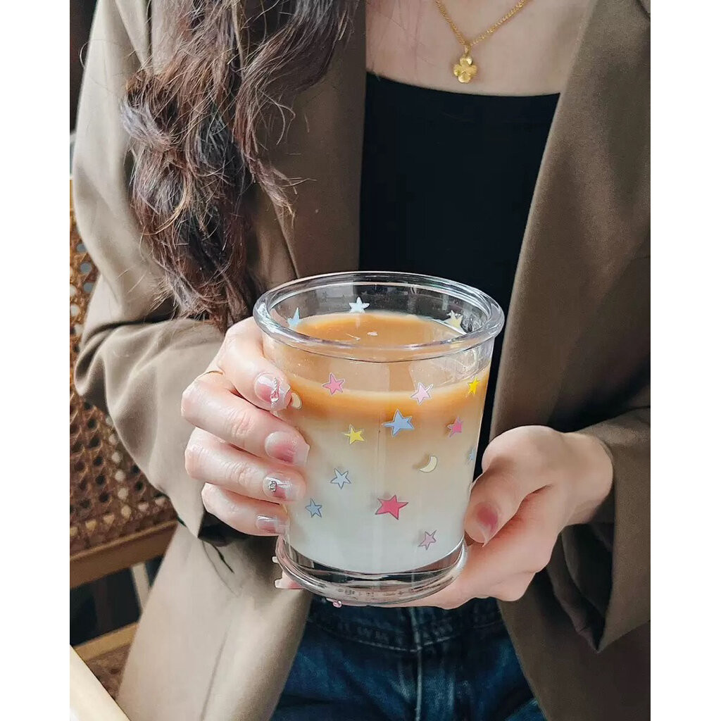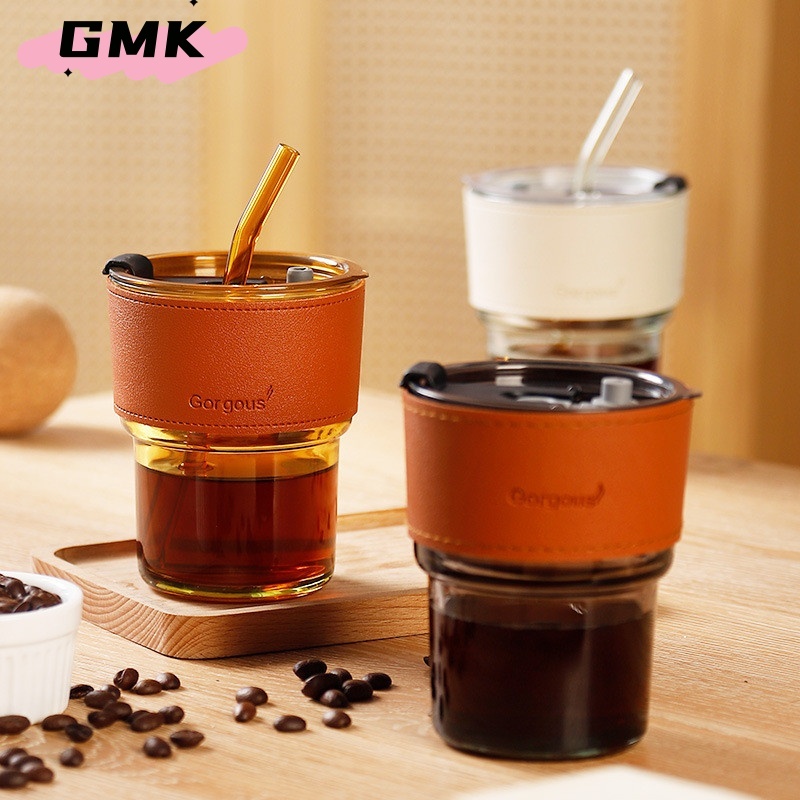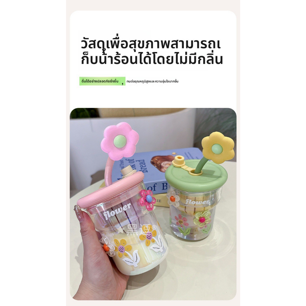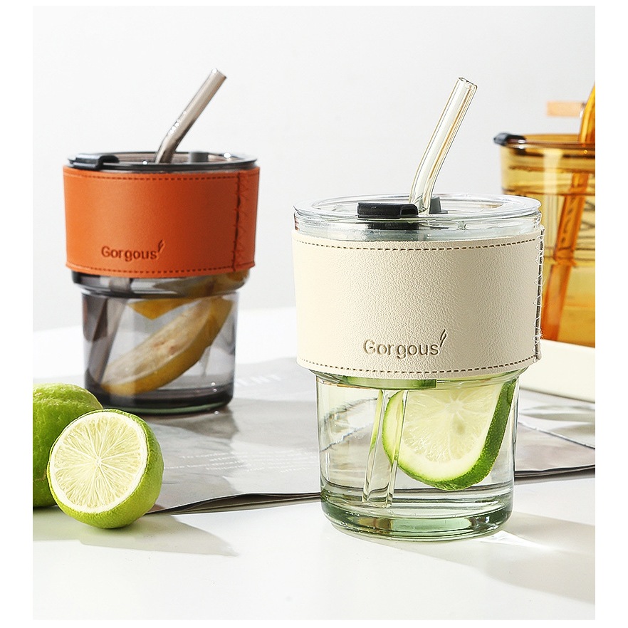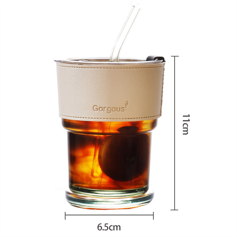 แก้วใส่น้ำ 450ml ถ้วยแก้ว แก้วกาแฟ แก้วน้ำพร้อมหลอด ฝาปิด ปลอกซิลิโคนกันร้อน พร้อมส่ง AG2436