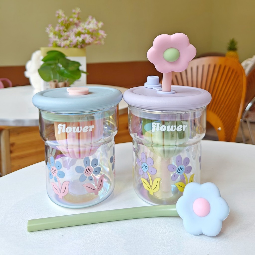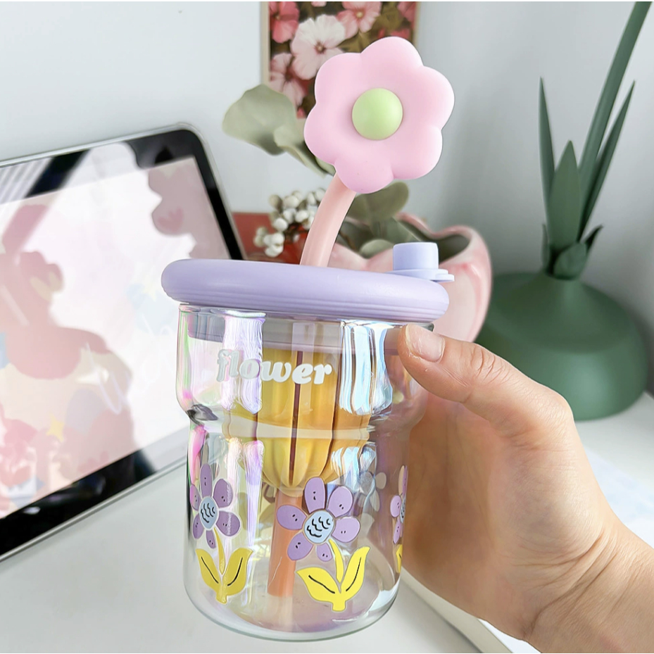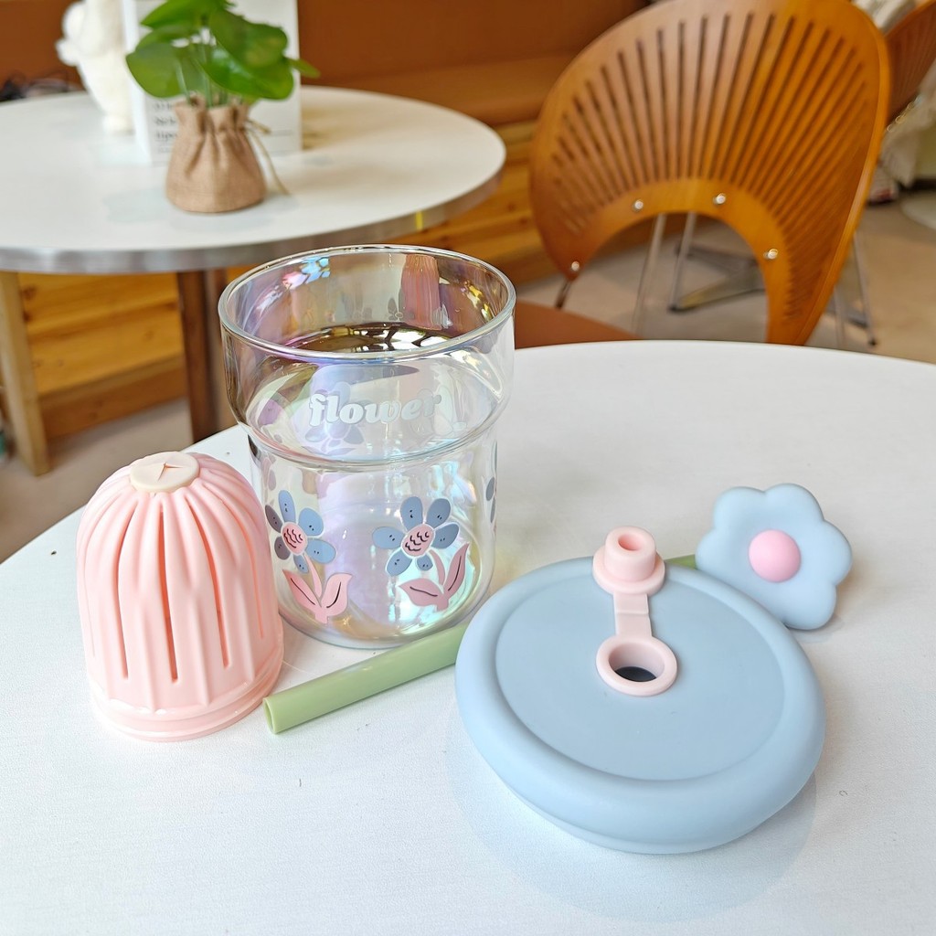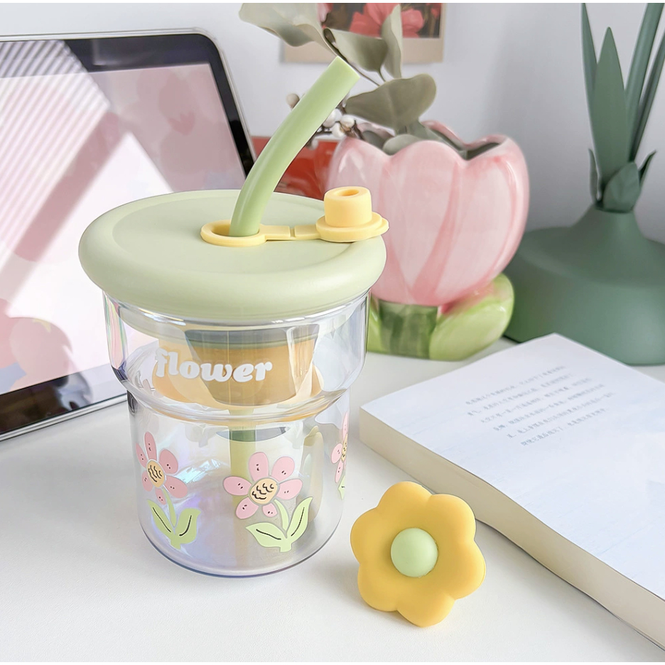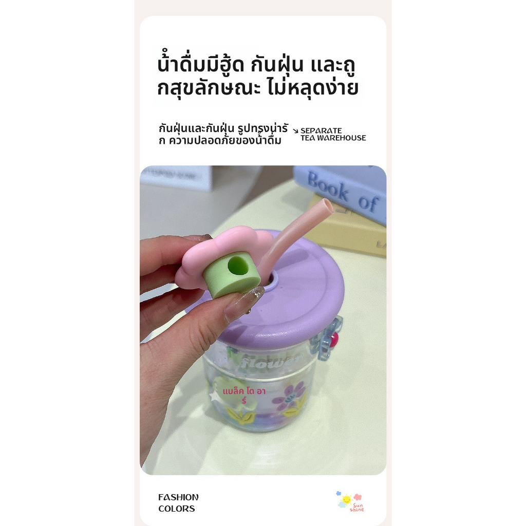 แก้วแก้วไบโอซิลิคอน สวยงามสำหรับสาว | ปลอดสารพิษปลอดภัย | แยกตัวชา/น้ำ มีฝา +ฝาครอบดูดเสียบดอกไม้