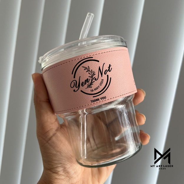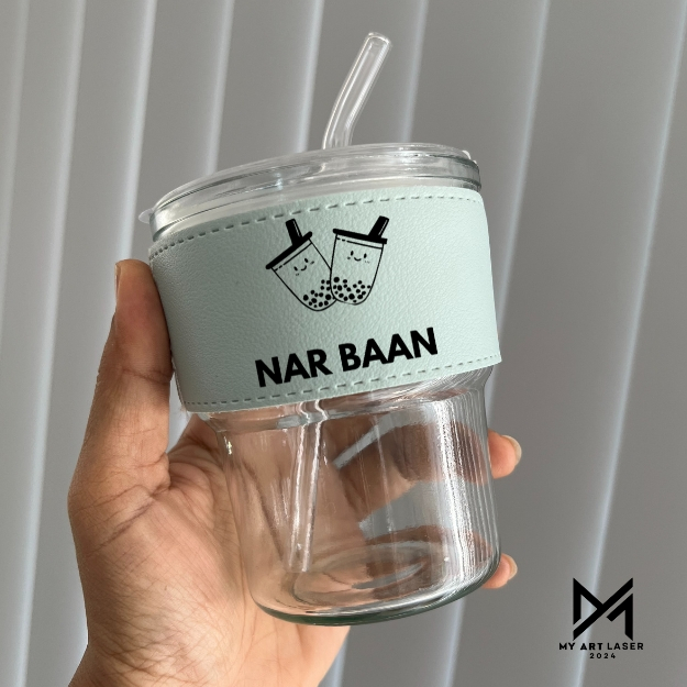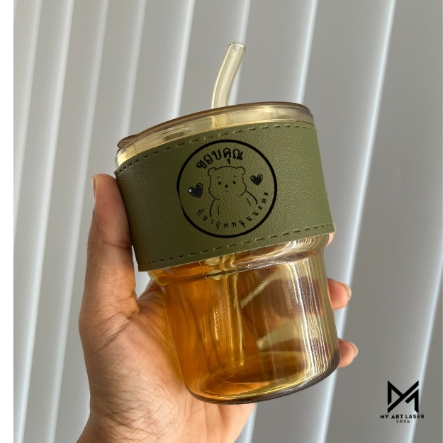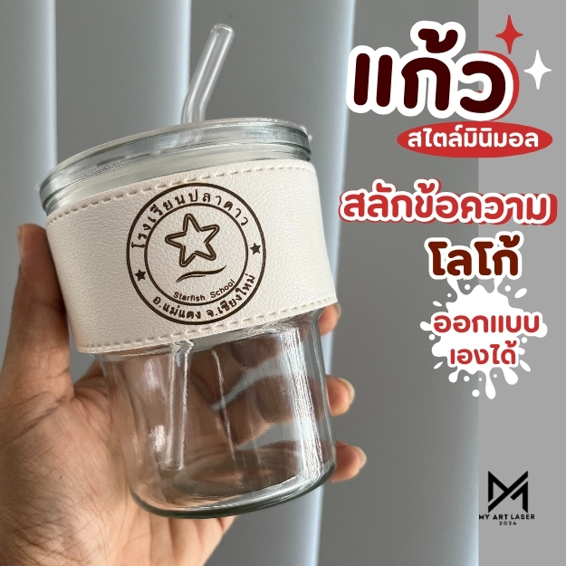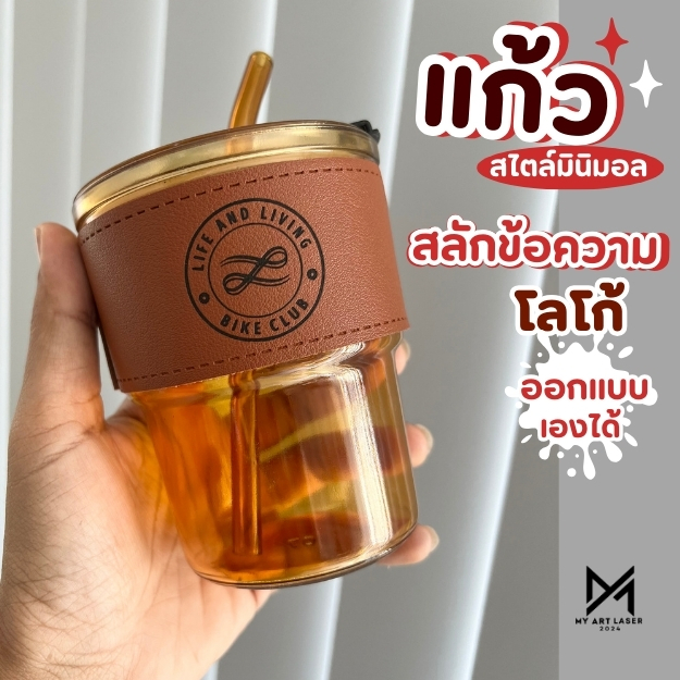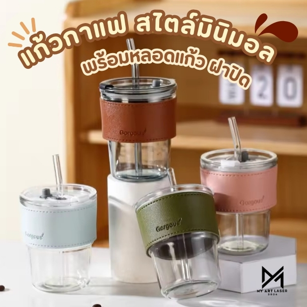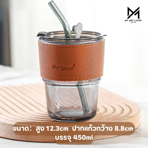 แก้วใส่น้ำ สไตล์มินิมอล พร้อมหลอดแก้ว ฝาปิด เลเซอร์ ข้อความ โลโก้ ออกแบบเองได้ 450ml (A3)