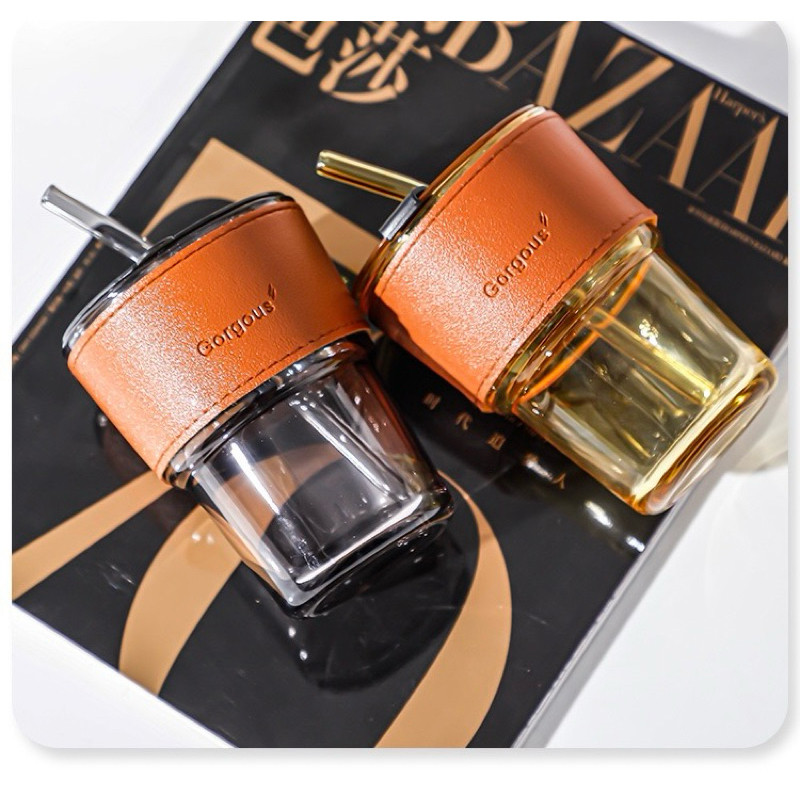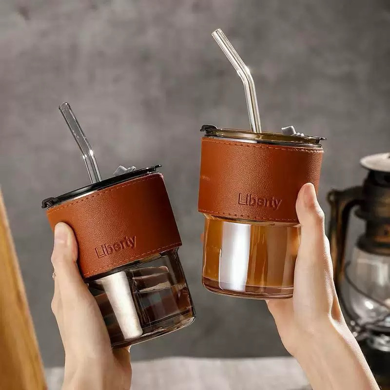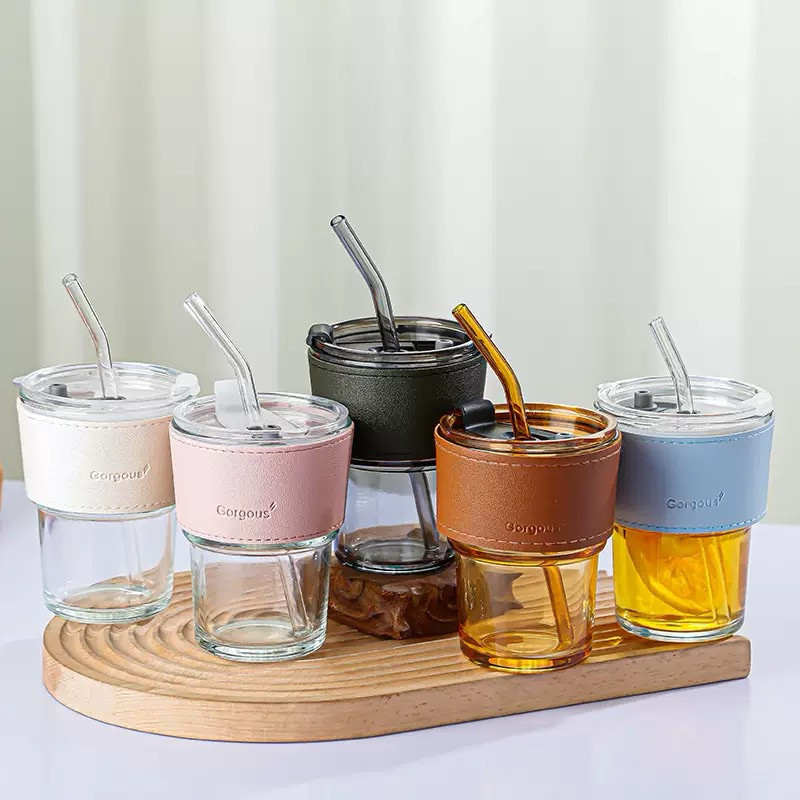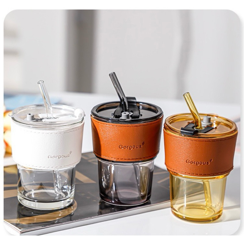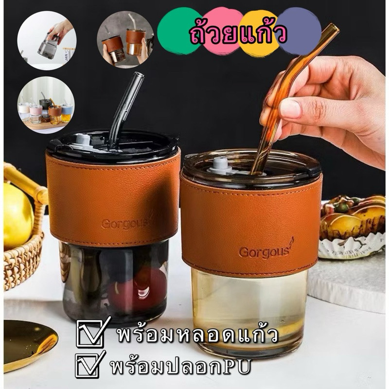 365mallshop (2074) ถ้วยแก้ว แก้วใส่น้ำ 450ml แก้วกาแฟ สไตล์มินิมอล พร้อมหลอดแก้ว ฝาปิด ปลอกซิลิโคนกันร้อน