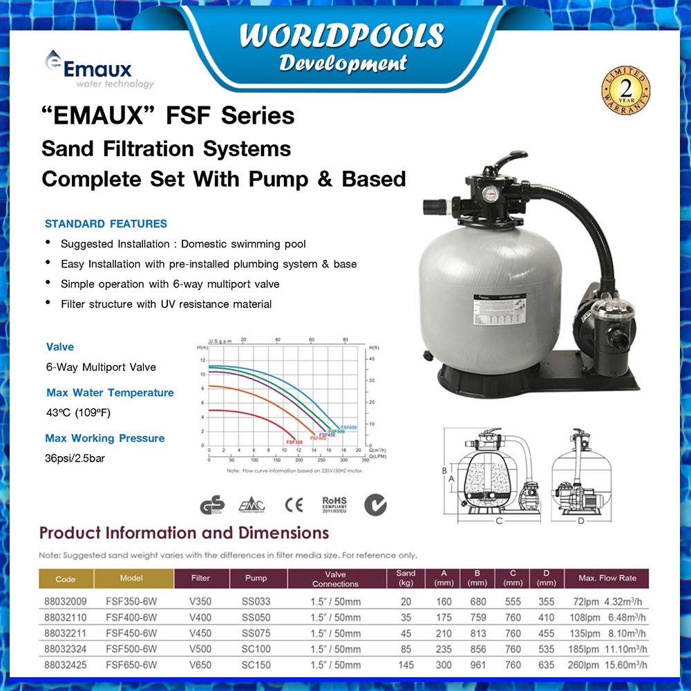 ชุดปั๊มและถังกรองทราย EMAUX FSF350SS อัตราการกรอง 4.32 คิว/ชม. สำหรับสระว่ายน้ำ