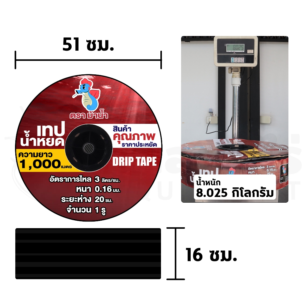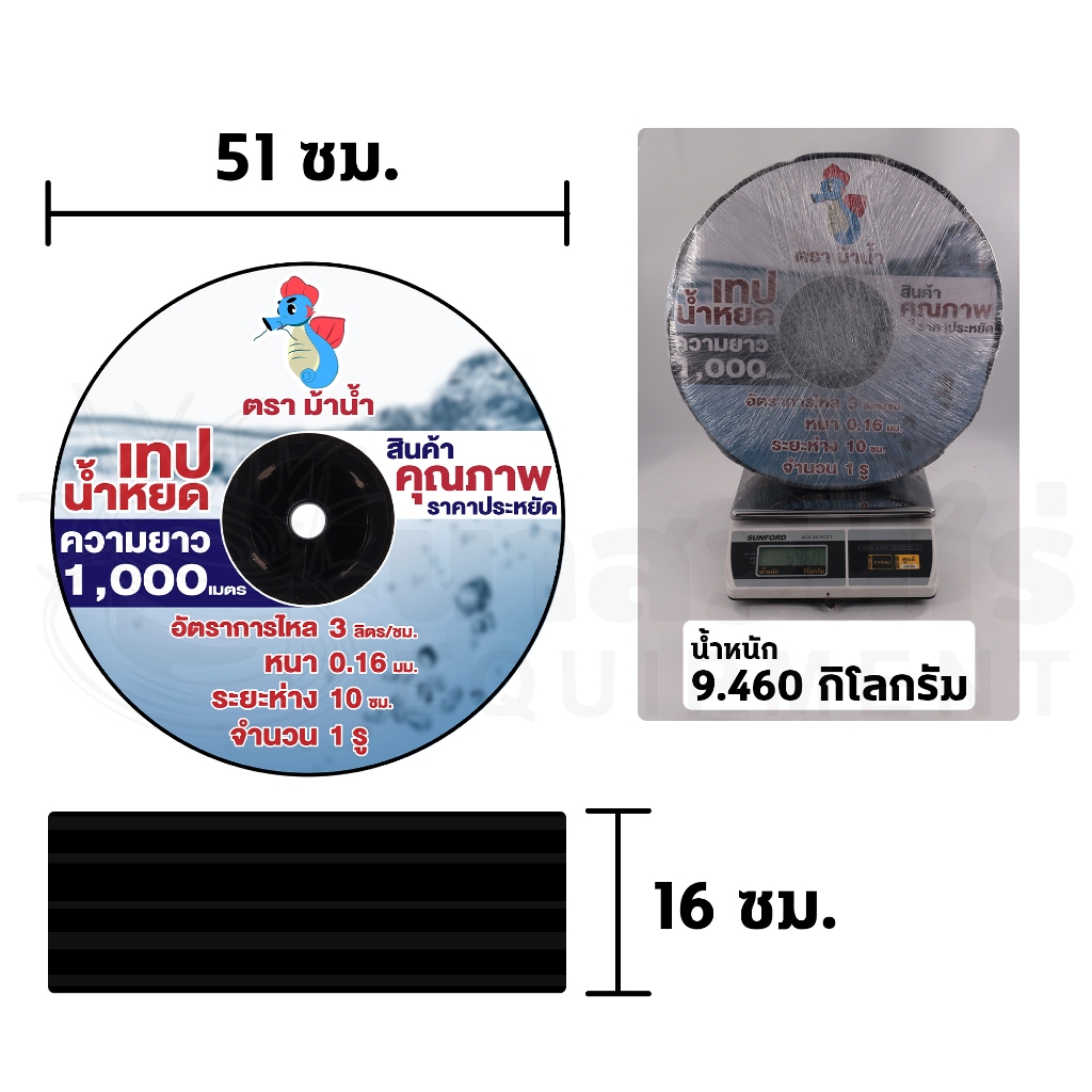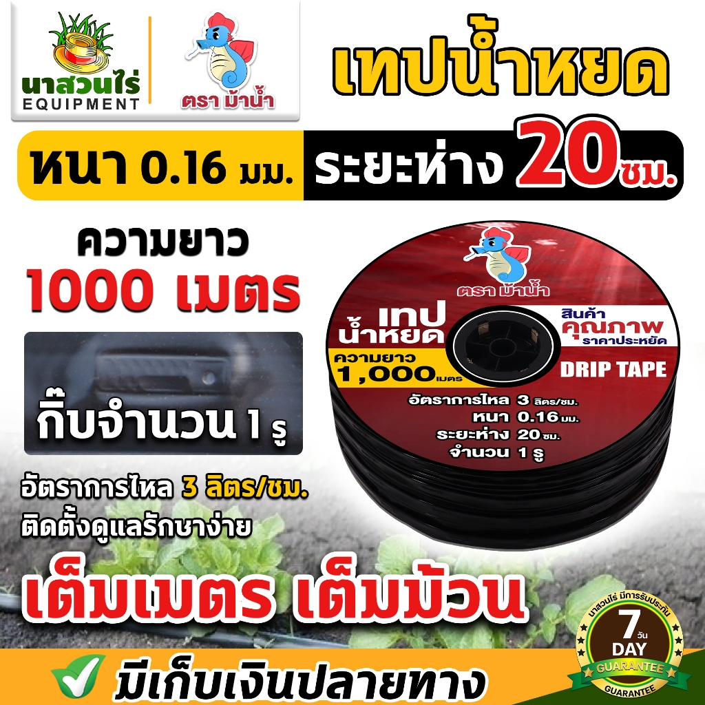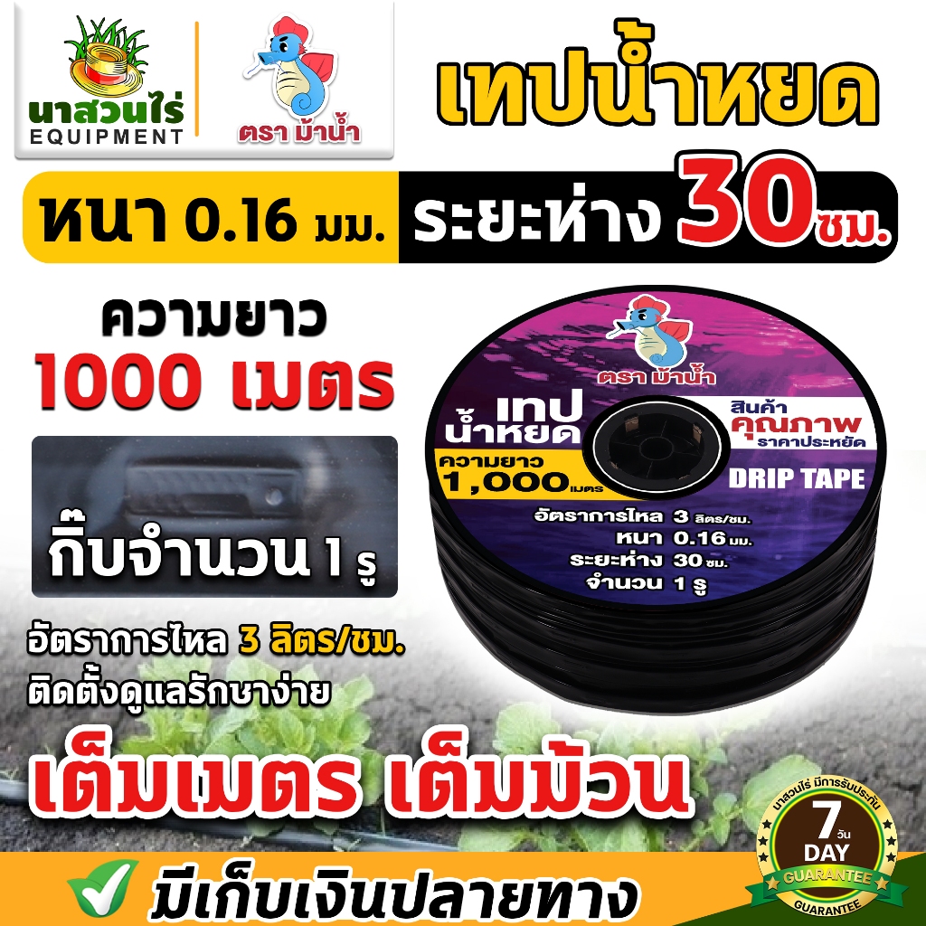 เทปน้ำหยด ตราม้าน้ำ ความหนา 0.16 มม. ระยะห่างรู 10,20,30 ซม. 1รู ความยาว 1000 เมตรเต็ม ประกัน 7 วัน