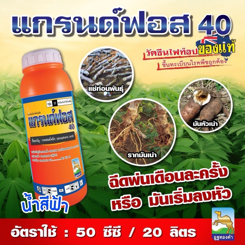 แกรนด์ฟอส 40 กรดฟอสโฟนิก ขนาด 1 ลิตร อูฐทองคำ สารกำจัดเชื้อรา ฝั่งเข็ม รากเน่าโคนเน่า โรคยอดเน่า มันสำปะหรั่งเน่า