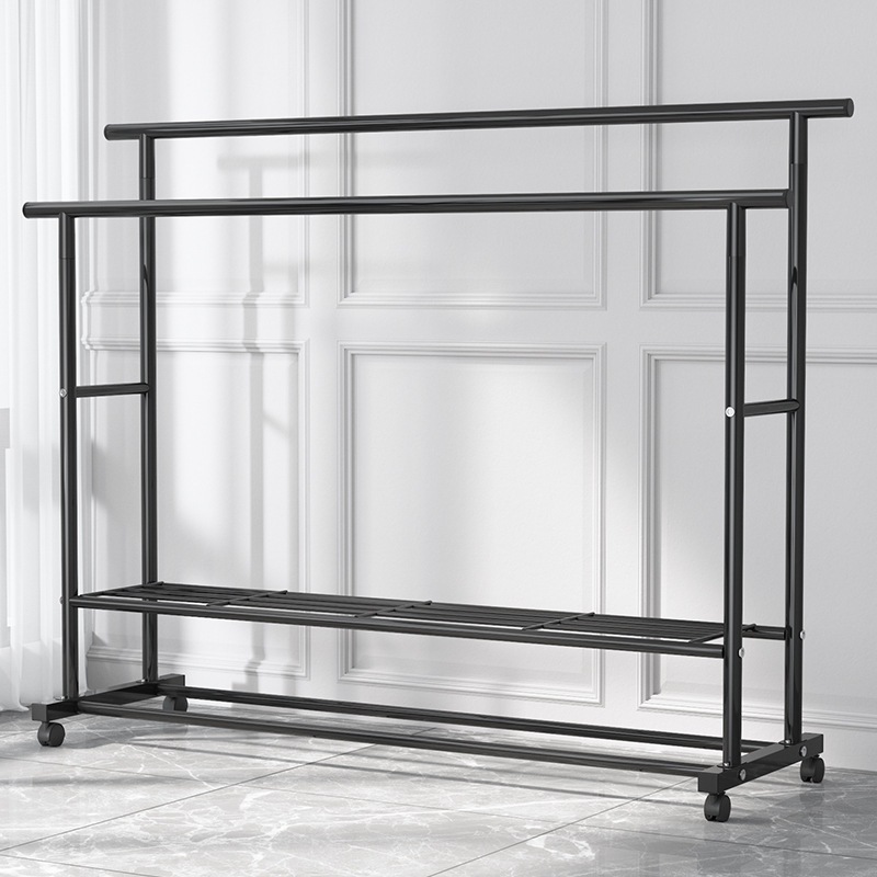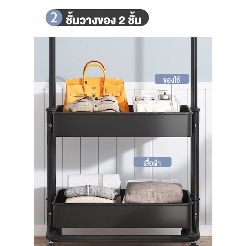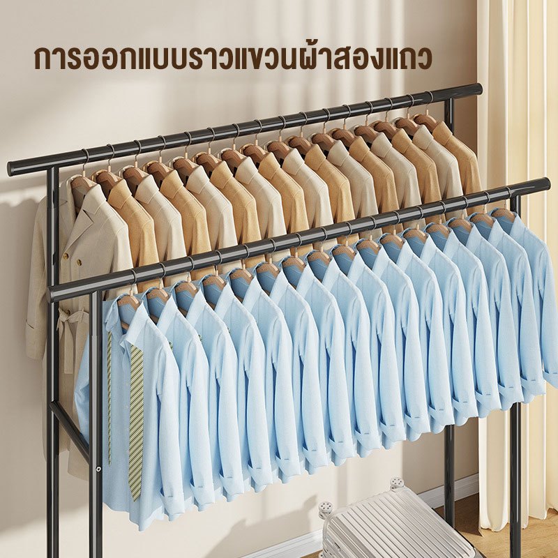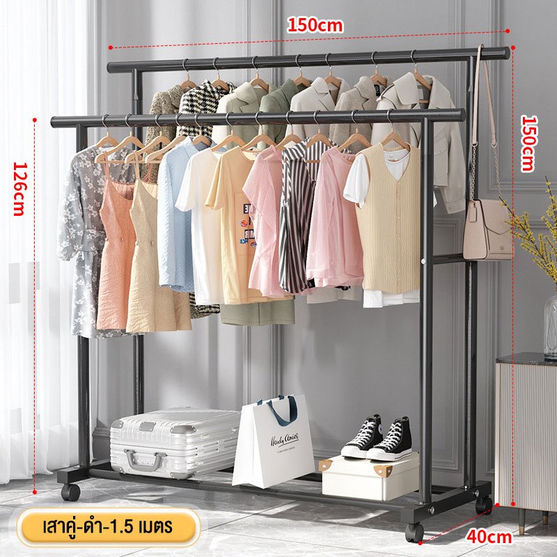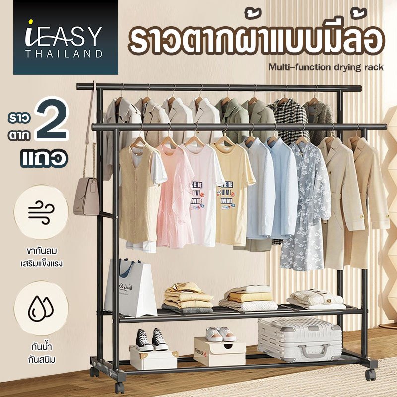 IEASY ราวตากผ้า ราวแขวนเสื้อผ้า ราวเหล็กมีล้อ บาร์คู่ ชั้นวาง 2 ชั้น ชั้นวางเสริมด้านข้าง โครงเหล็ก เสริมชั้นวางด้านข้าง