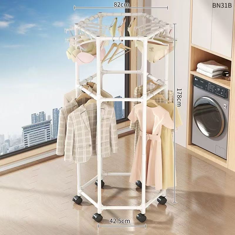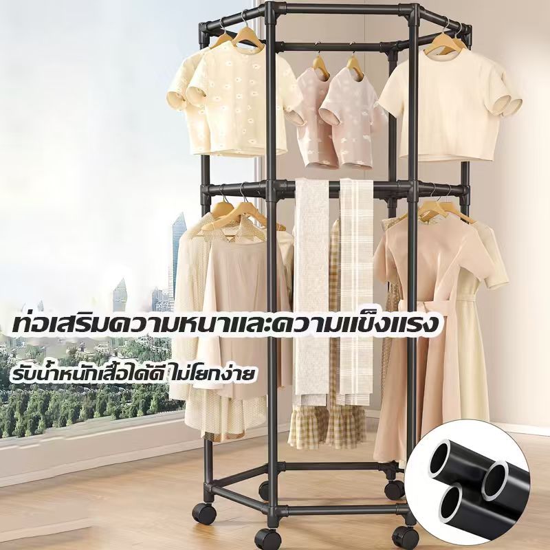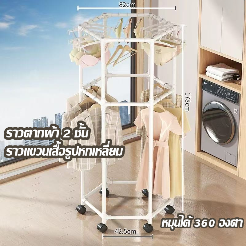 ราวแขวนผ้าหกเหลี่ยมหมุนได้พร้อมล้อ หมุนได้ 360 องศา ค์ประหยัดพื้นที่ราวตากผ้าแบบเคลื่อนย้ายได้ใช้ในบ้าน ถอดออกได้
