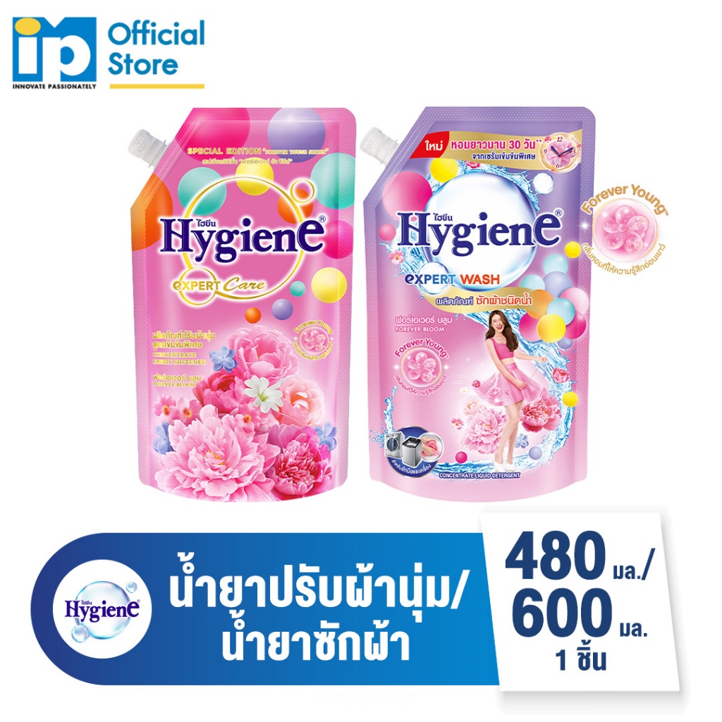 [ซื้อคู่] ไฮยีน เอ็กซ์เพิร์ท แคร์ ฟอร์เอเวอร์ ยัง น้ำยาปรับผ้านุ่ม 480 มล.และ น้ำยาซักผ้า 600 มล. กลิ่นฟอร์เอเวอร์ บลูม