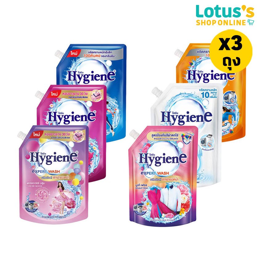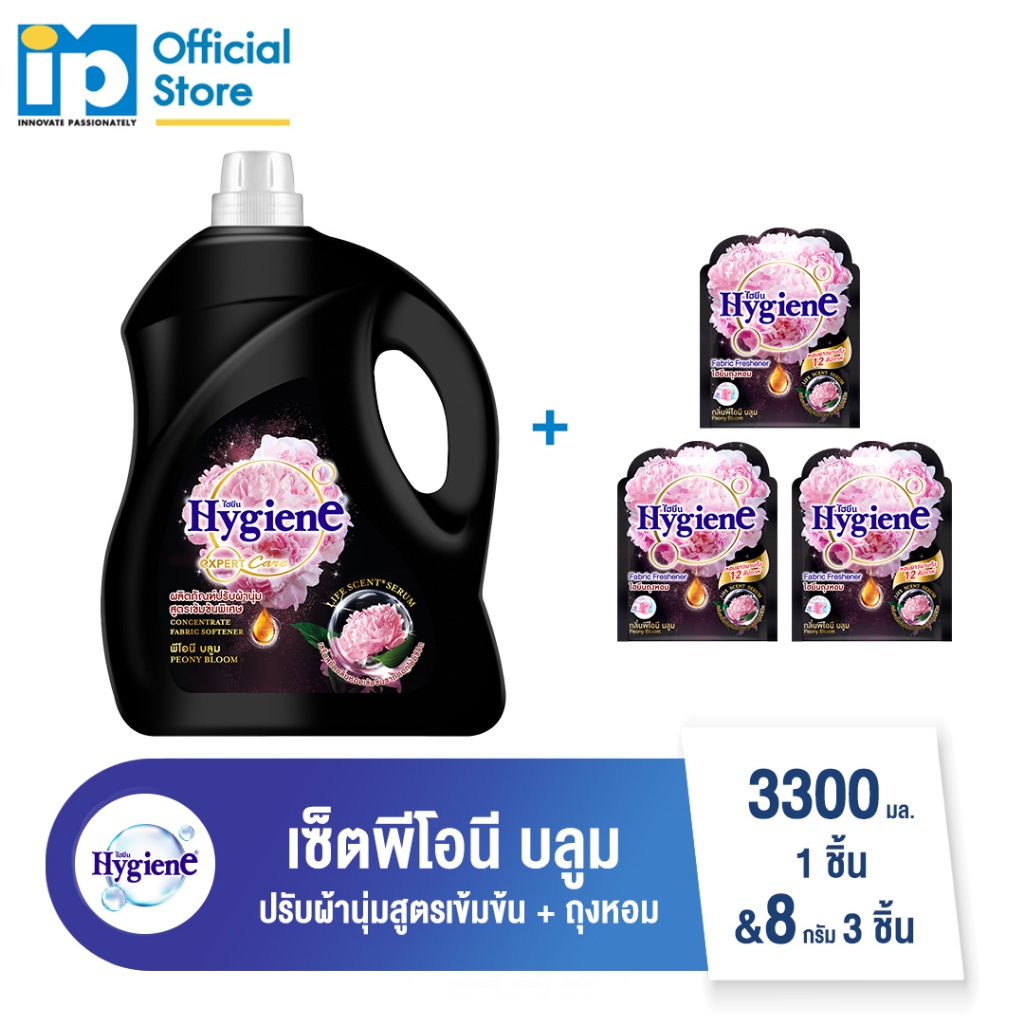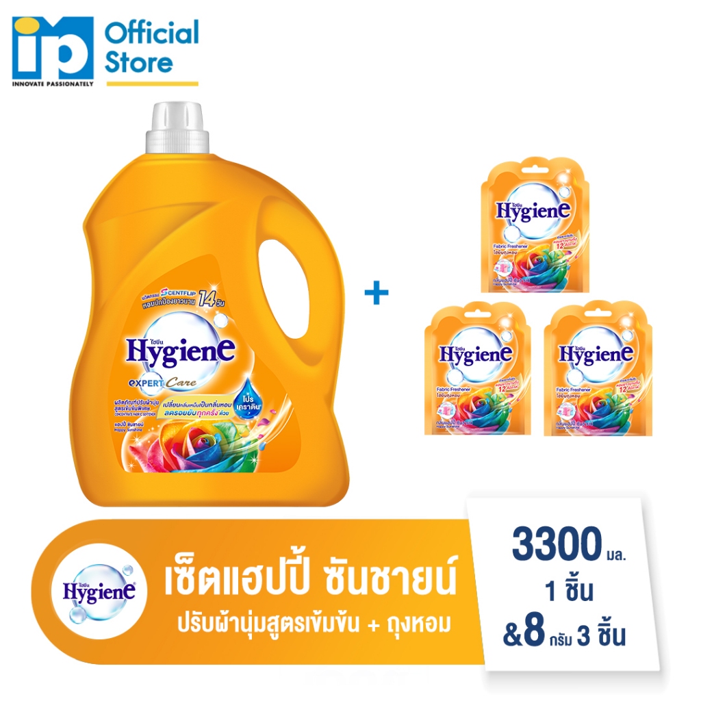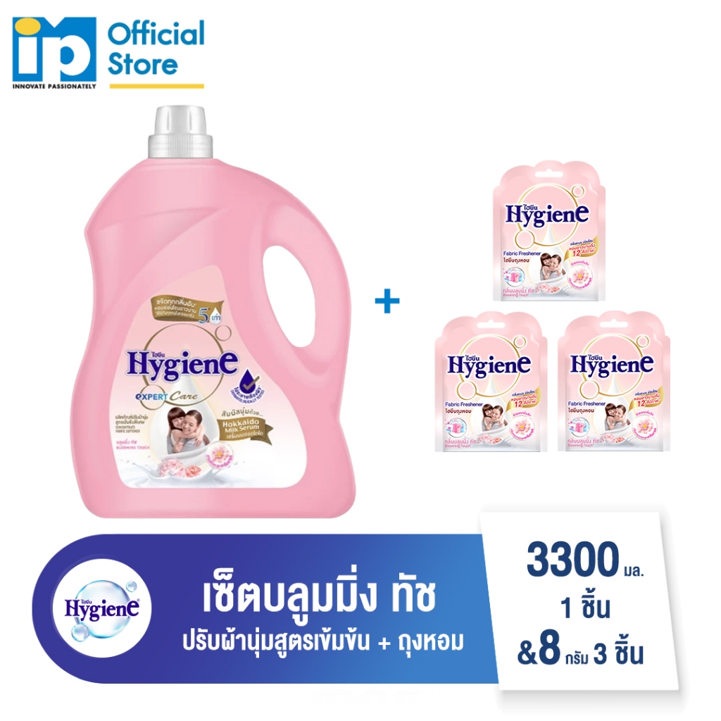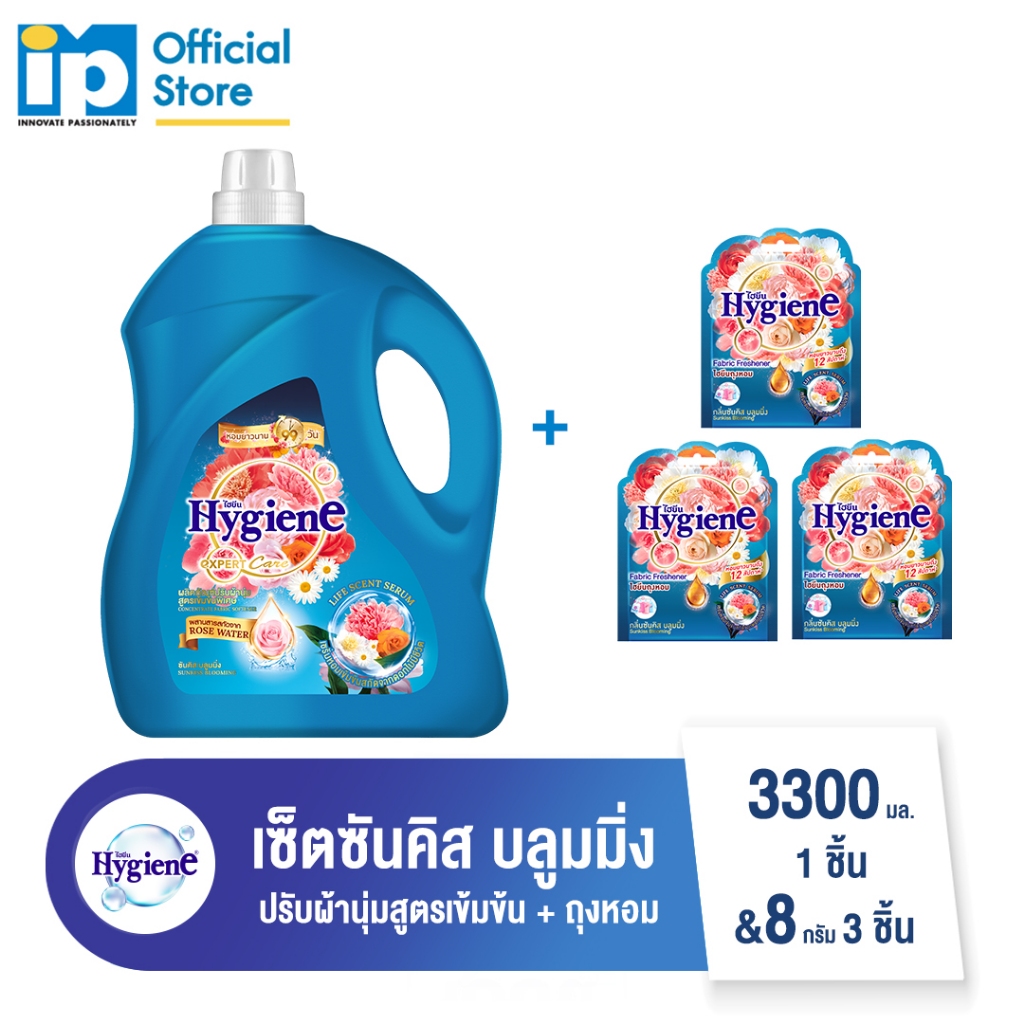[ซื้อคู่] ไฮยีน น้ำยาปรับผ้านุ่มสูตรเข้มข้นพิเศษ 3300 มล. 1 ชิ้น และ ไฮยีน ถุงหอม 8 กรัม 3 ชิ้น (เลือกกลิ่น)