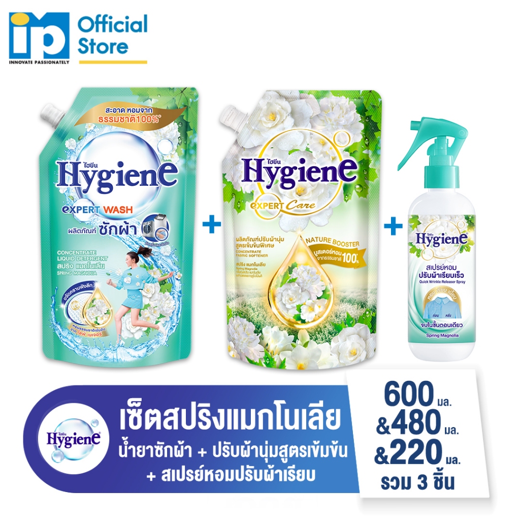 [ซื้อครบเซ็ต] ไฮยีน น้ำยาซักผ้า 600 มล. และ น้ำยาปรับผ้านุ่ม 480 มล.และสเปรย์หอมปรับผ้าเรียบเร็ว 220 มล. สปริง แมกโนเลีย