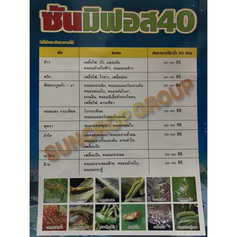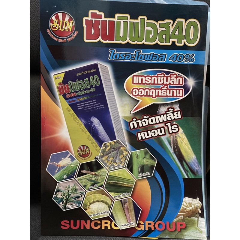 ซันมิฟอส40(ไตรอะโซฟอส40%)กำจัดเพลี้ย หนอน ไร แทรกซึมลึก ออกฤทธิ์นานขนาด 1ลิตร