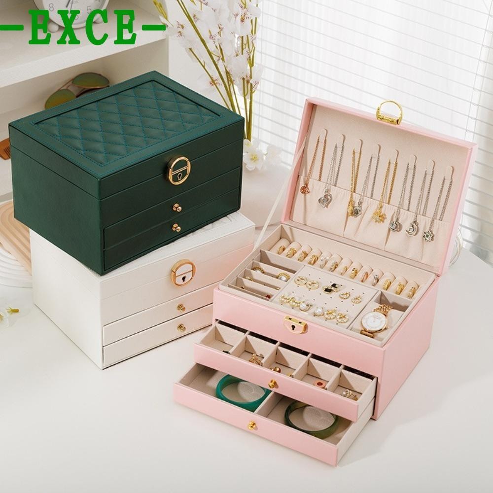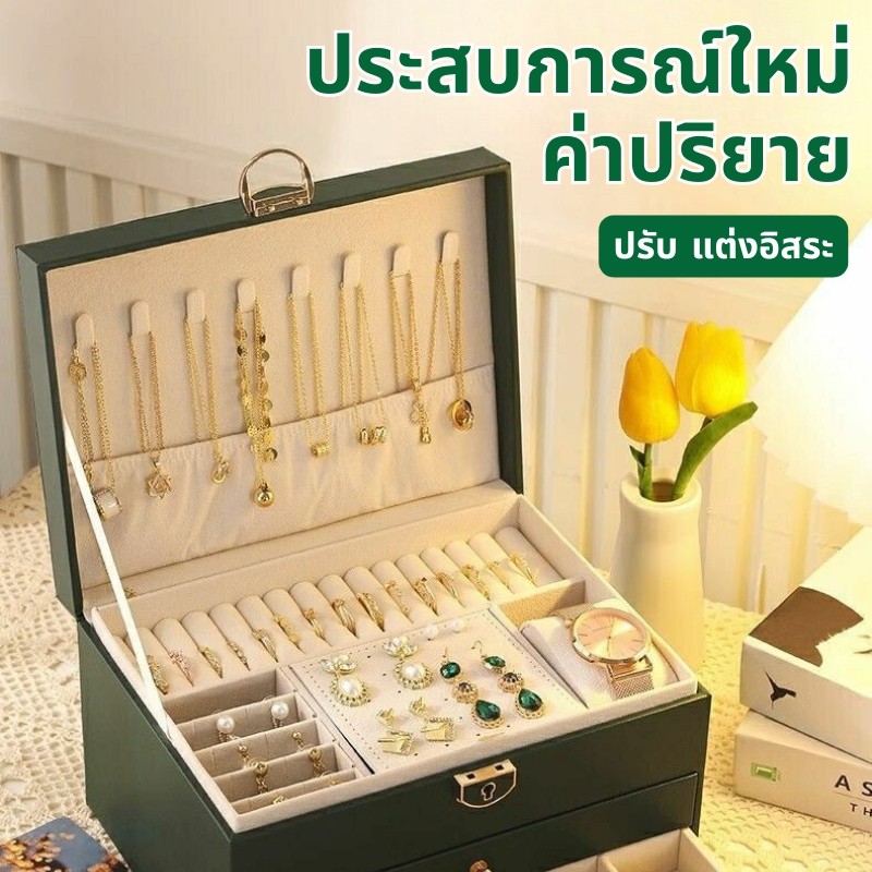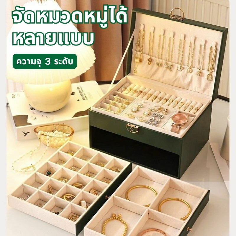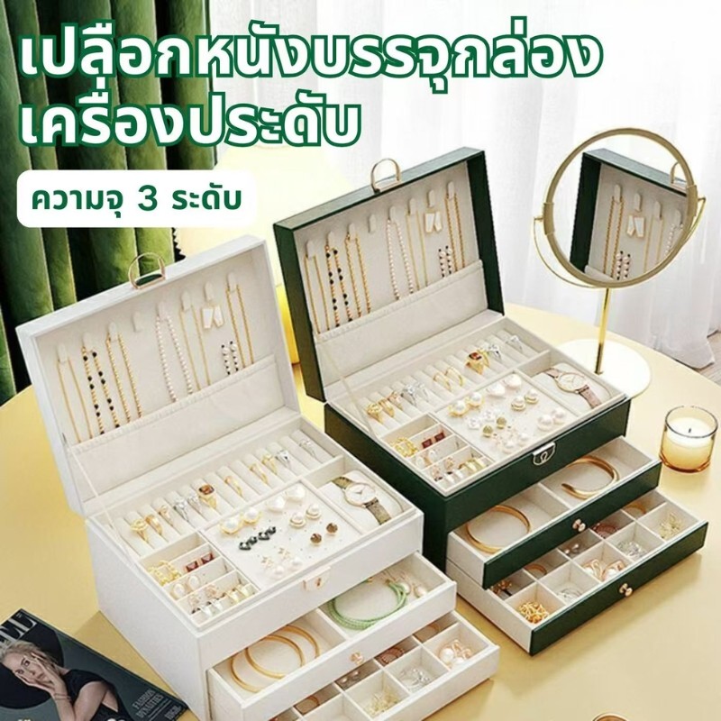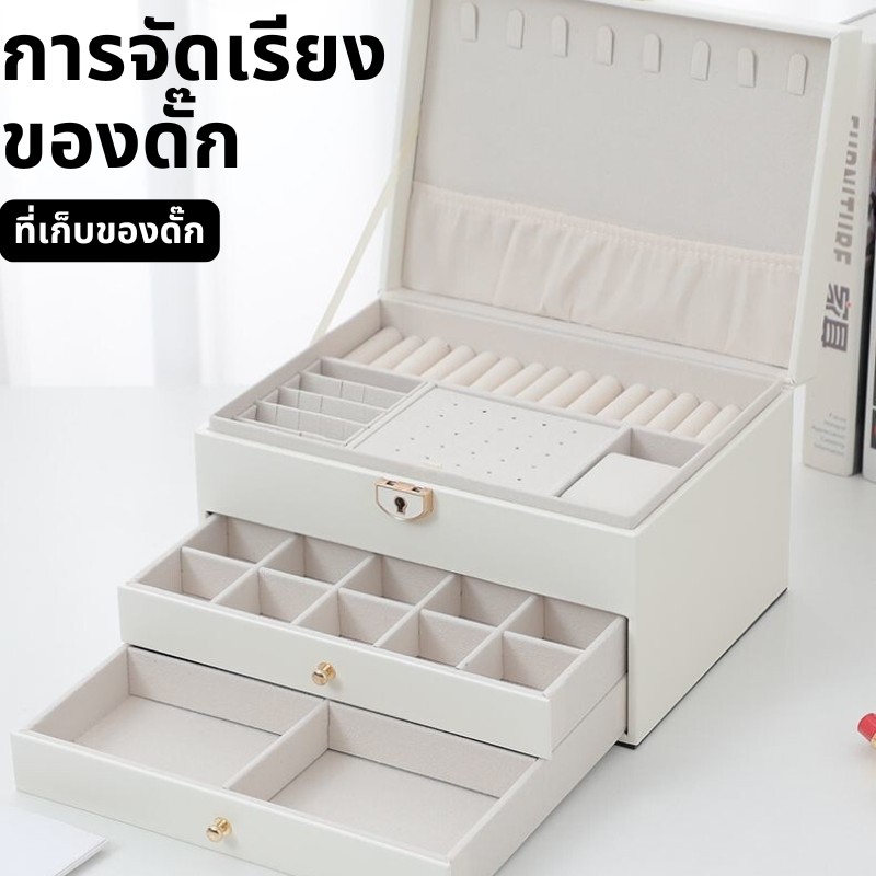 กล่องเก็บเครื่องประดับหนัง PU 3 ชั้นพร้อมกุญแจล็อคกล่องเก็บต่างหูกล่องเครื่องประดับความจุสูง