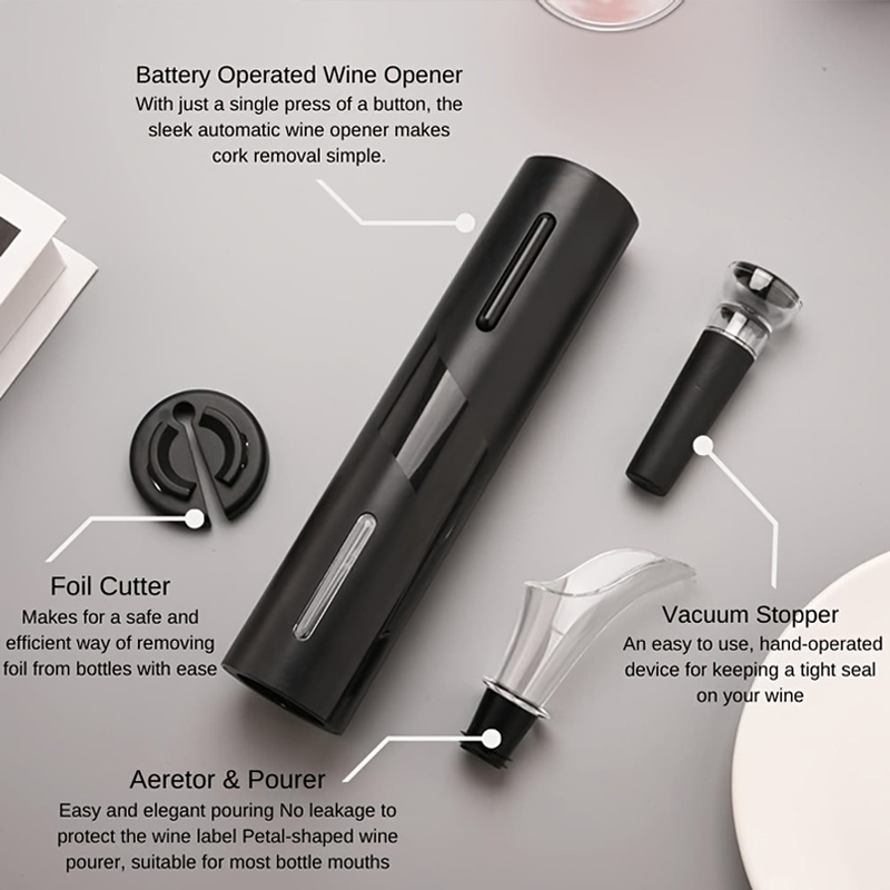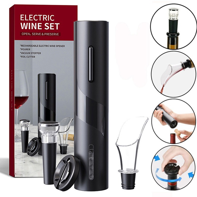 ชุดที่เปิดขวดไวน์ไฟฟ้า พร้อมอุปกรณ์เสริม – ที่ถอดสกรูอัตโนมัติ, ที่เปิดขวดไร้สาย, ที่รินไวน์, จุกสูญญากาศ, เครื่องตัดฟอย