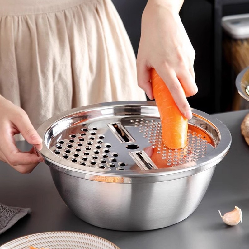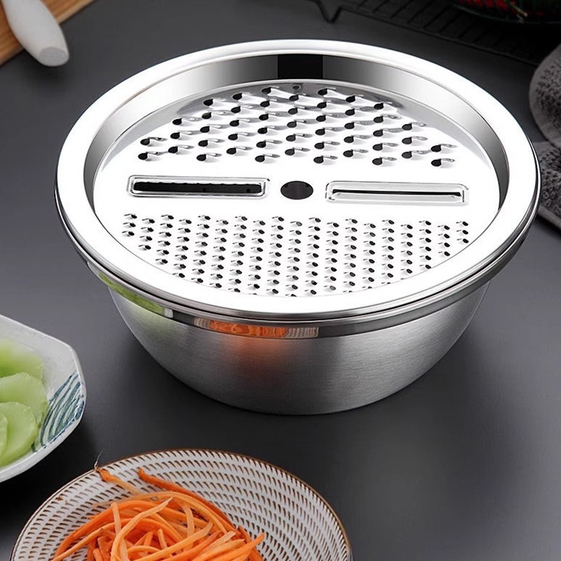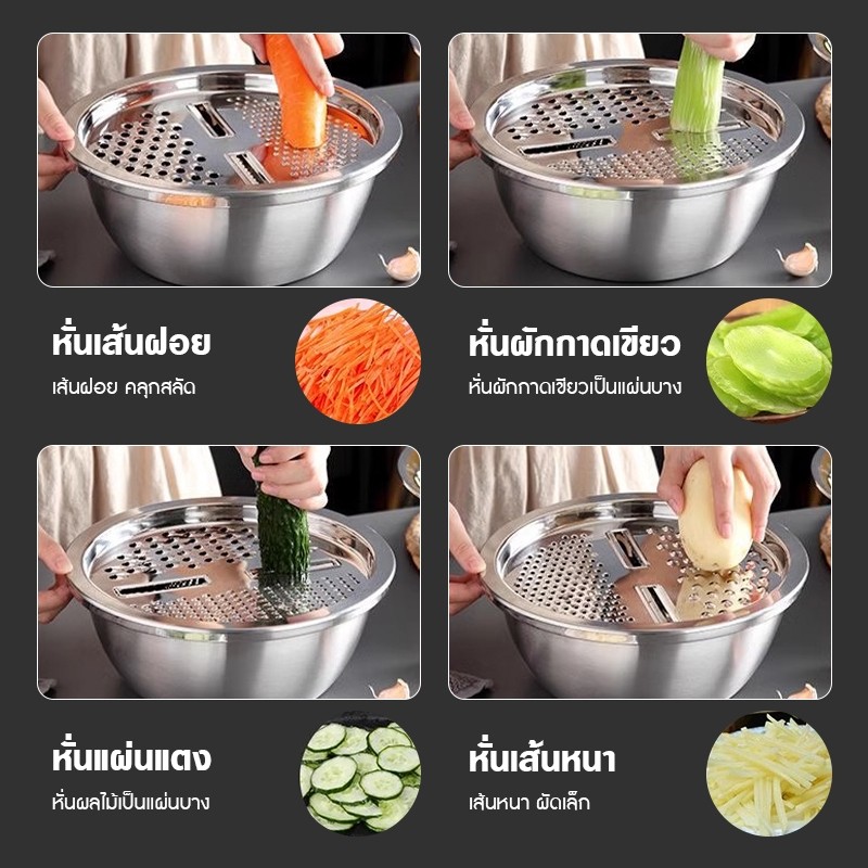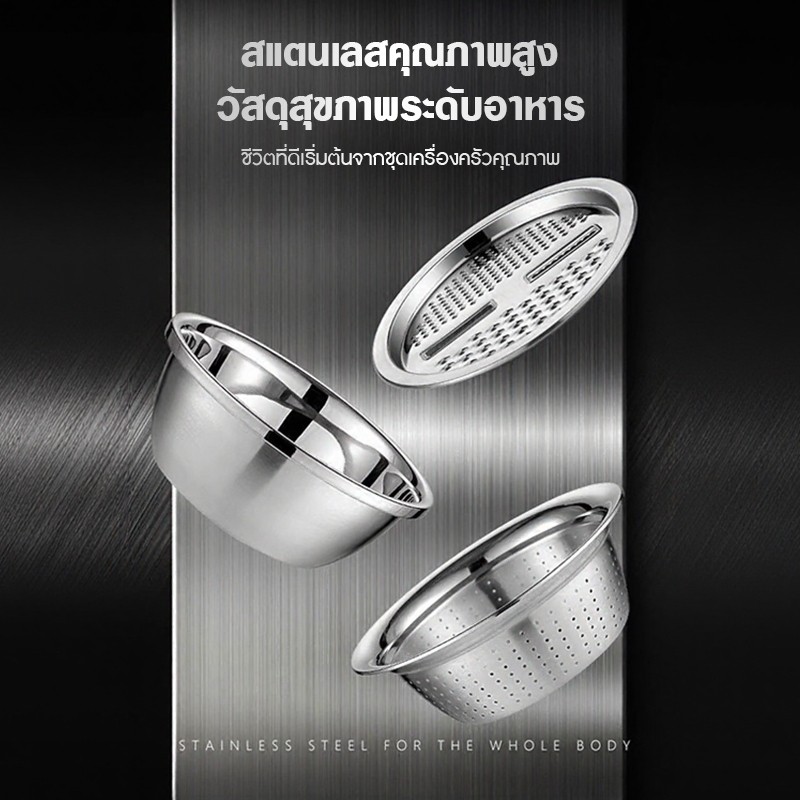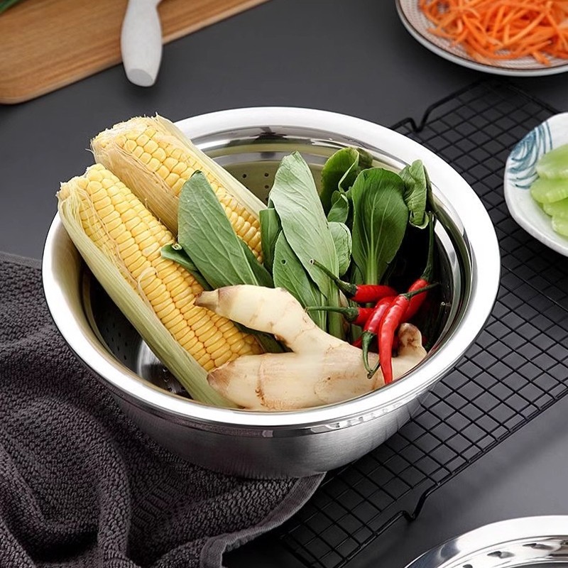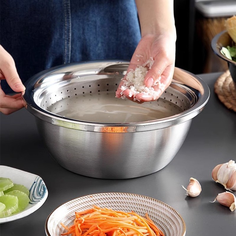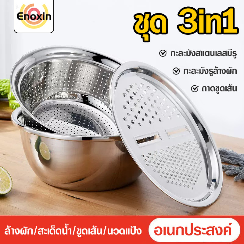 กะละมังล้างผัก ชุดกะละมัง 3in1 ถาดขูดเส้น กะละมังสแตนเลสมีรู กะละมังรูล้างผัก ล้างผัก/สะเด็ดน้ำ/ขูดเส้น/นวดแป้ง