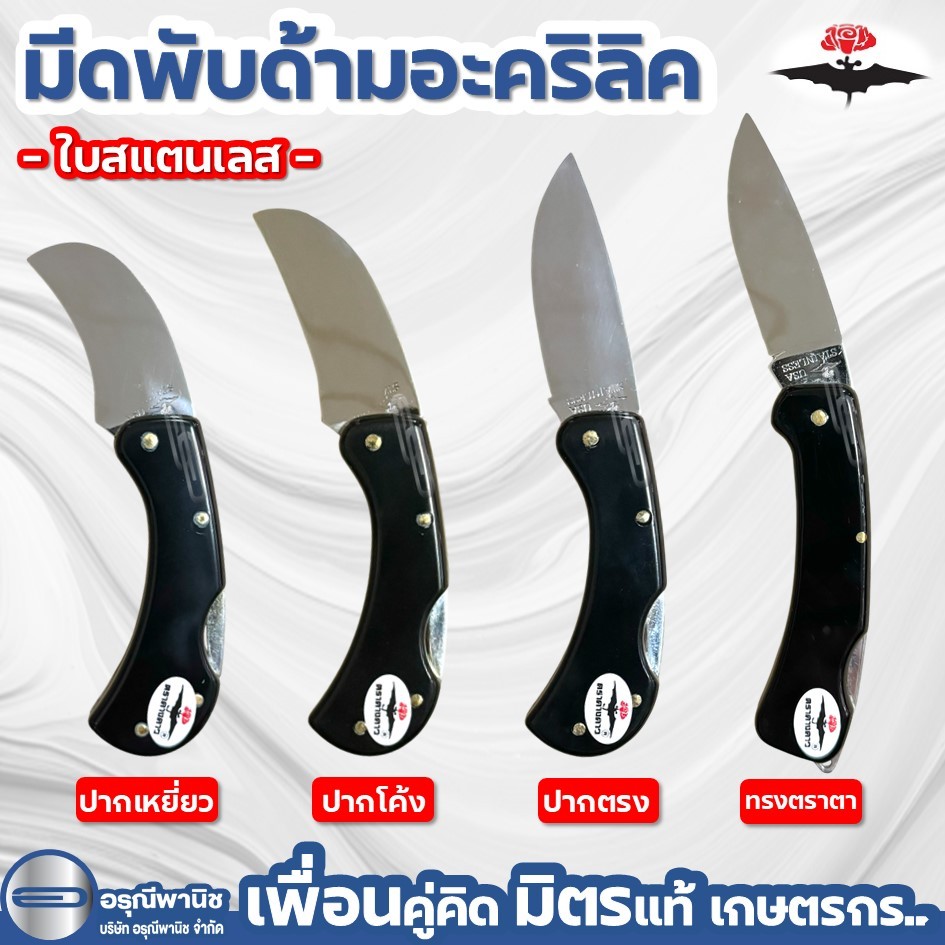 มีดตัดทุเรียน ด้ามอะคริลิค สีดำ ตราค้างคาว ใบสแตนเลส ใบus มีดพับตัดทุเรียน มีดตัดเรียน
