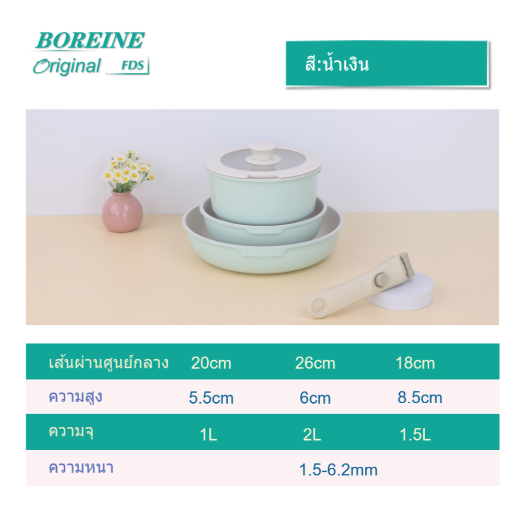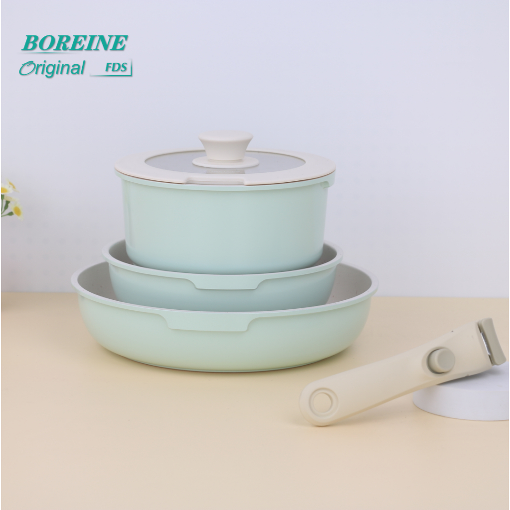 Boreine ที่ถอดออกได้ Handle Series สีฟ้า Nonstick เซรามิค Rock ชุดเครื่องครัว 5 ชิ้นไม่มี PFAS & PTFE & PFOA Pan เหมาะสําหรับเตาทั้งหมด