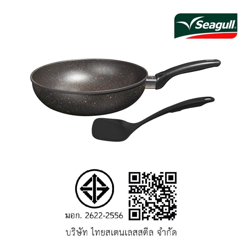 SEAGULL กระทะมาร์เบิ้ลทรงลึก ขนาด 28 ซม. +ตะหลิว เคลือบลายหินอ่อนแบบพิเศษ ใช้ได้กับทุกประเภทเตา