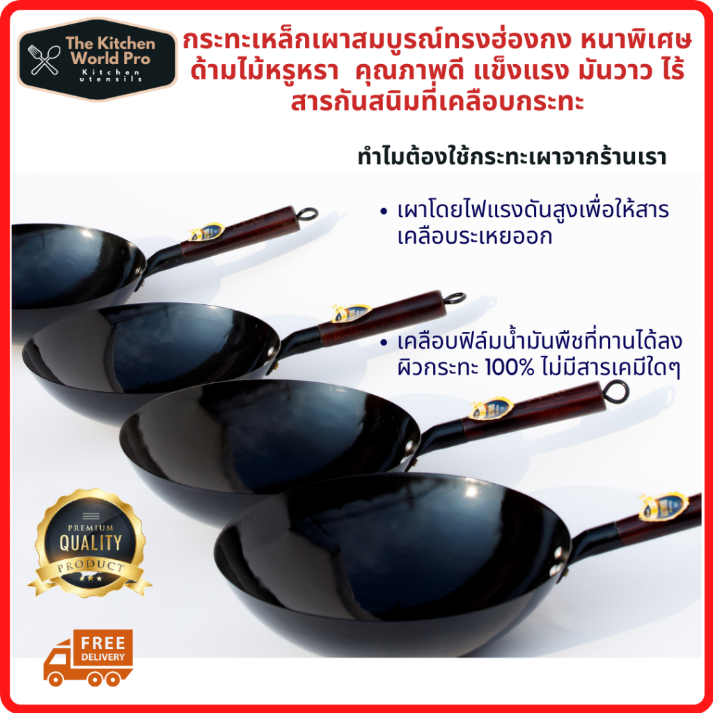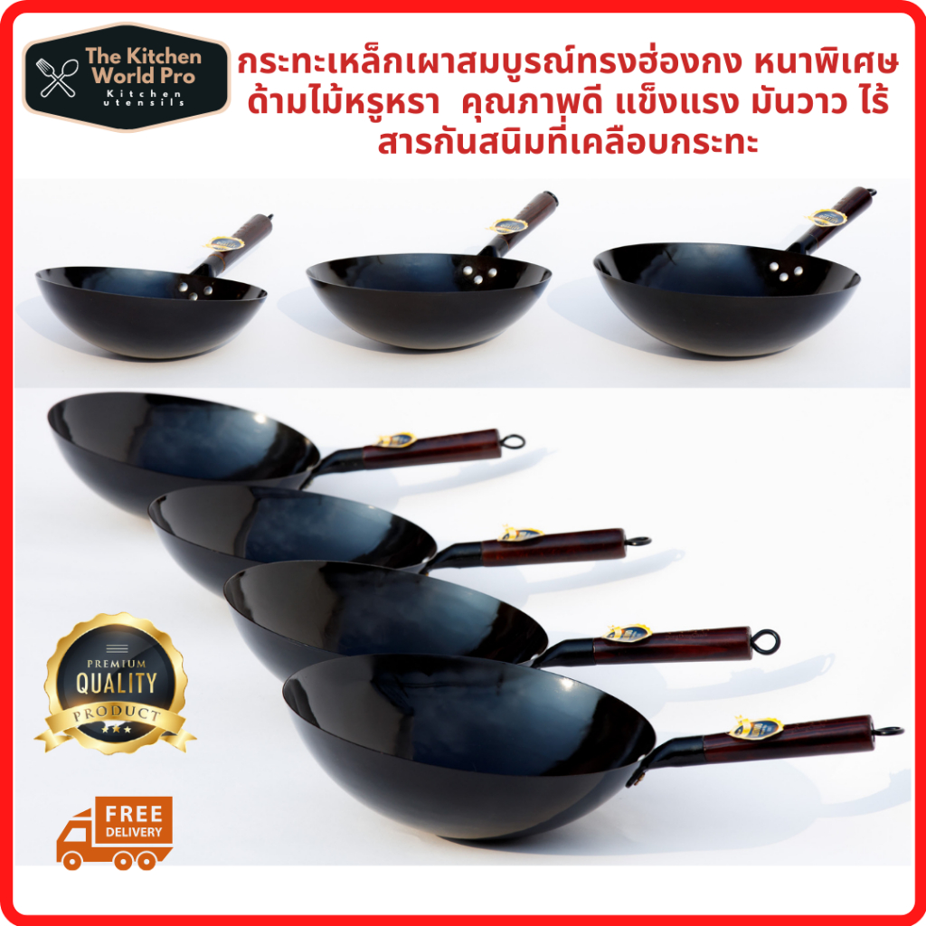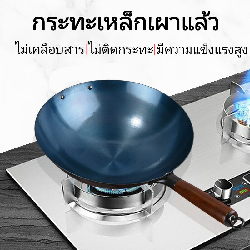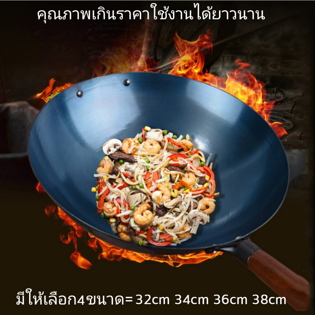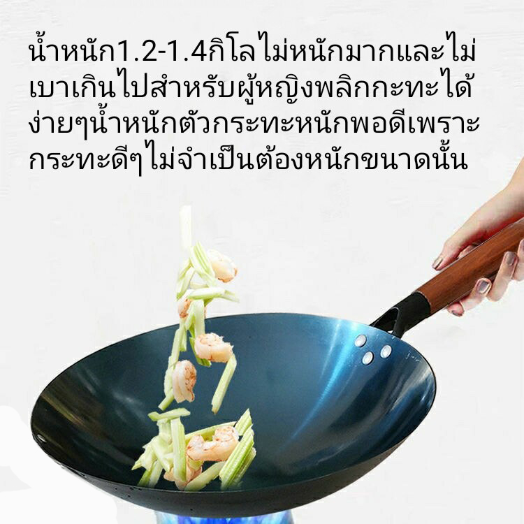 ส่งฟรี กระทะเหล็กแท้เผาสมบูรณ์ พร้อมใช้งาน ทรงฮ่องกงกว้าง 32ซม.หนาพิเศษด้ามไม้ กระทะจีน wokกระทะไฟแดงมีใบรับรองแถมกระบวย