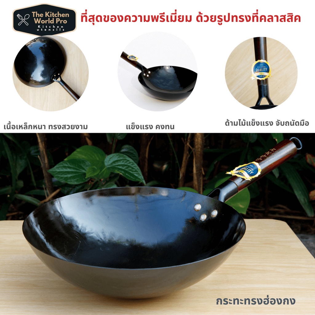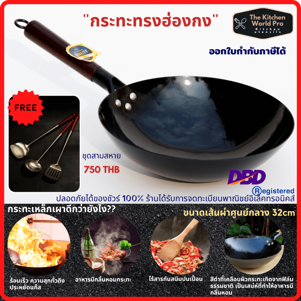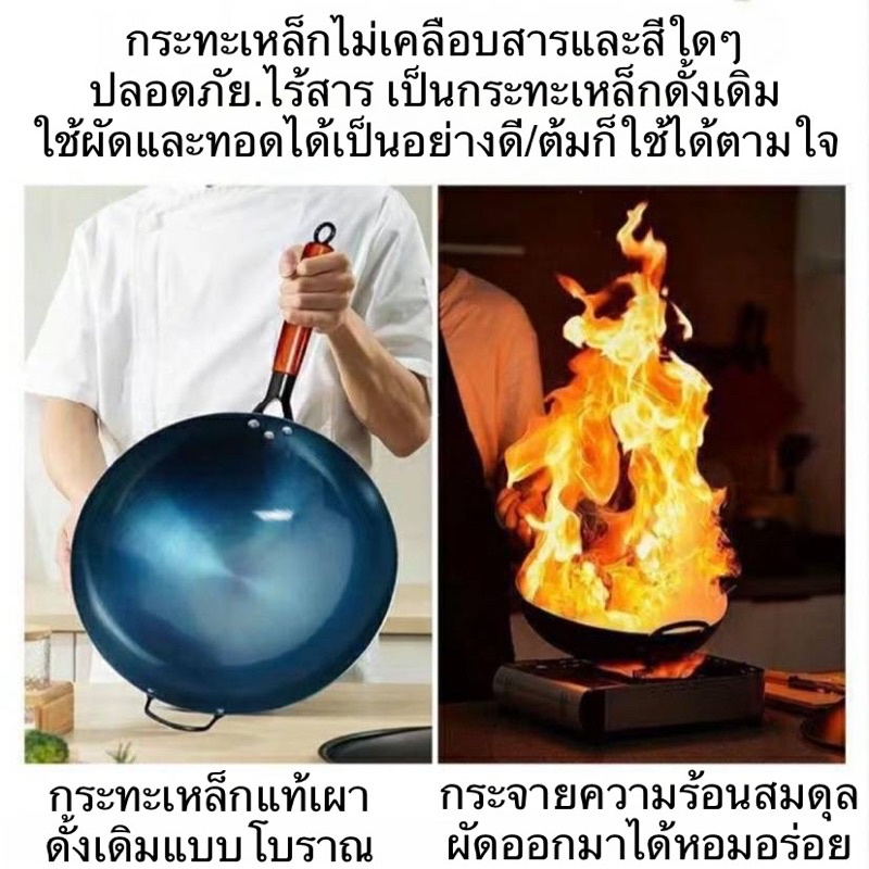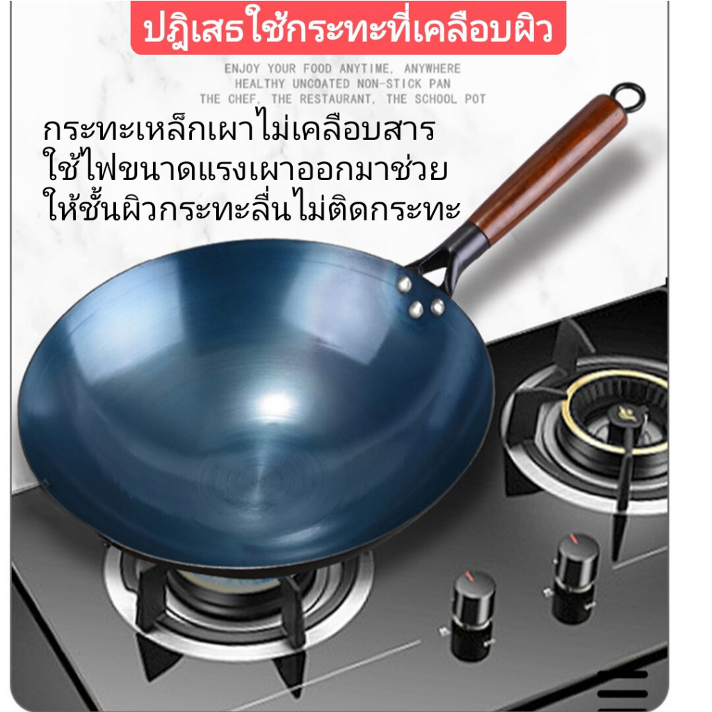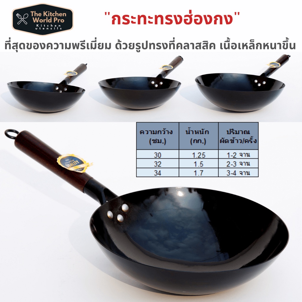 ส่งฟรี กระทะเหล็กแท้เผาสมบูรณ์ พร้อมใช้งาน ทรงฮ่องกงกว้าง 32ซม.หนาพิเศษด้ามไม้ กระทะจีน wokกระทะไฟแดงมีใบรับรองแถมกระบวย