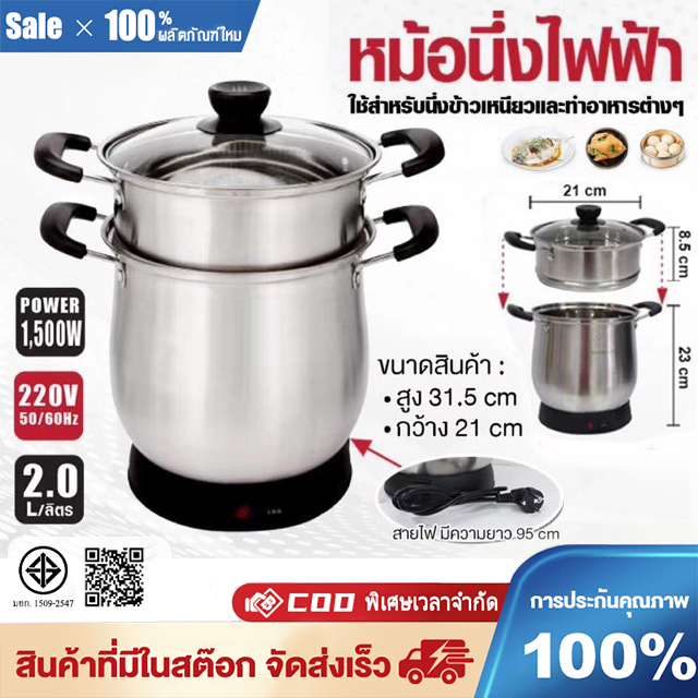 1500Wหม้อนึ่งข้าวเหนียวไฟฟ้า 2 ลิตร หม้อนึ่ง ใช้สแตนเลส 304 Steelคุณภาพดี ทนทานหม้อนึ่งไฟฟ้า หม้อขนาดใหญ่ ช่วยประหยัดเวล