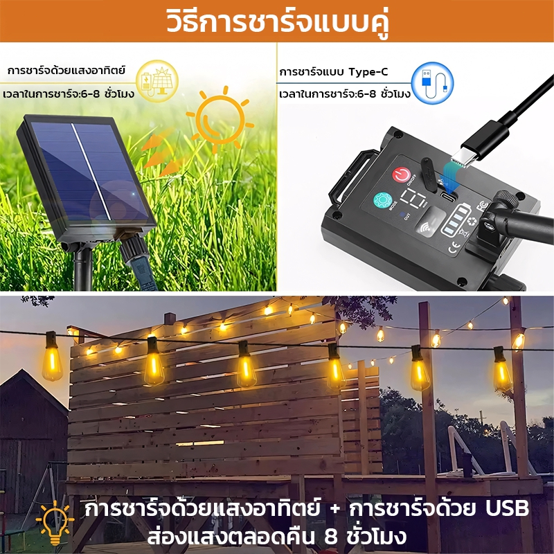 ไฟพลังงานแสงอาทิตย์ ไฟเซ็นเซอร์กลางแจ้ง ไฟคลิปตั้งแคมป์กันน้ำ ไฟสวนแบบพกพา