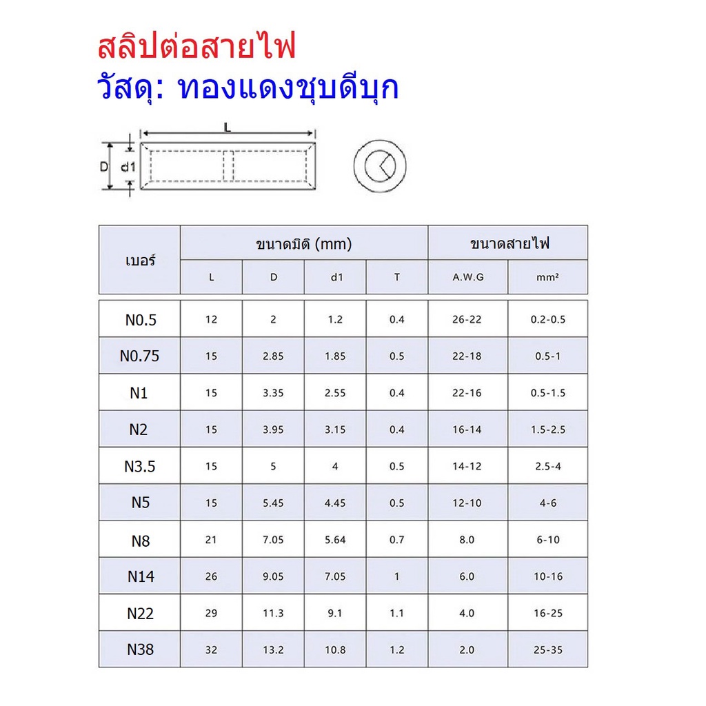 (5 ตัว) สลิป ตัวต่อ สายไฟ สลิปทองแดง สลิปเปลือย Copper Crimp Sleeve แบบย้ำต่อสายไฟ 0.2-6sqmm #สลิปเปลือย
