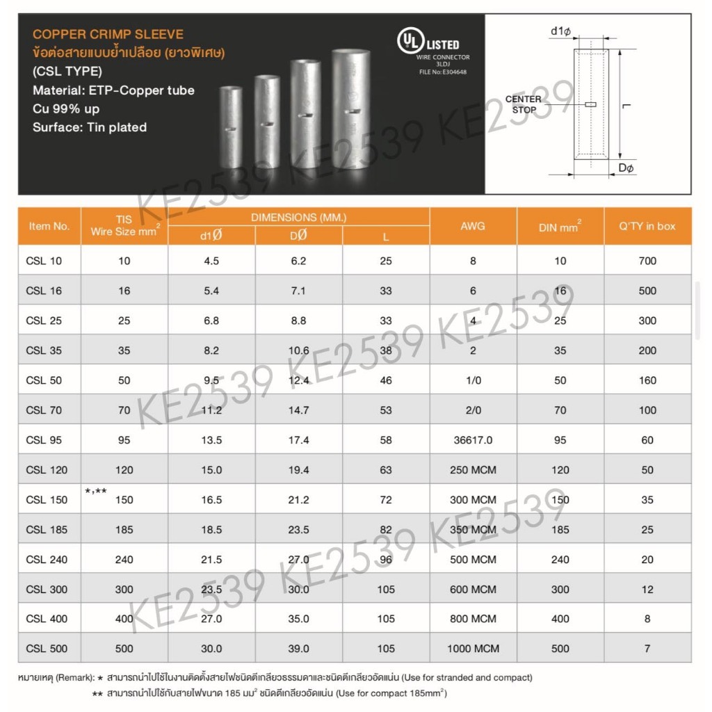 T-LUG สลิปต่อสาย เบอร์ 16 25 35 50 สลิปทองแดง สลิป Copper Crimp Sleeves CS ข้อต่อสายไฟแบบย้ำเปลือย
