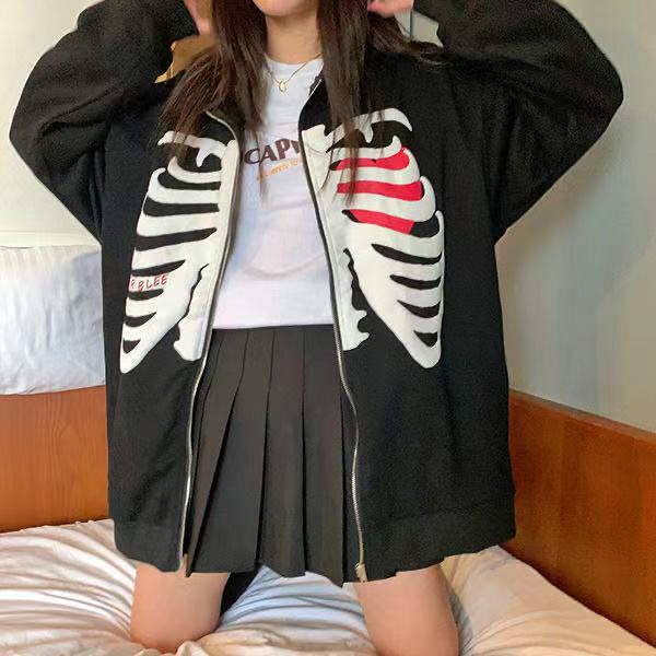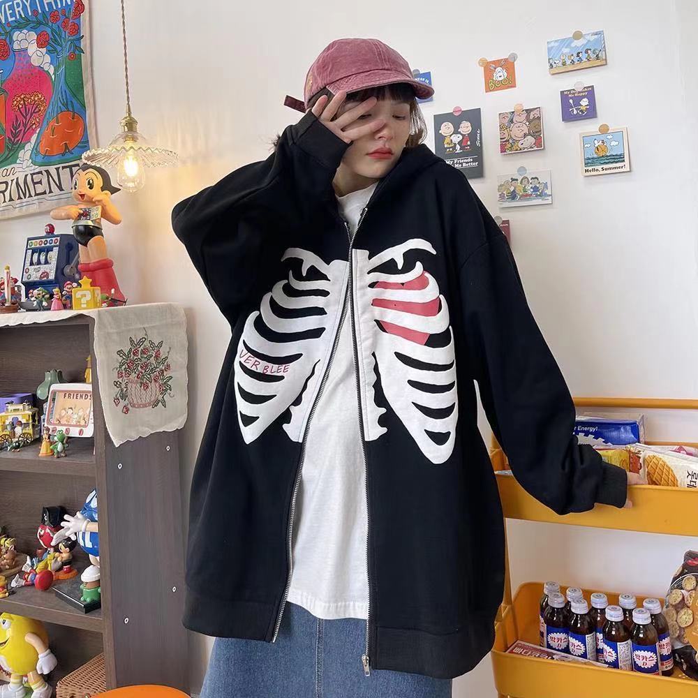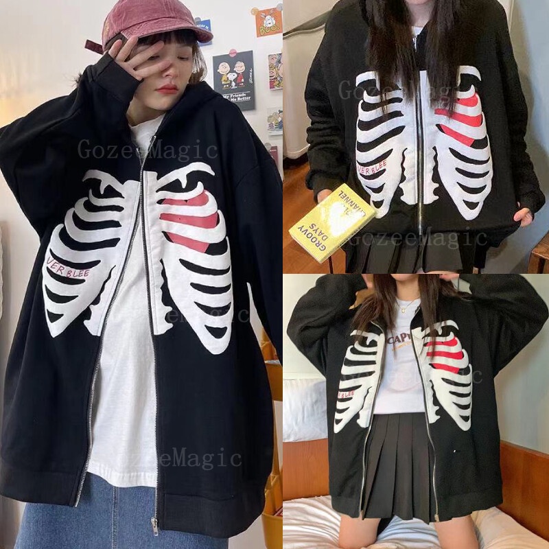 Y2k เสื้อกันหนาวแขนยาว มีฮู้ด ทรงหลวม พิมพ์ลายโครงกระดูก มีซิป โอเวอร์ไซซ์ สไตล์โกธิค สตรีท สําหรับผู้ชาย ผู้หญิง Y2K