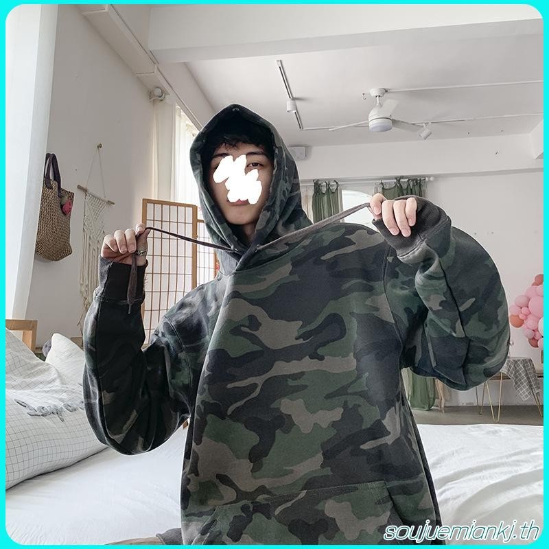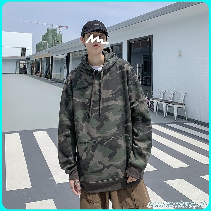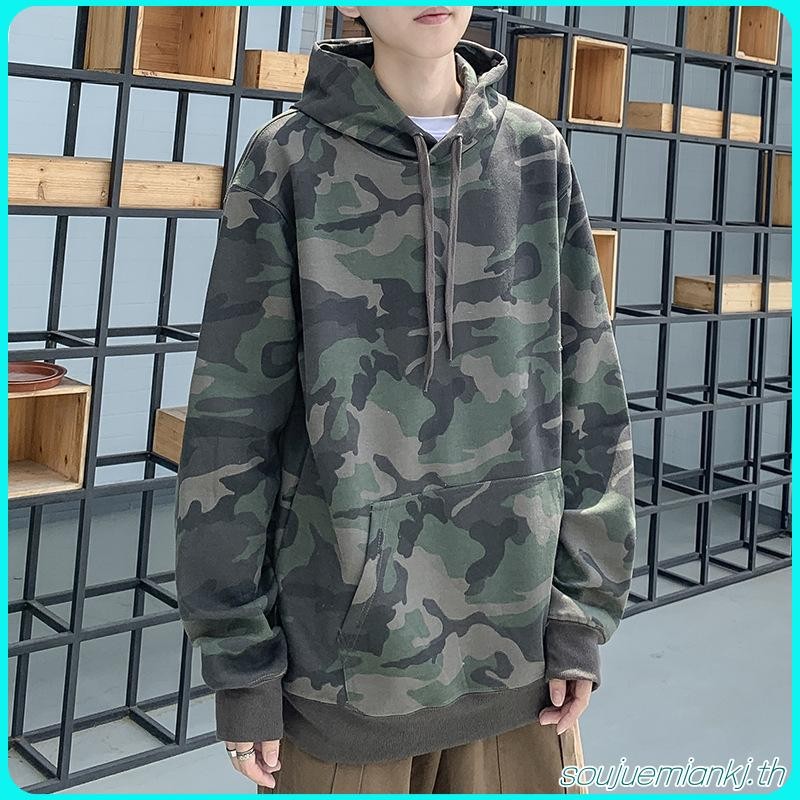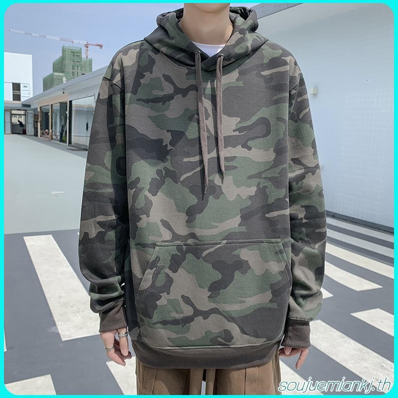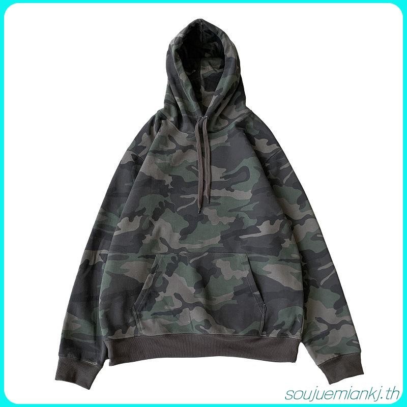 เสื้อกันหนาว มีฮู้ด ลายพราง สีเขียวทหาร ทรงหลวม ขนาดใหญ่ สําหรับผู้ชาย