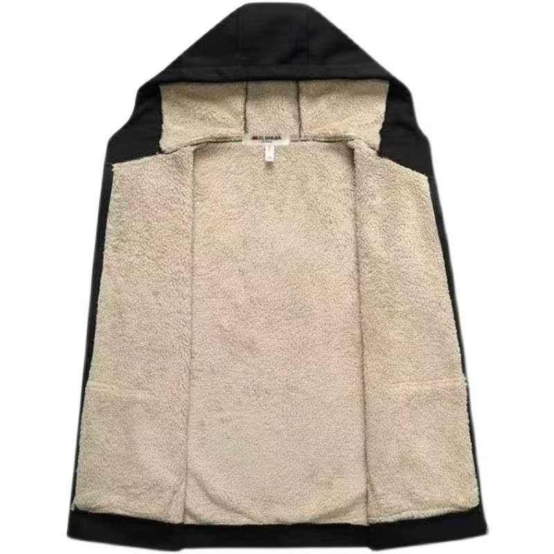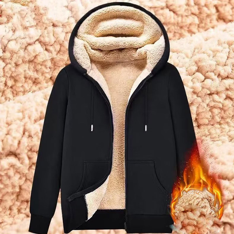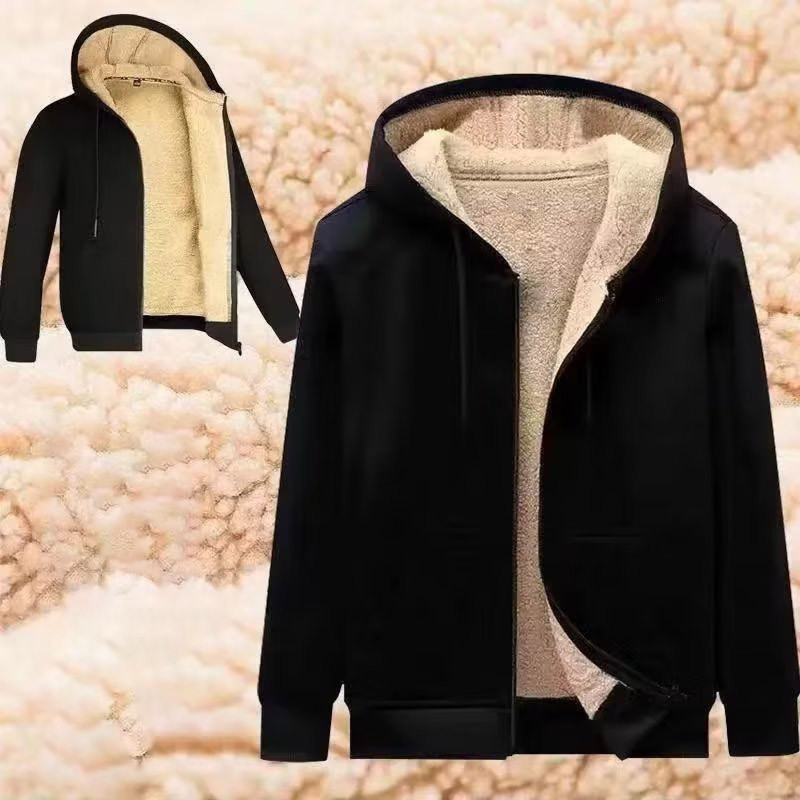 เสื้อกันหนาวมีฮู้ดหนาขนแกะแบบลําลองสําหรับผู้ชาย เสื้อแจ็คเก็ตกันหนาวผ้าวูลเนื้อแกะ