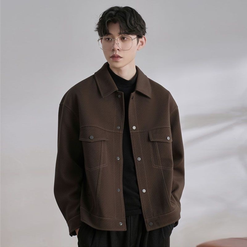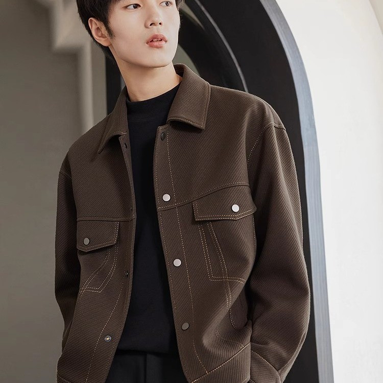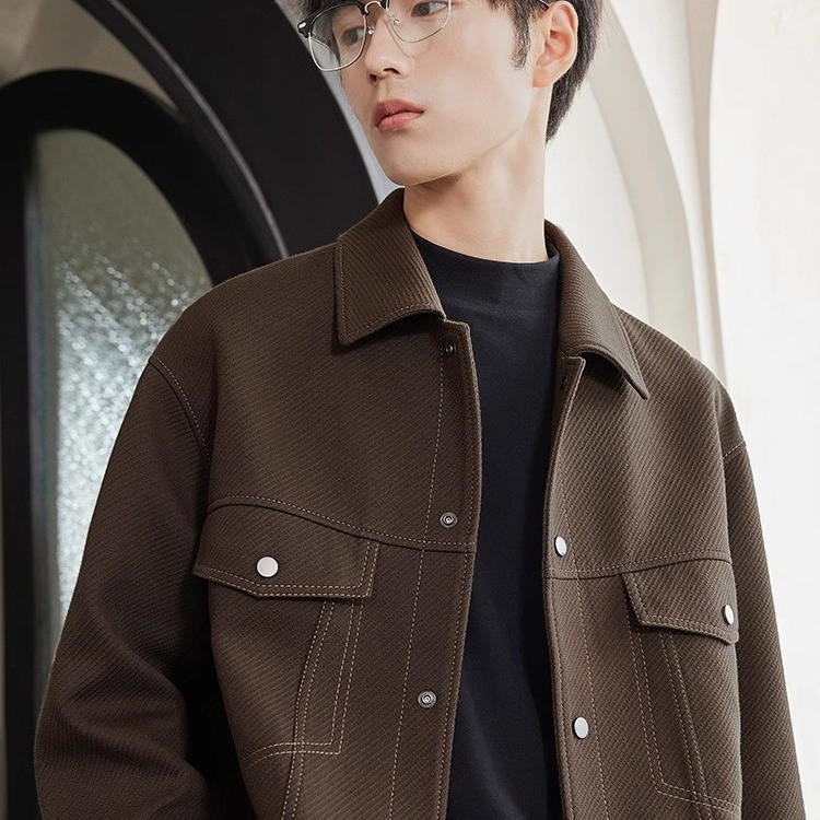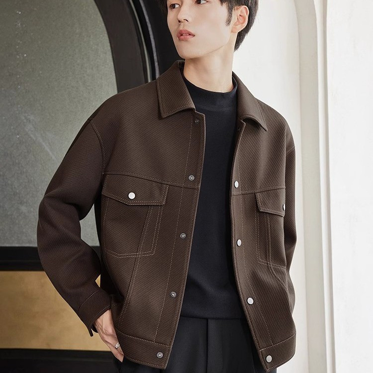 2025ใหม่ฤดูใบไม้ผลิผู้ชายสไตล์ฮ่องกงย้อนยุคปกสวมทนสีทึบแจ็คเก็ตคาร์ดิแกนหลวม jacket men กันหนาว
