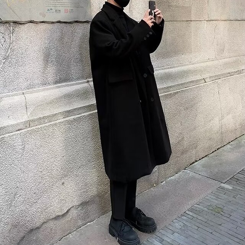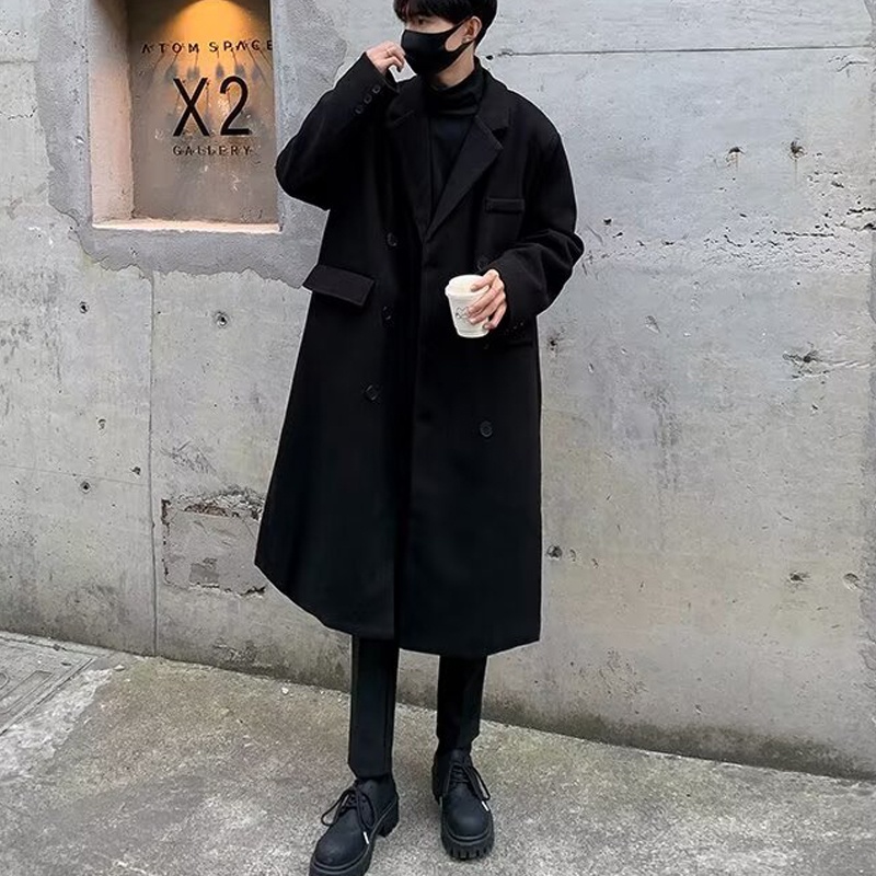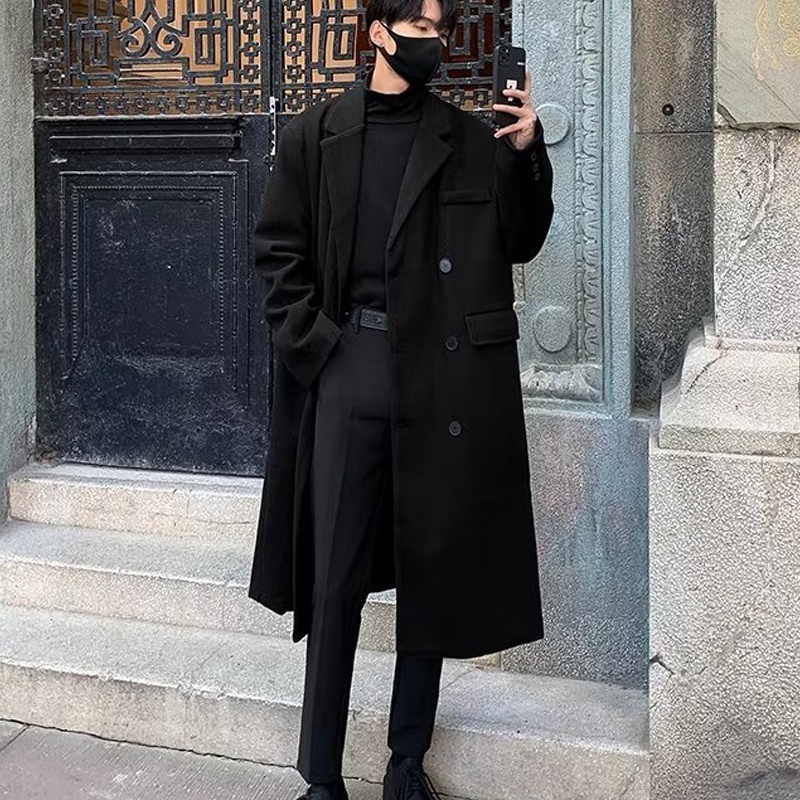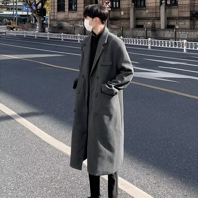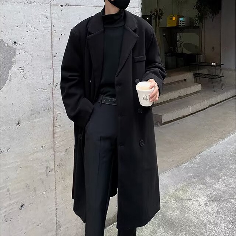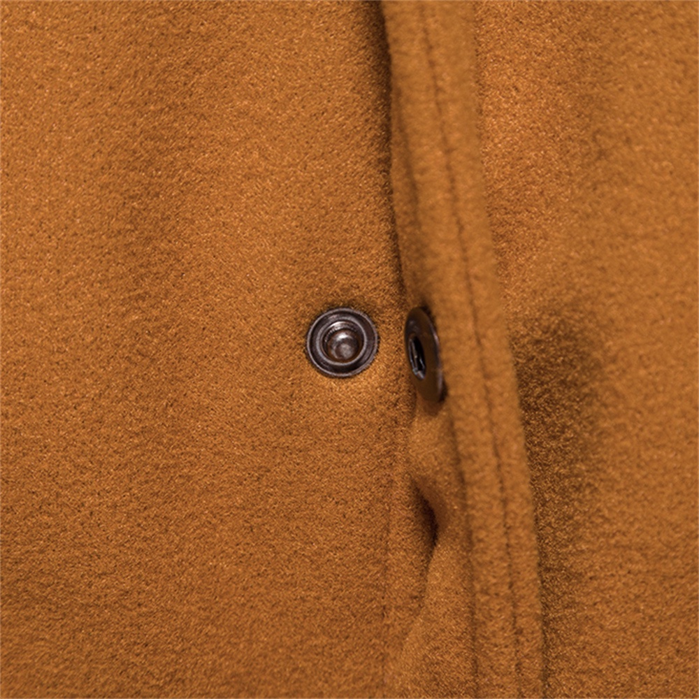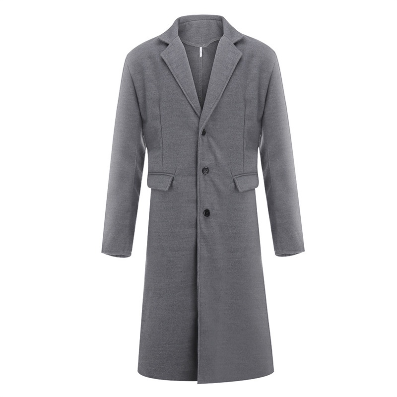 [AUS] Men Windbreaker Coat Lapel ปุ่มแขนยาว Placket Trench Coat พร้อมกระเป๋าสีทึบหลวมพอดีความยาวกลาง Outwear
