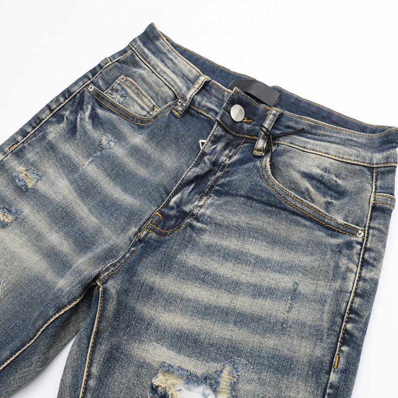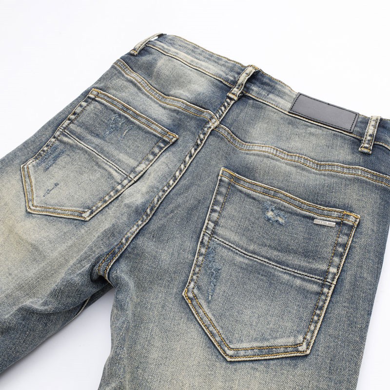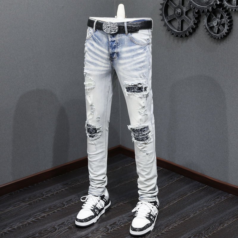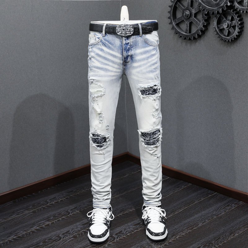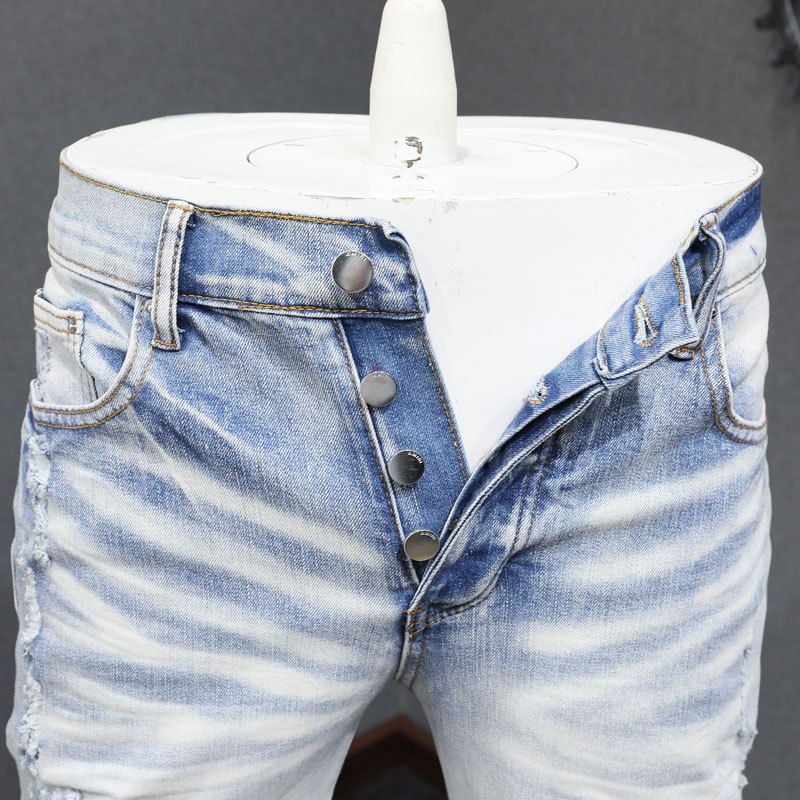 Amiri High Street แฟชั่นผู้ชายกางเกงยีนส์วินเทจแสงสีฟ้าพิมพ์แพทช์ออกแบบงานฝีมือผู้ชายปุ่มกางเกงยีนส์