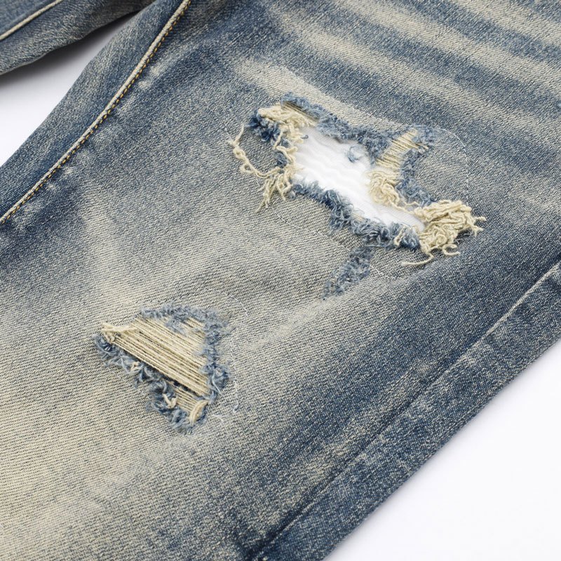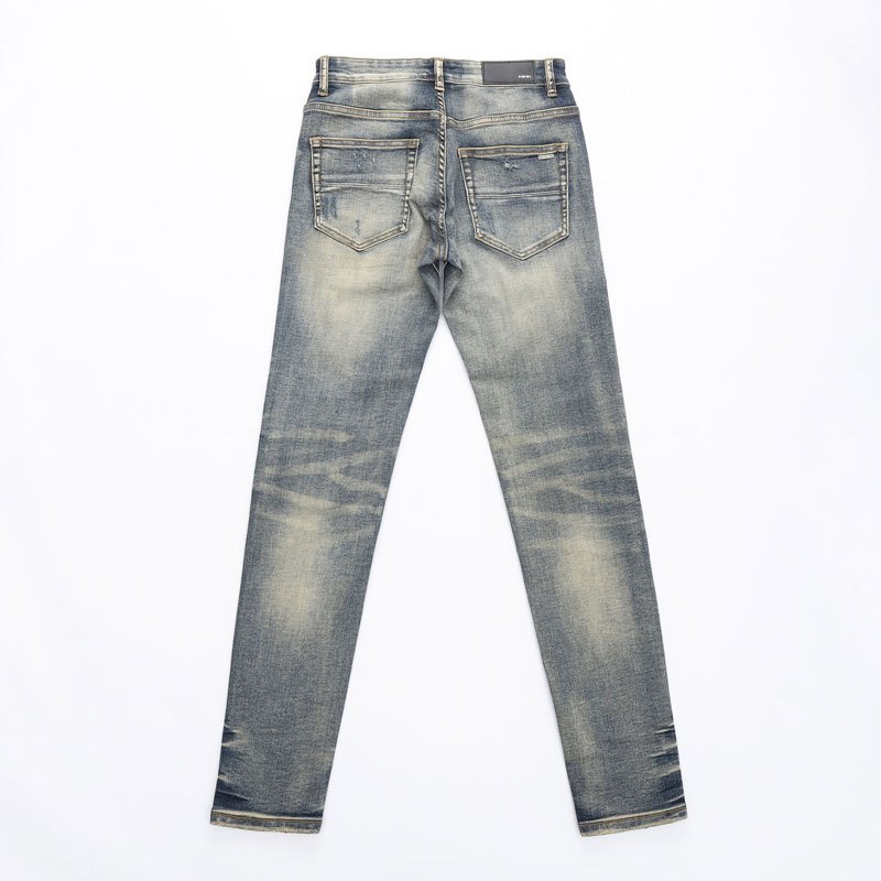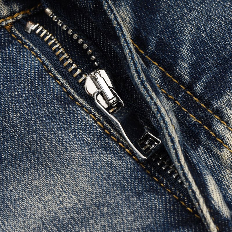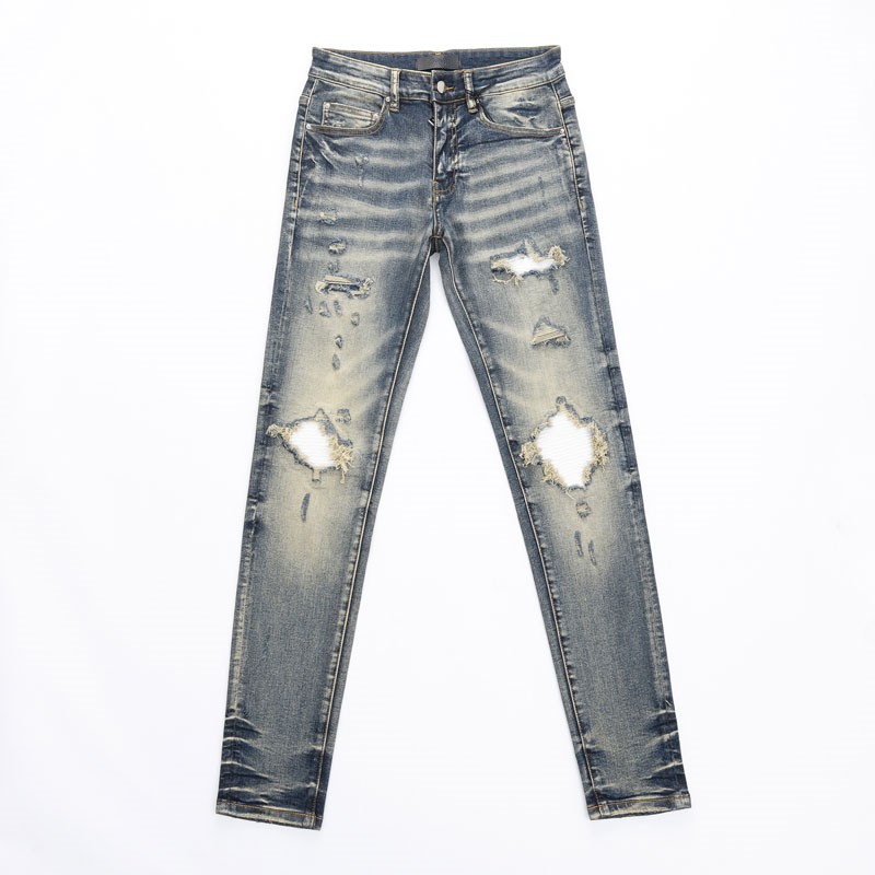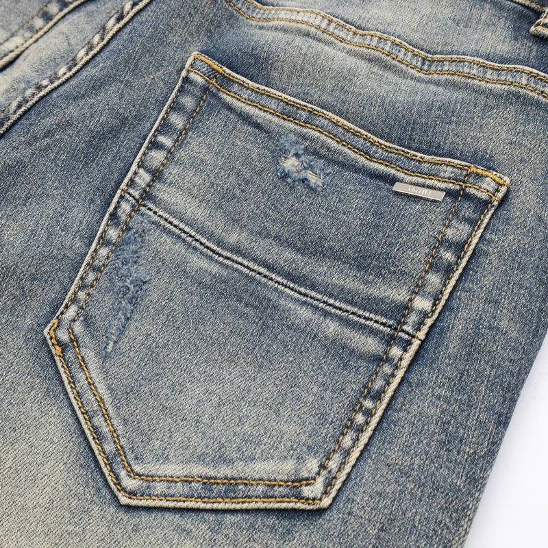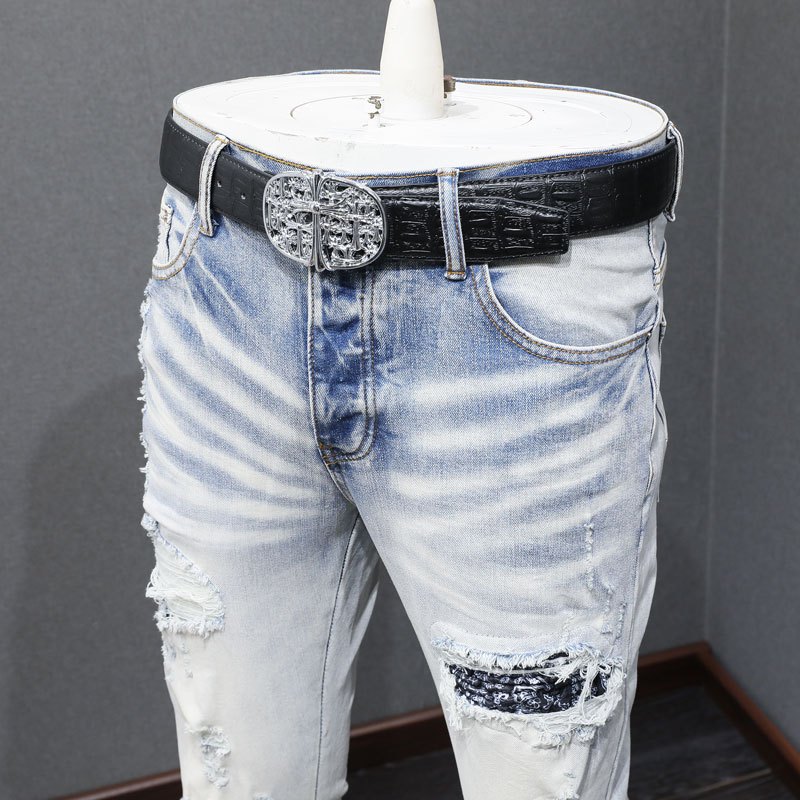 Amiri High Street แฟชั่นผู้ชายกางเกงยีนส์วินเทจแสงสีฟ้าพิมพ์แพทช์ออกแบบงานฝีมือผู้ชายปุ่มกางเกงยีนส์