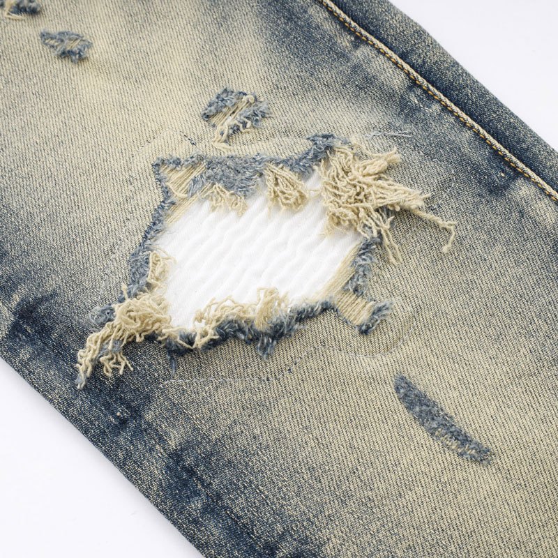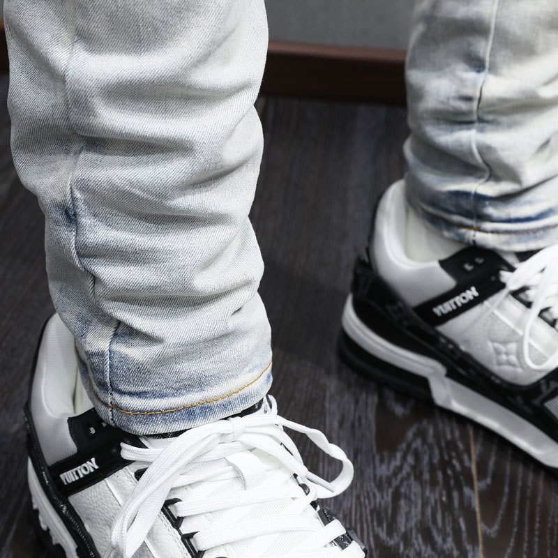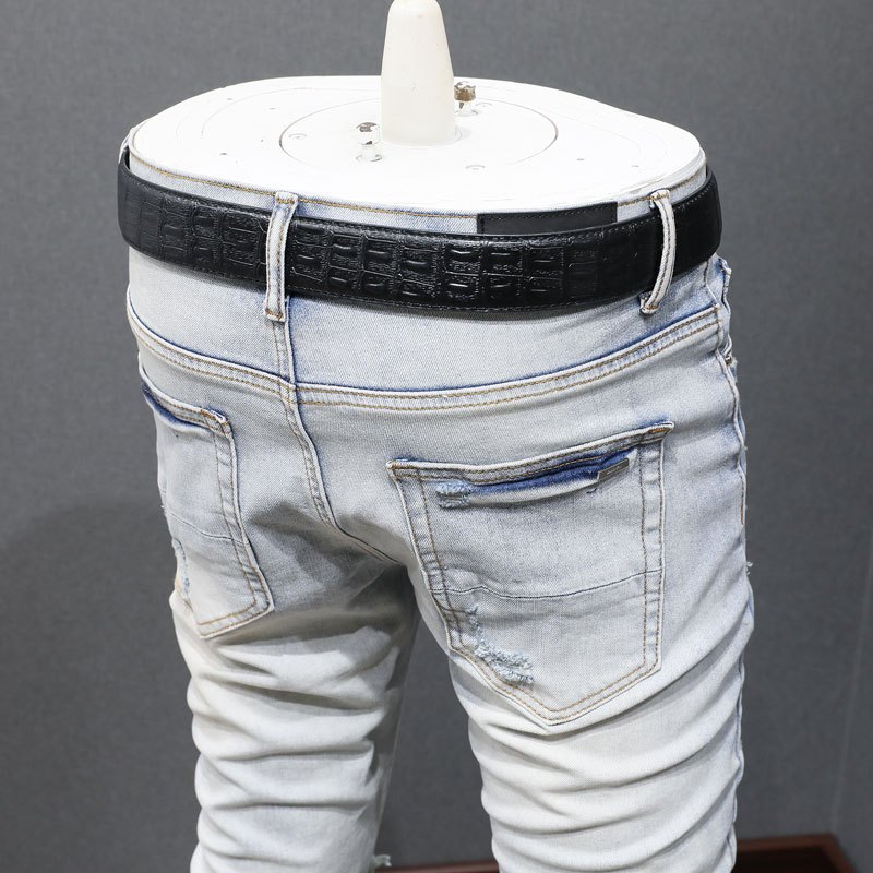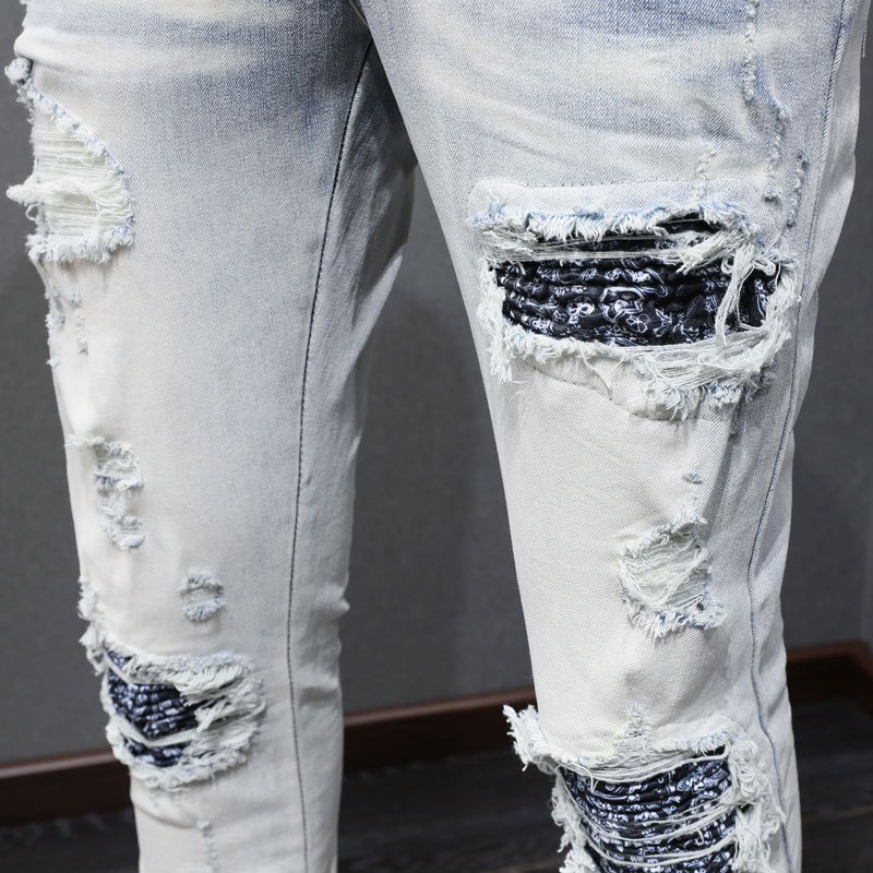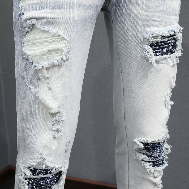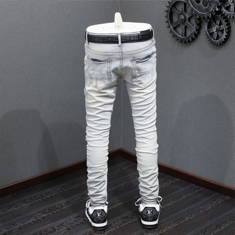 Amiri High Street แฟชั่นใหม่กางเกงยีนส์ผู้ชายผอมสีขาวหนังแพทช์ออกแบบงานฝีมือที่มีคุณภาพสูงผู้ชายกางเกงยีนส์ฮิปฮอป