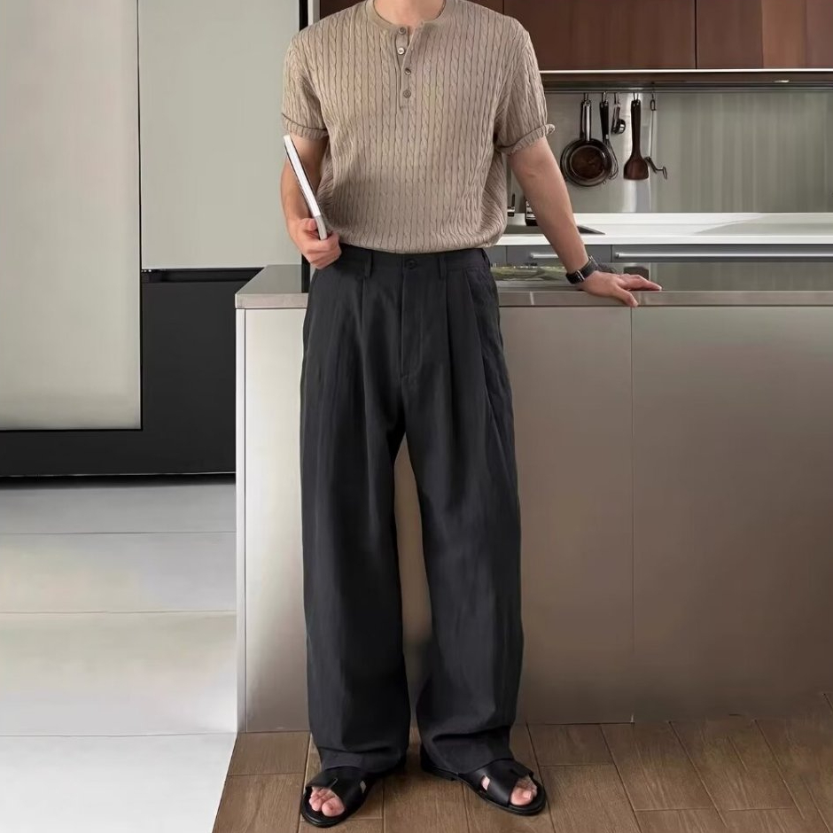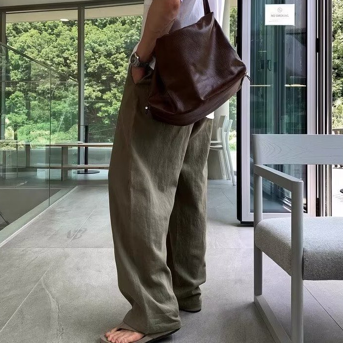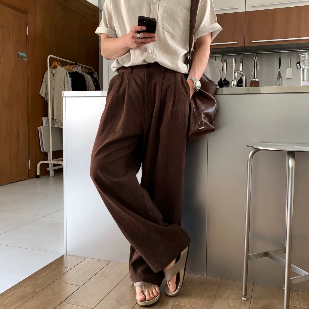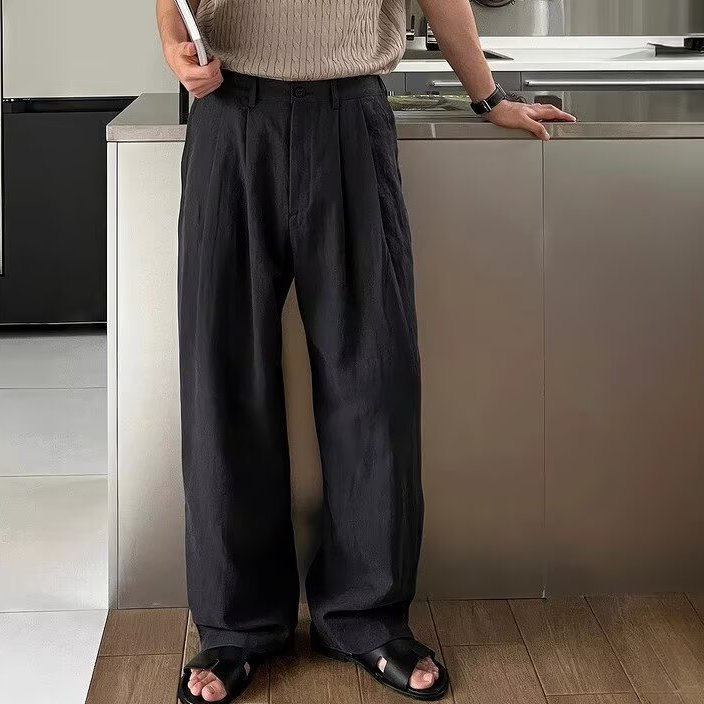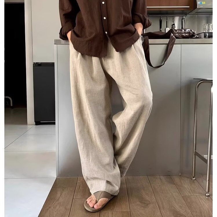 กางเกงขายาวผู้ชายสไตล์เกาหลี ทำจากผ้าลินินระบายอากาศได้ดี สีกากีและดำ ทรงขาบาน เหมาะสำหรับฤดูร้อน
