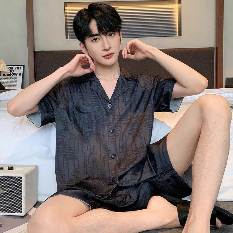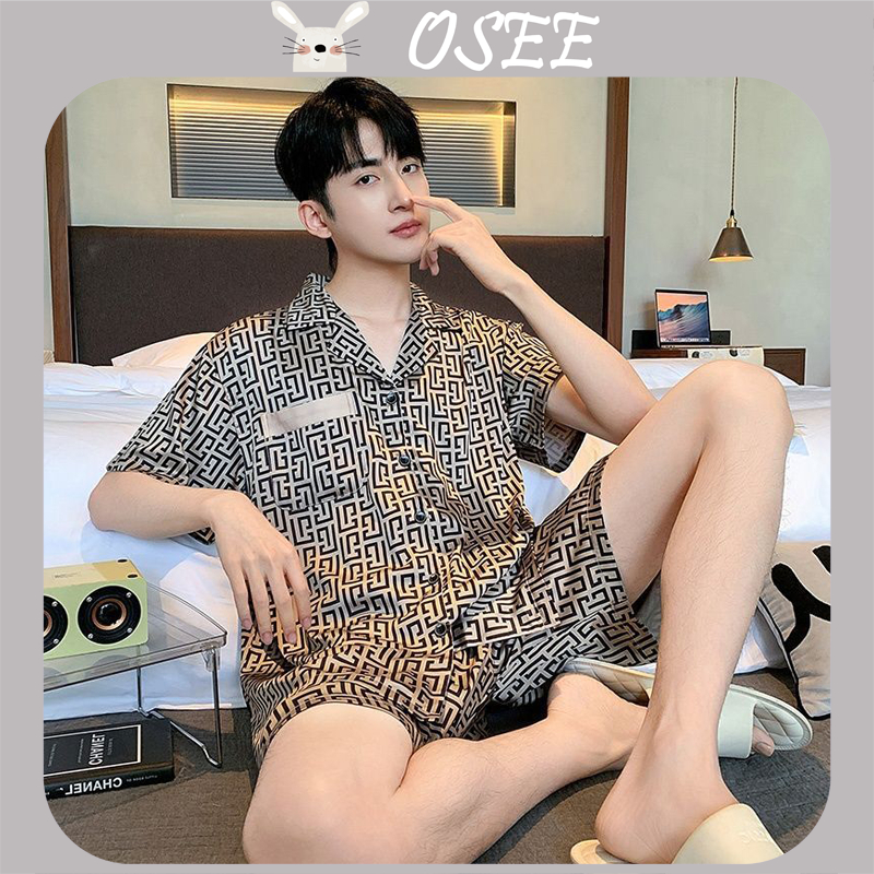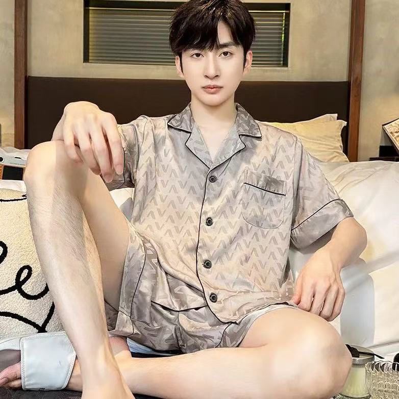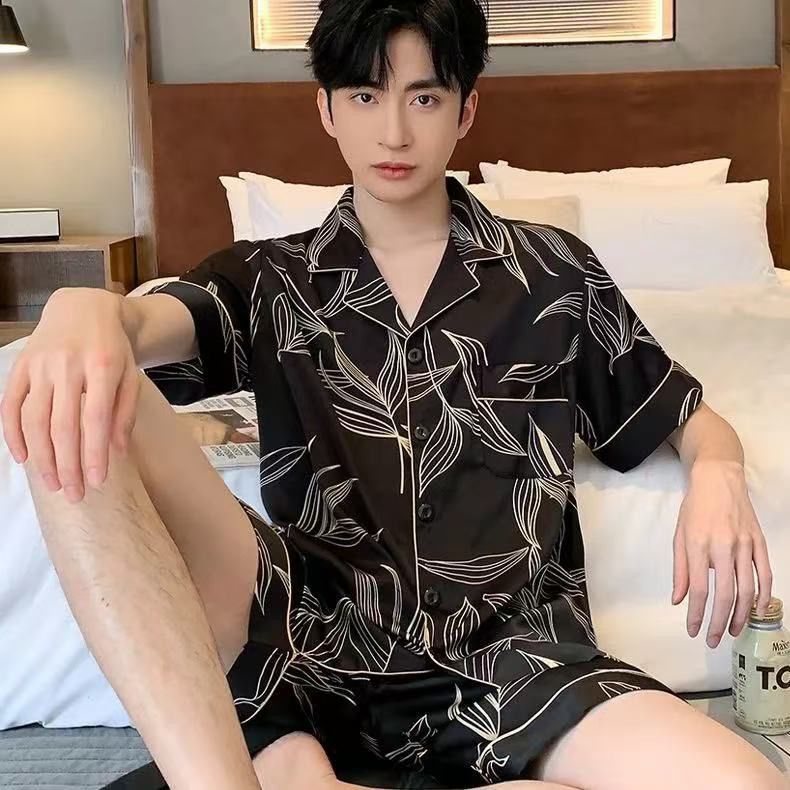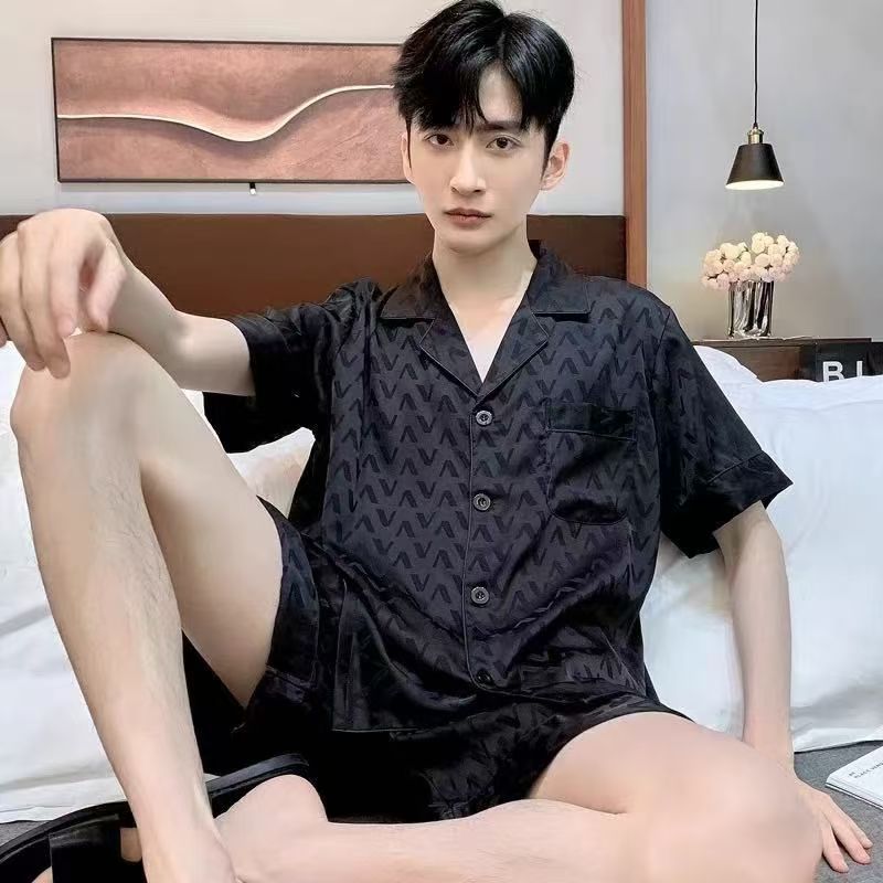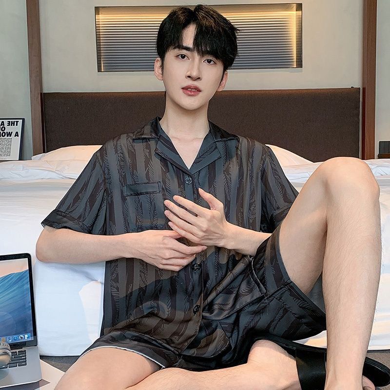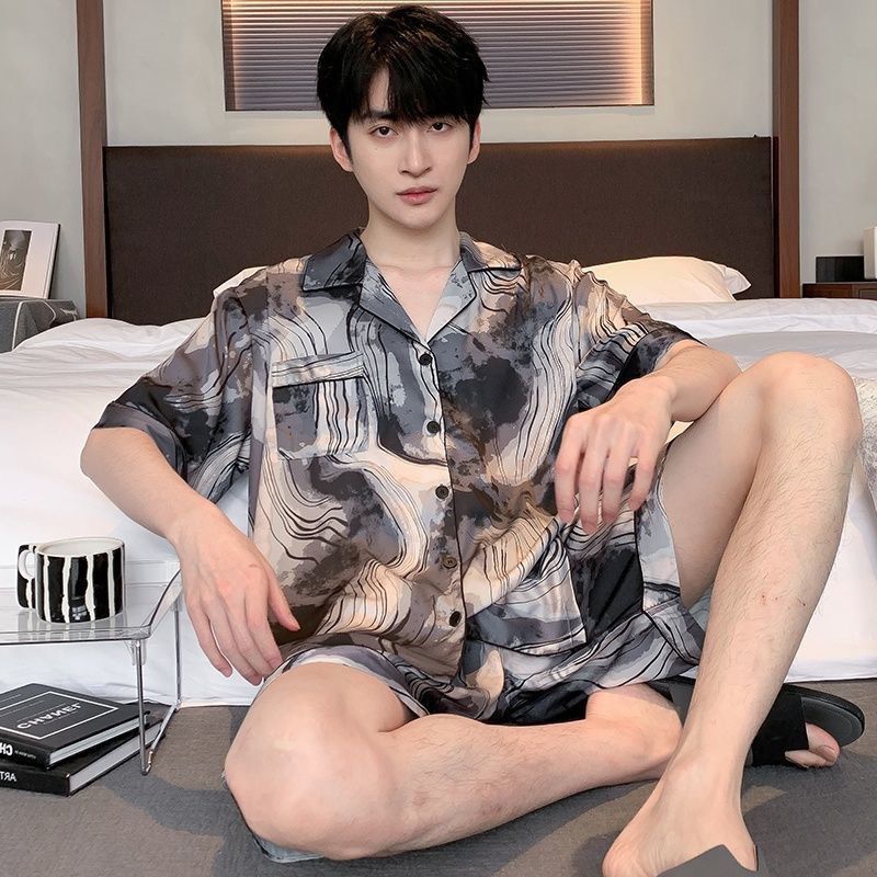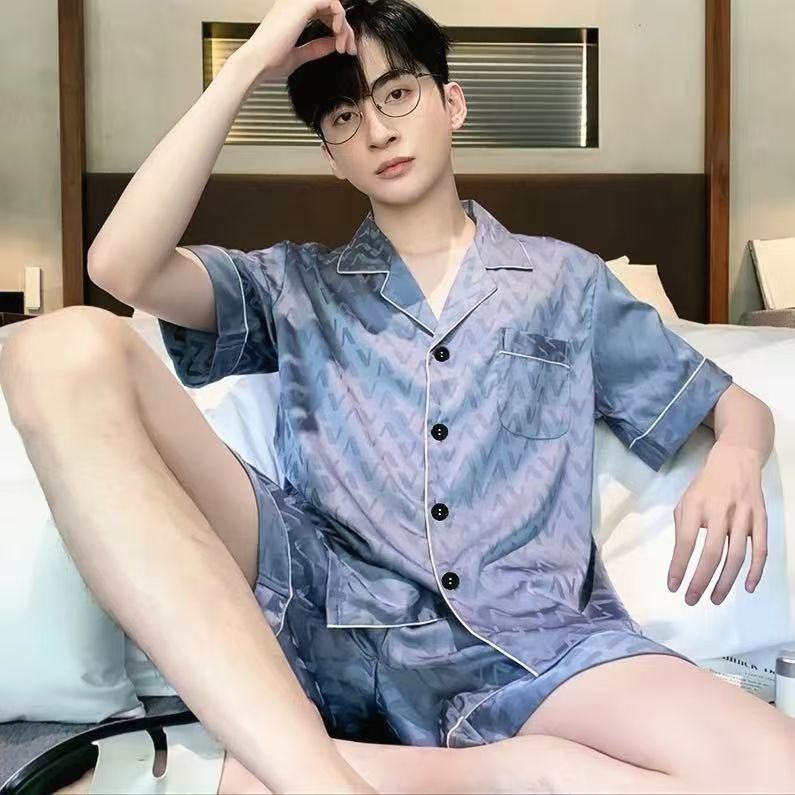 [โอเซ่] 40-100กก.ผ้าไหมน้ําแข็งชุดนอนผู้ชายปกพิมพ์กางเกงขาสั้นแขนสั้นผ้าไหมบางฤดูร้อนนักเรียนเยาวชนชุดบ้านสูทขนาดบวกผู้ชายอ้วนบ้านผ้า