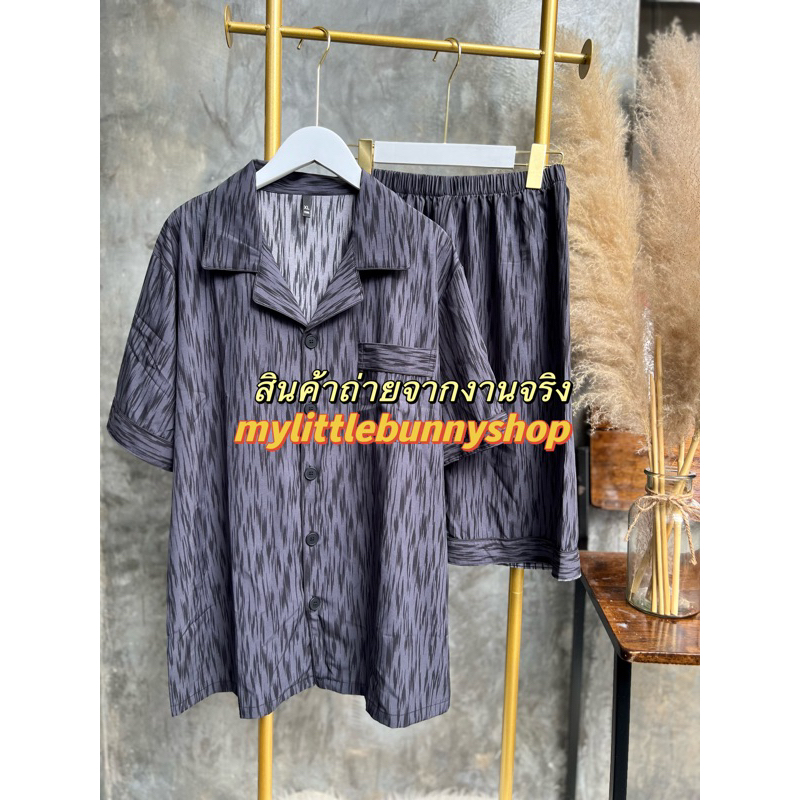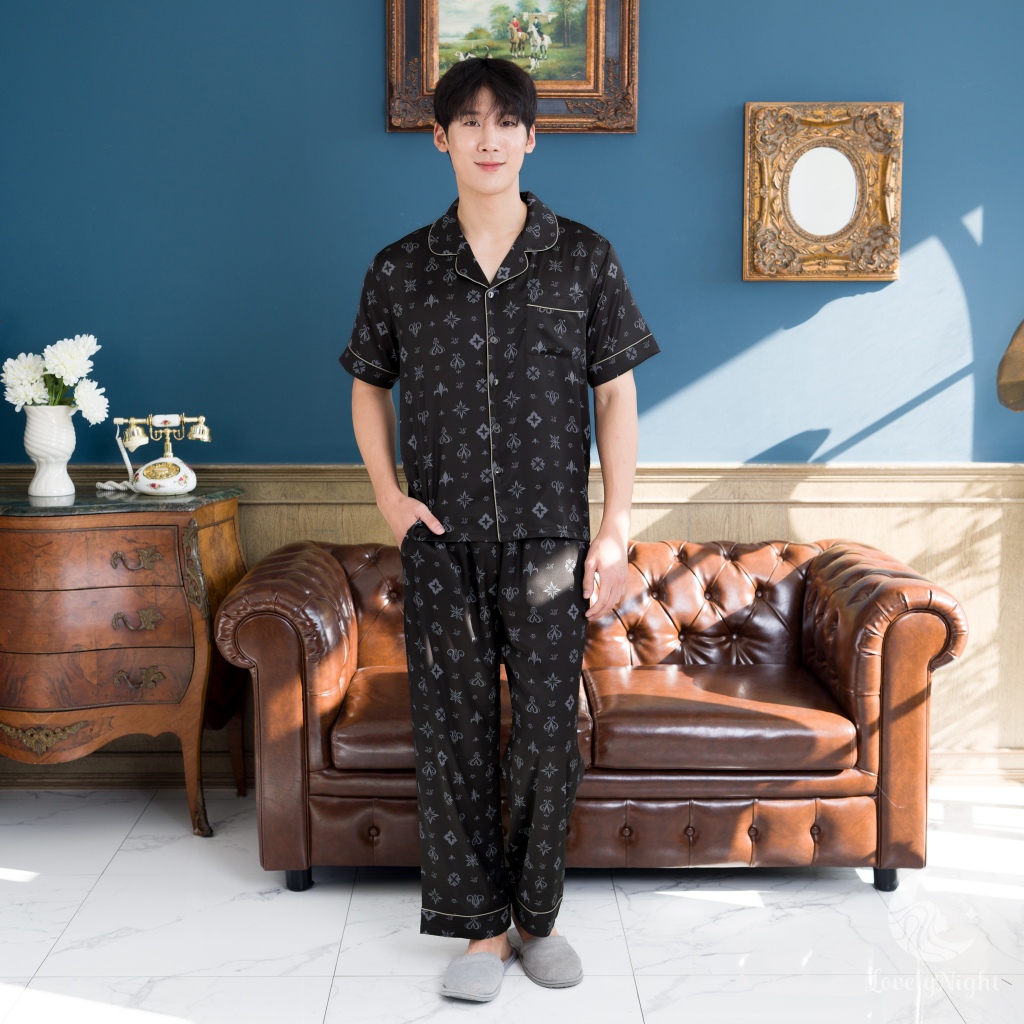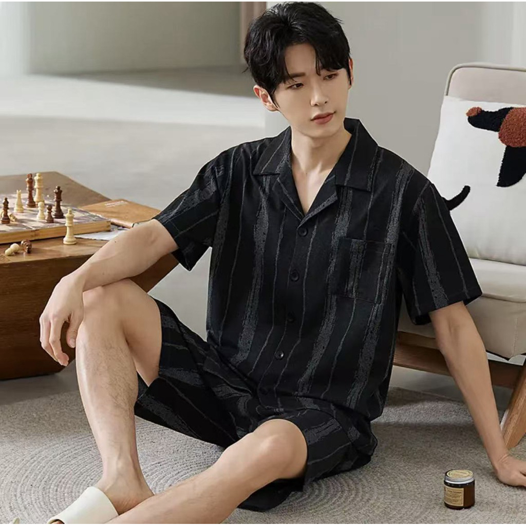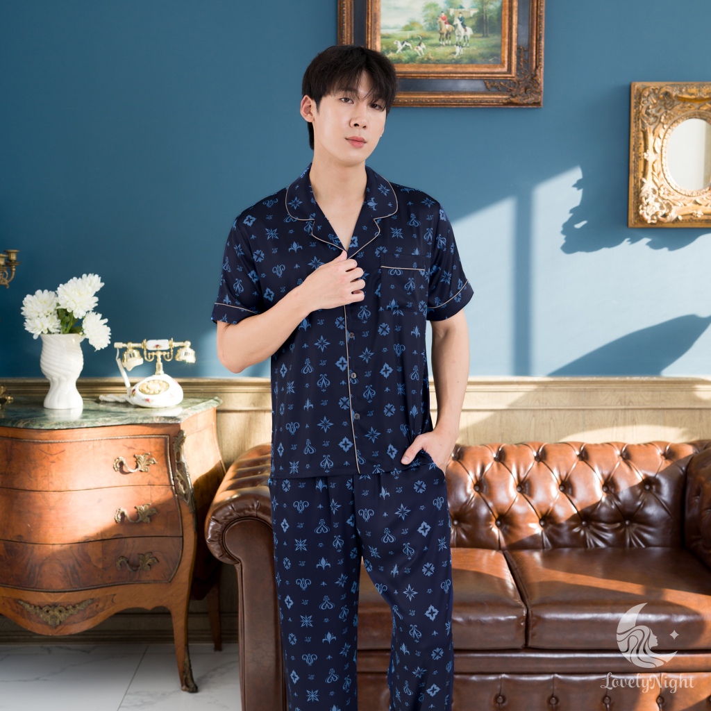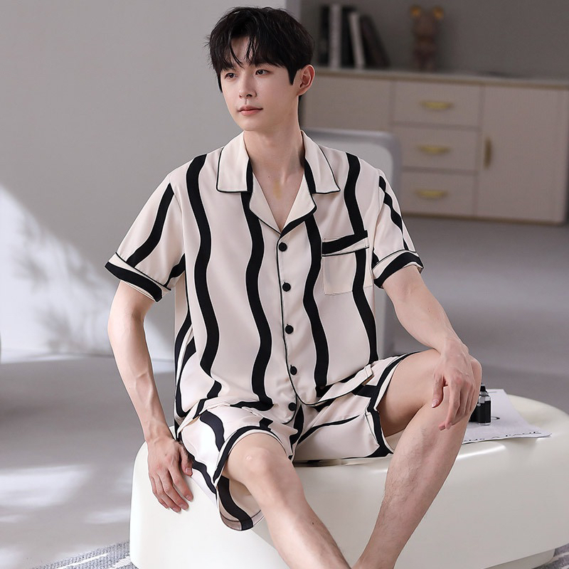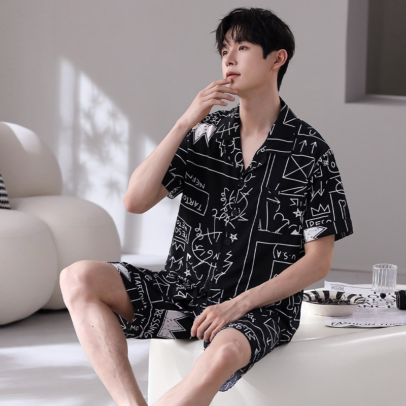 [โอเซ่] 40-100กก.ผ้าไหมน้ําแข็งชุดนอนผู้ชายปกพิมพ์กางเกงขาสั้นแขนสั้นผ้าไหมบางฤดูร้อนนักเรียนเยาวชนชุดบ้านสูทขนาดบวกผู้ชายอ้วนบ้านผ้า