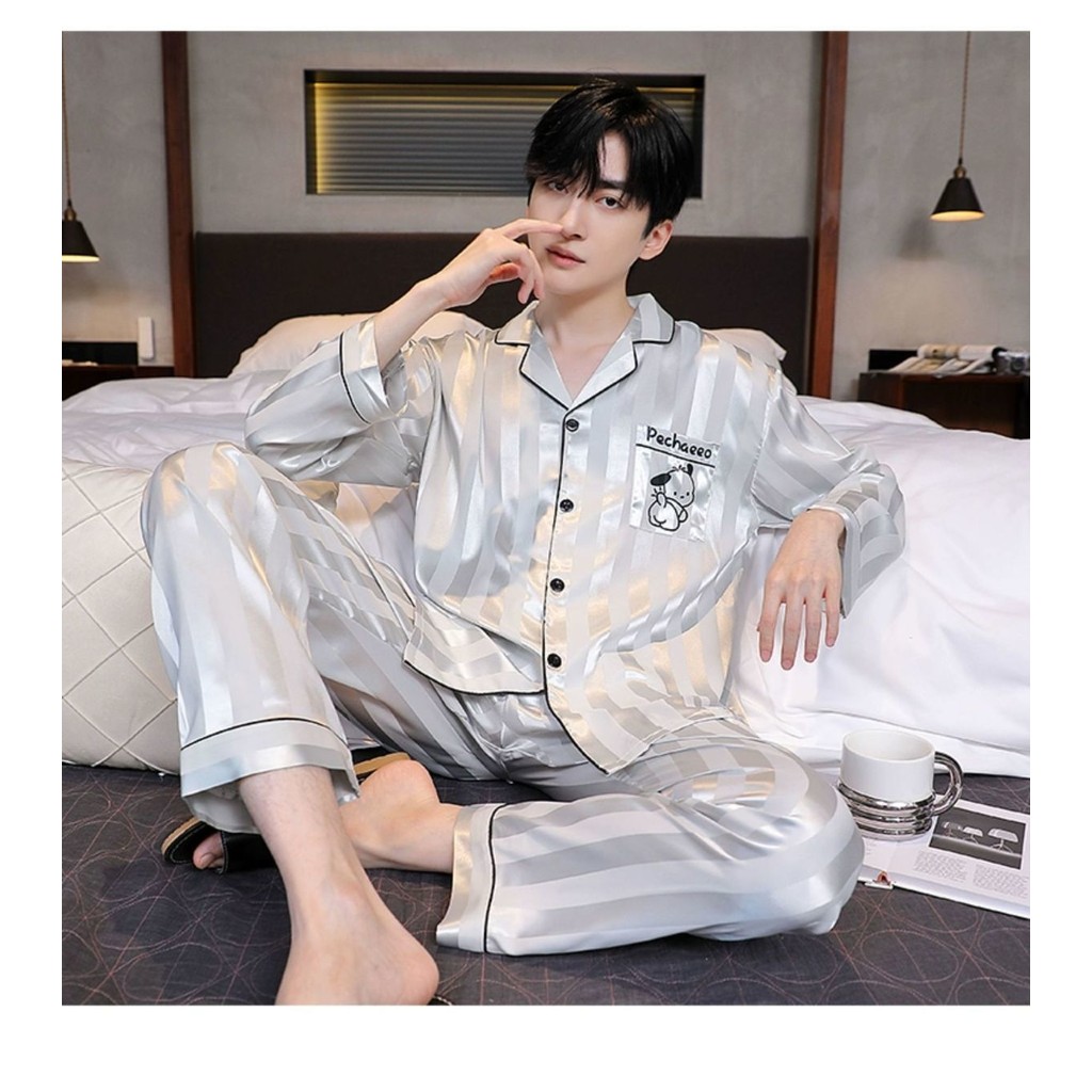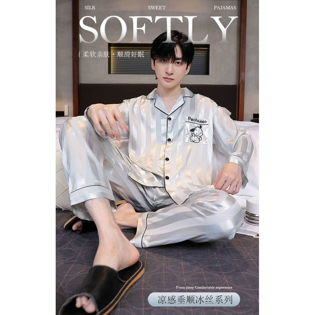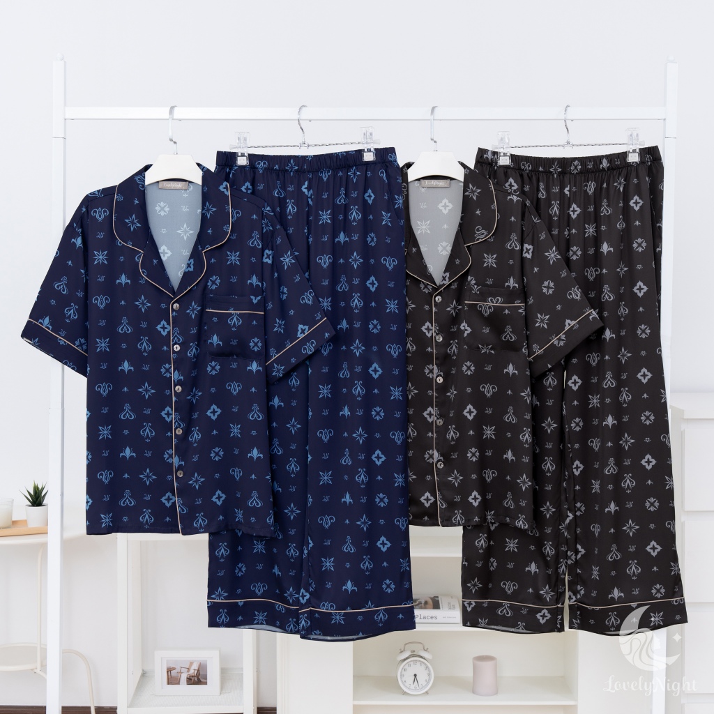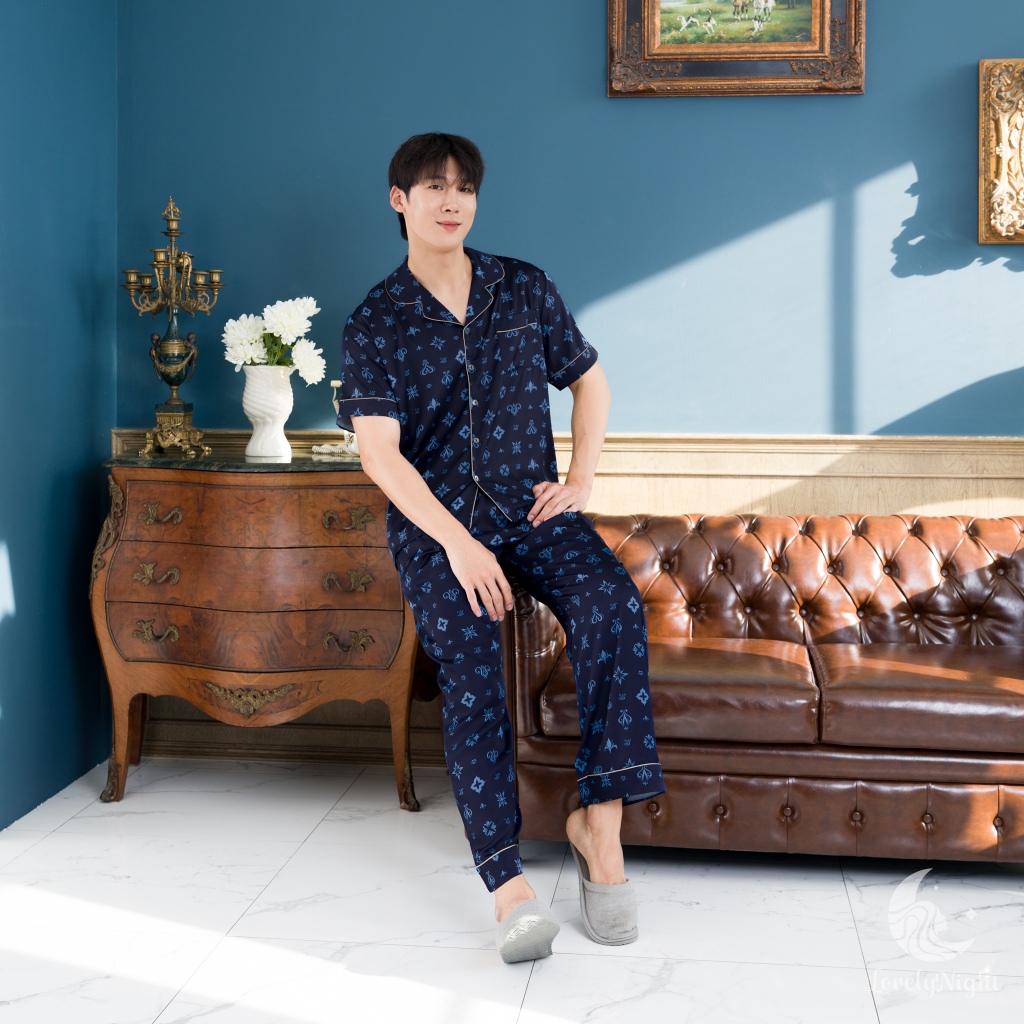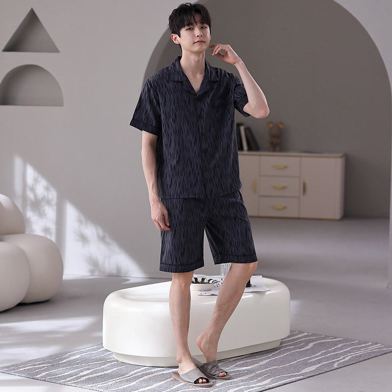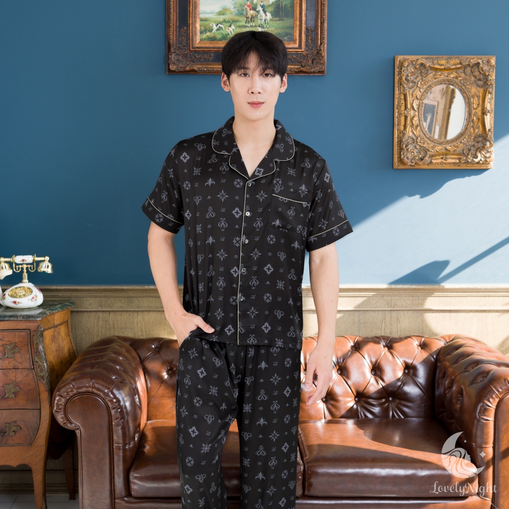 [โอเซ่] 40-100กก.ผ้าไหมน้ําแข็งชุดนอนผู้ชายปกพิมพ์กางเกงขาสั้นแขนสั้นผ้าไหมบางฤดูร้อนนักเรียนเยาวชนชุดบ้านสูทขนาดบวกผู้ชายอ้วนบ้านผ้า