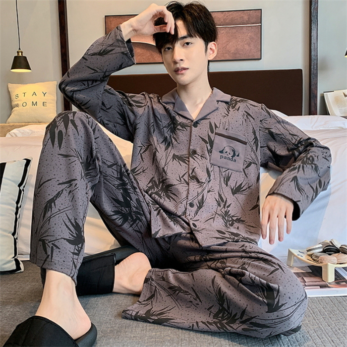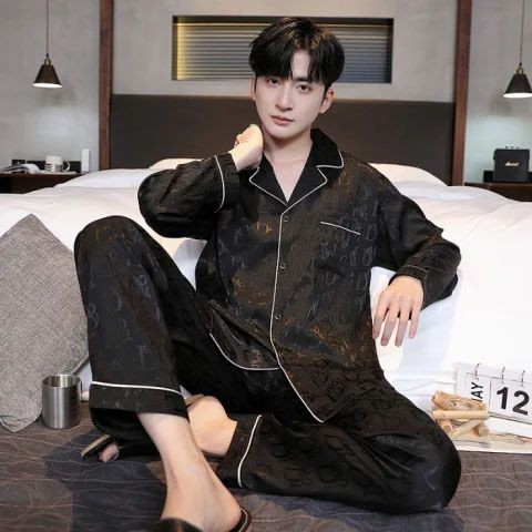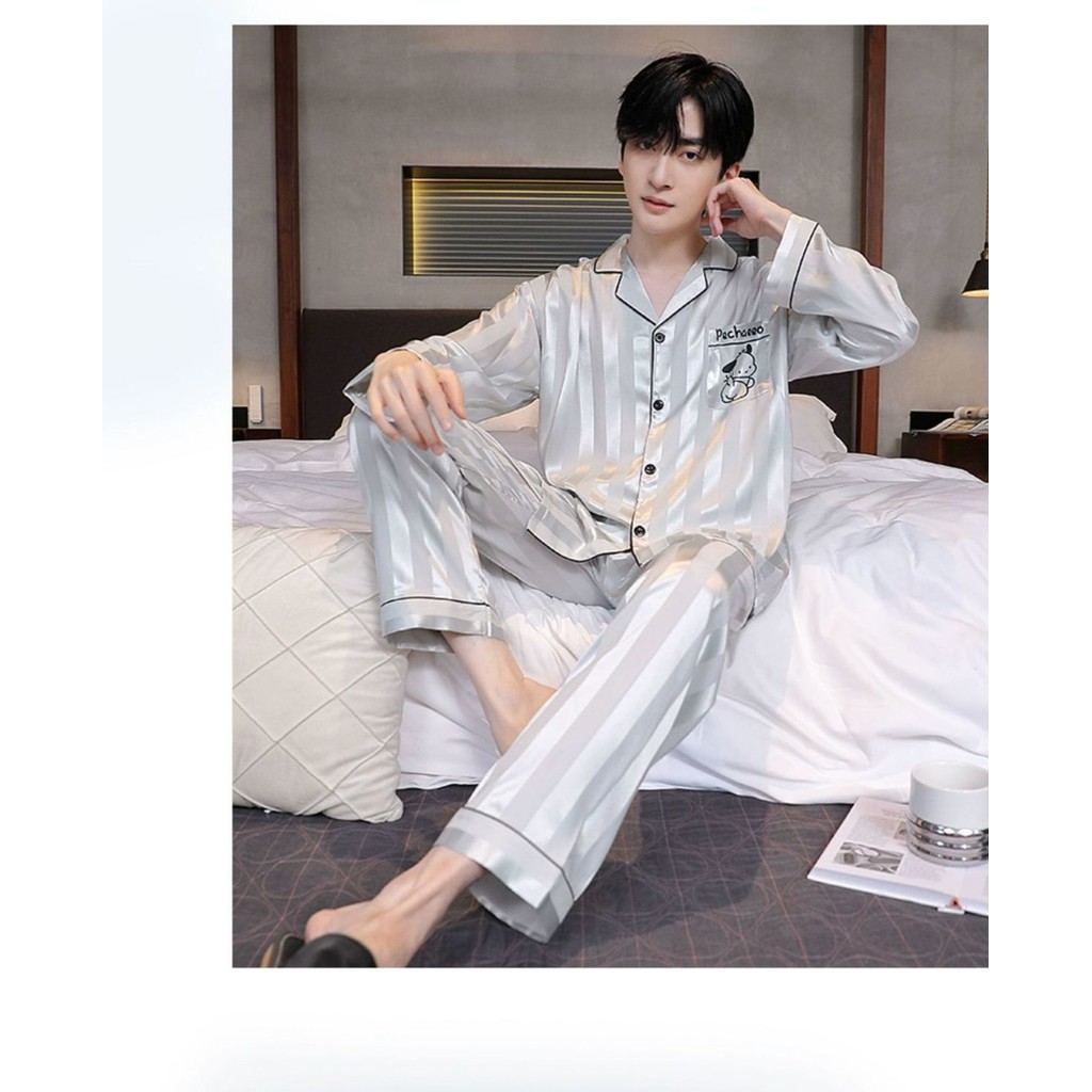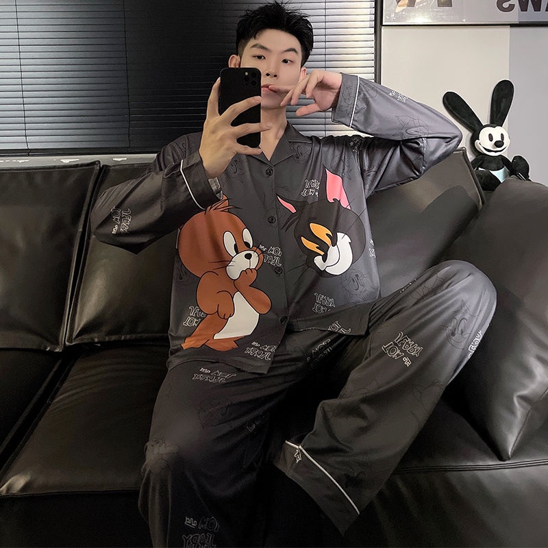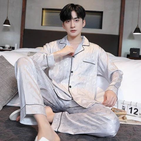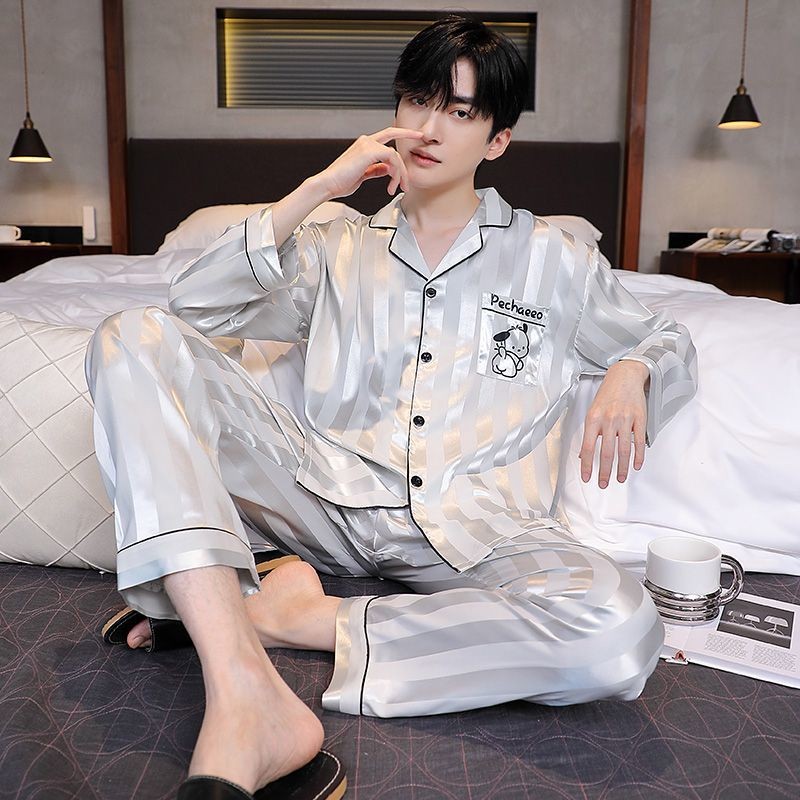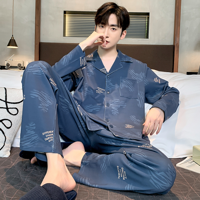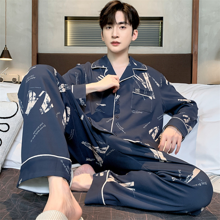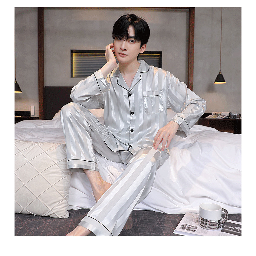 YHTN ชุดนอนผู้ชายแขนยาว แบบใหม่ จากผ้าไหมน้ำแข็ง ระดับไฮเอนด์ สบายเมื่อพักผ่อนในบ้าน ชุดนอนชาย