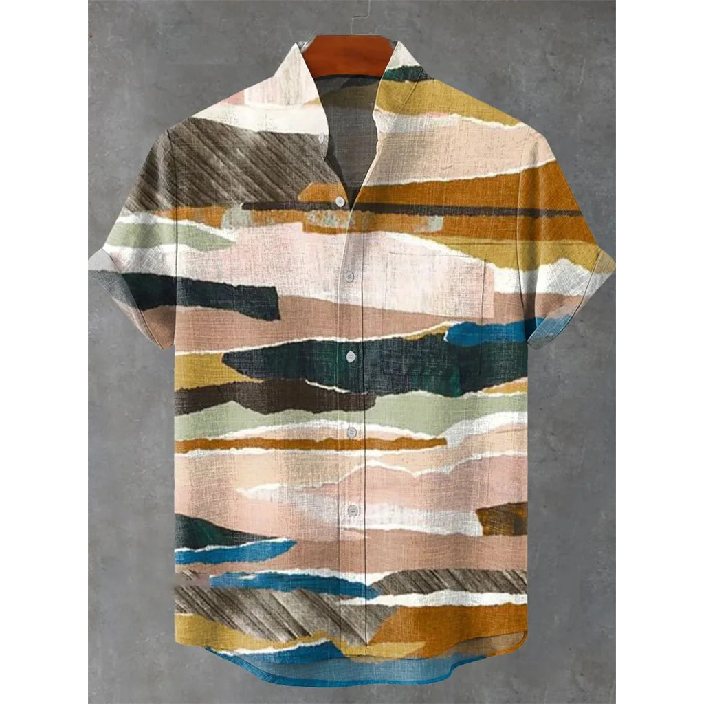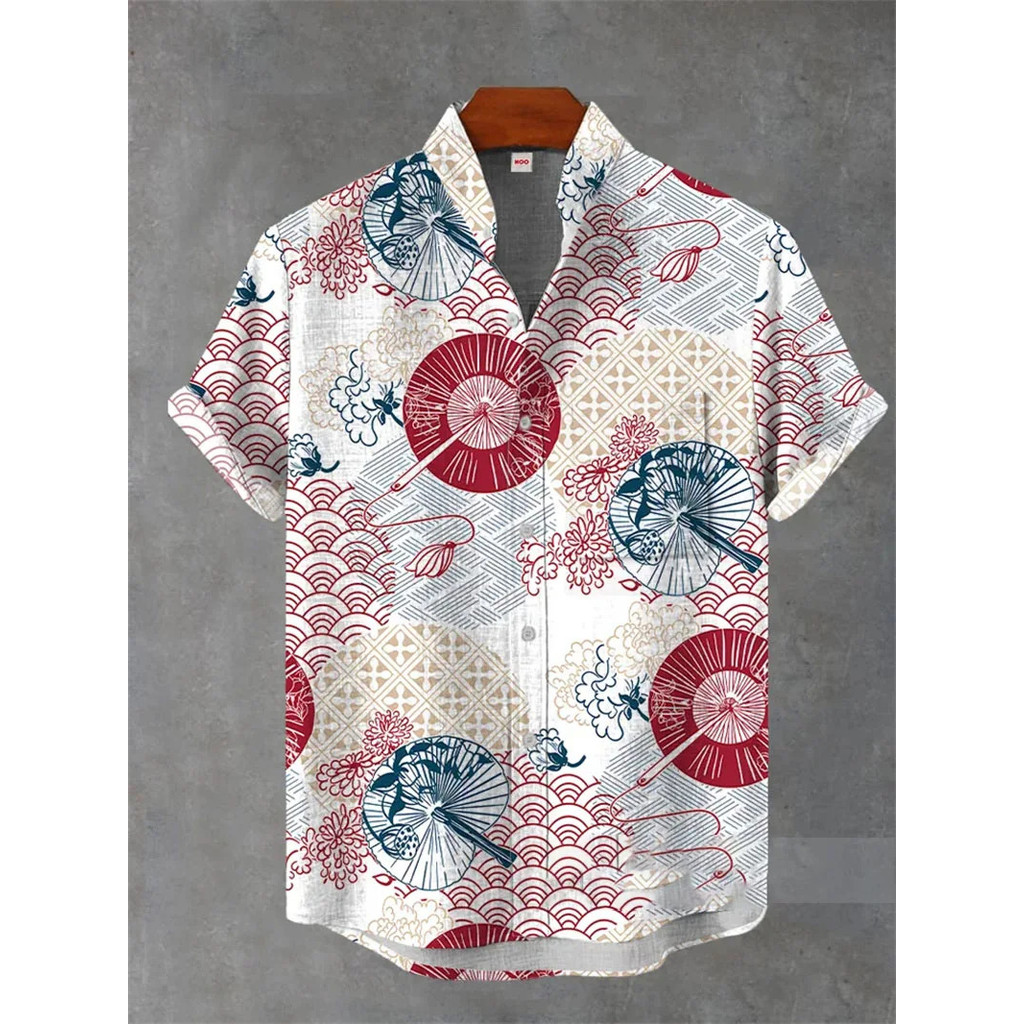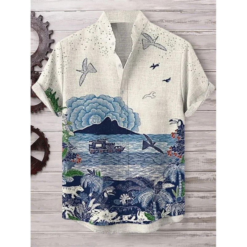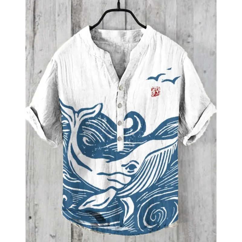 เสื้อลำลองผู้ชายแบบฮาราจูกุและฮาวาย พิมพ์ลายคลื่นจากผ้าลินิน สวมใส่ง่ายในวันหยุดฤดูร้อน