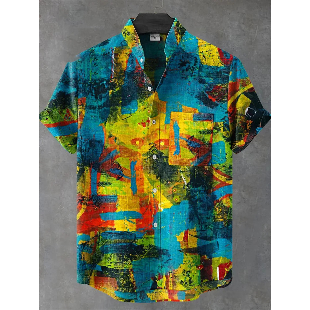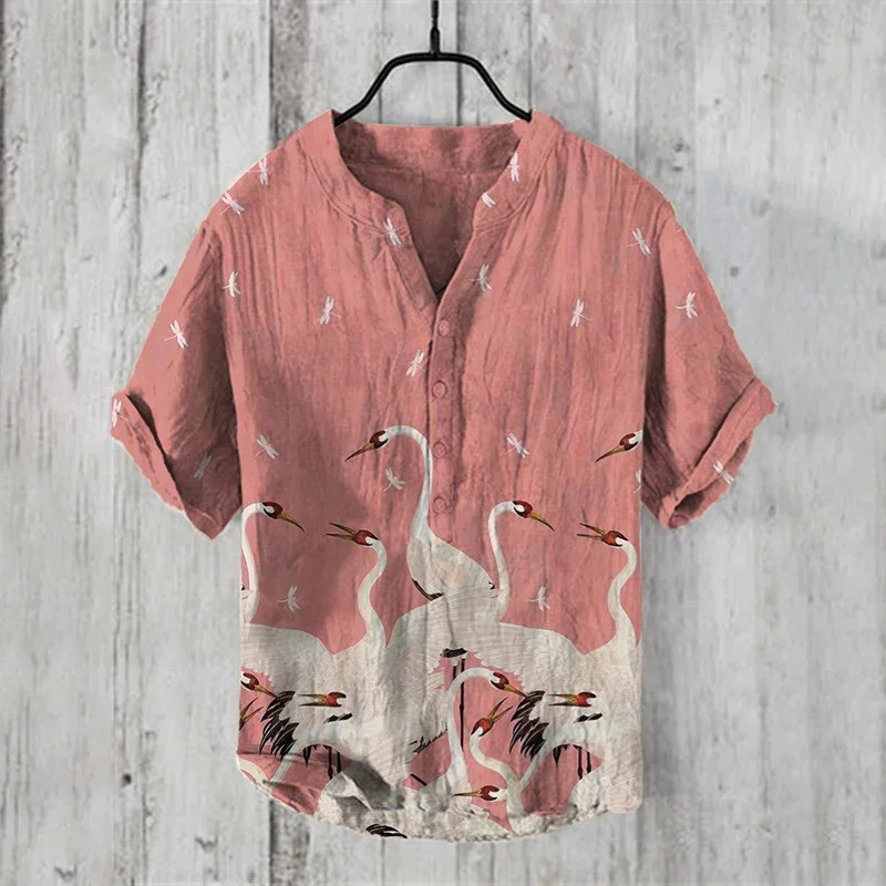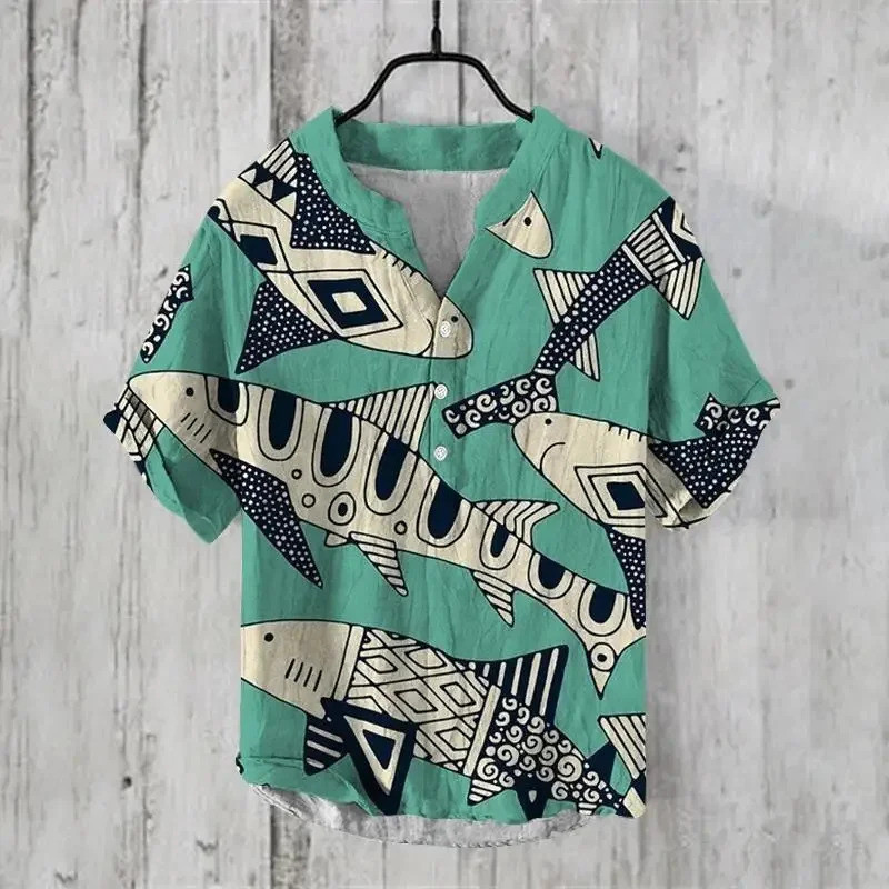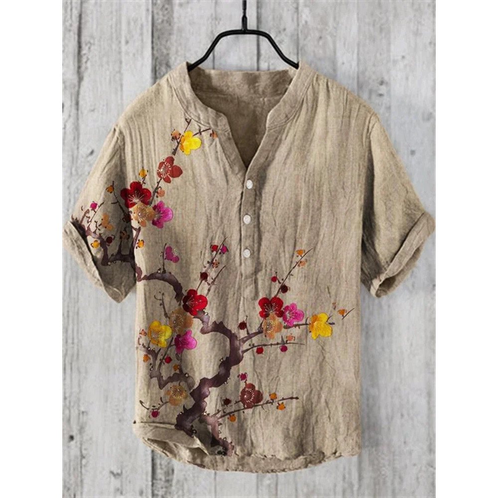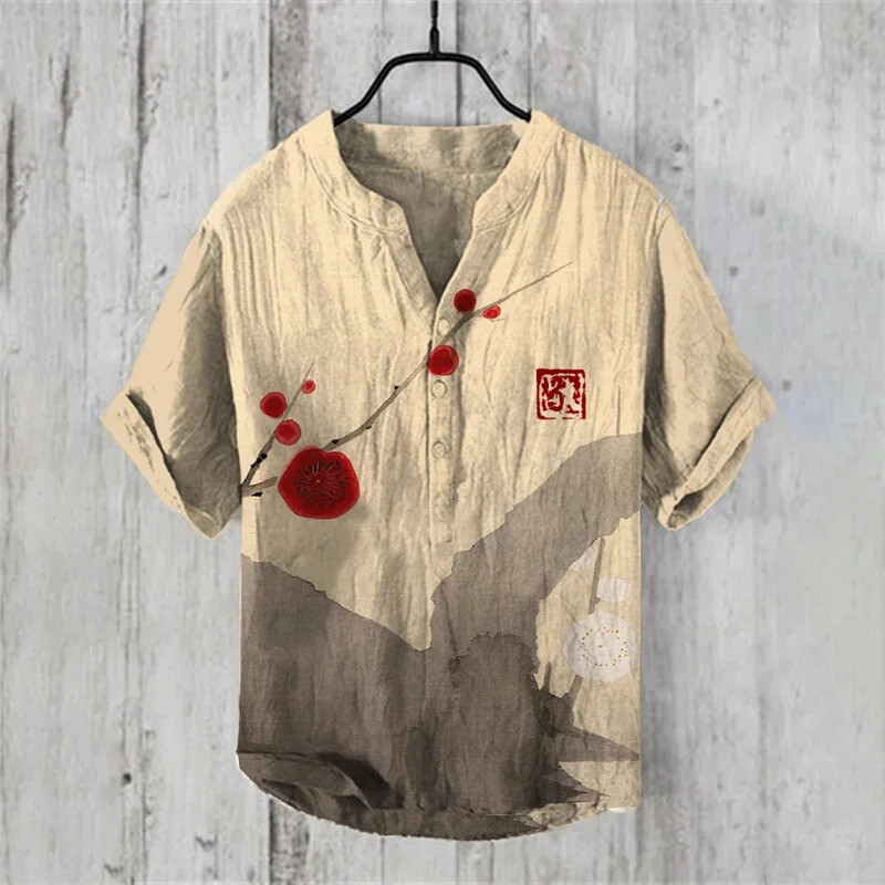 เสื้อลำลองผู้ชายแบบฮาราจูกุและฮาวาย พิมพ์ลายคลื่นจากผ้าลินิน สวมใส่ง่ายในวันหยุดฤดูร้อน