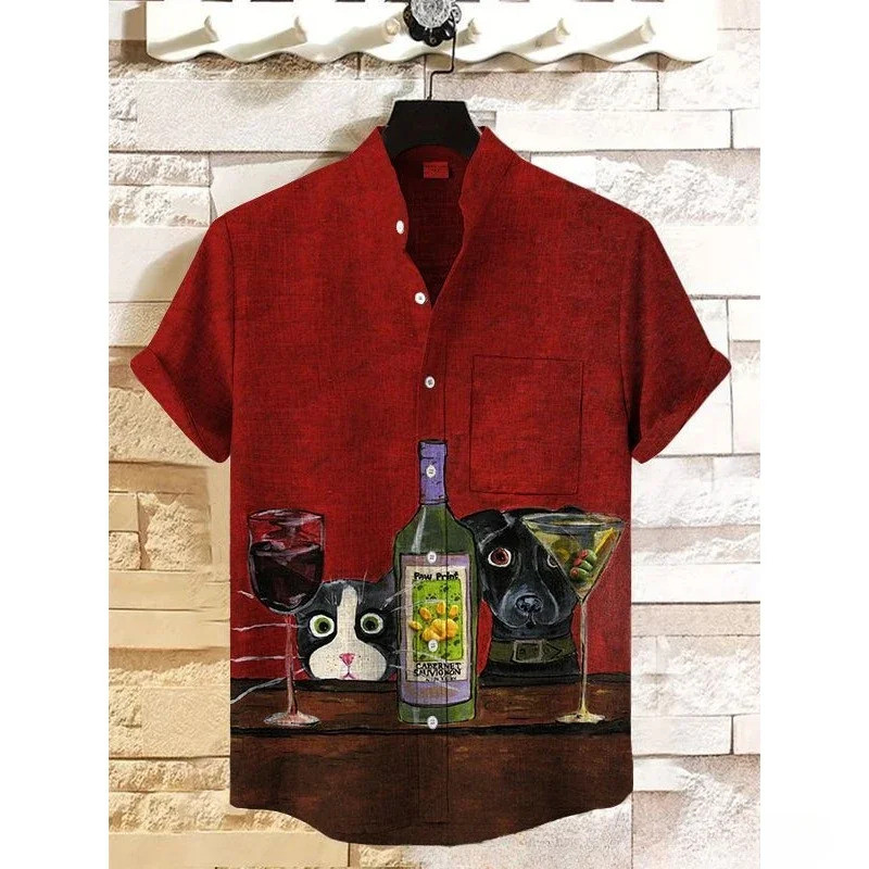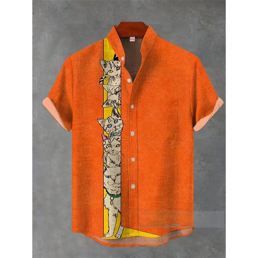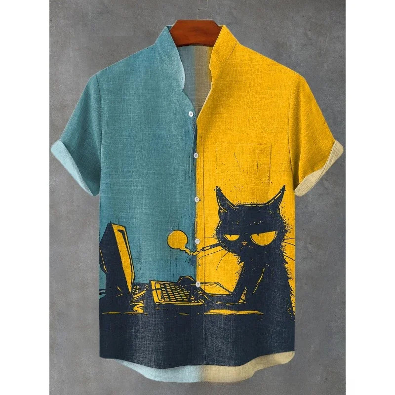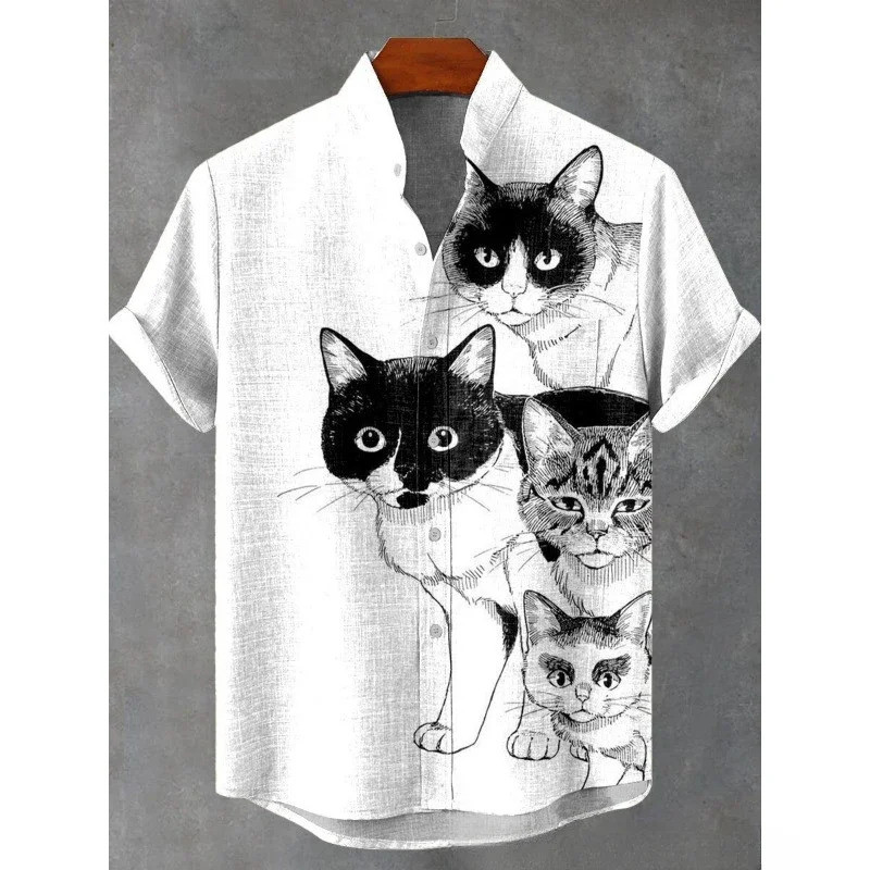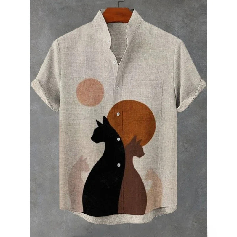 เสื้อลินินผสมสำหรับผู้ชาย สไตล์ Harajuku Hipster พิมพ์ลาย.Black Cat Contrast งานดีไซน์ Decadent