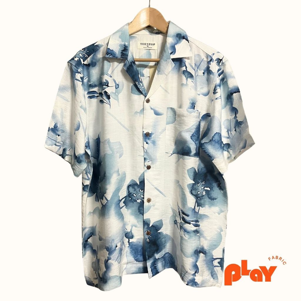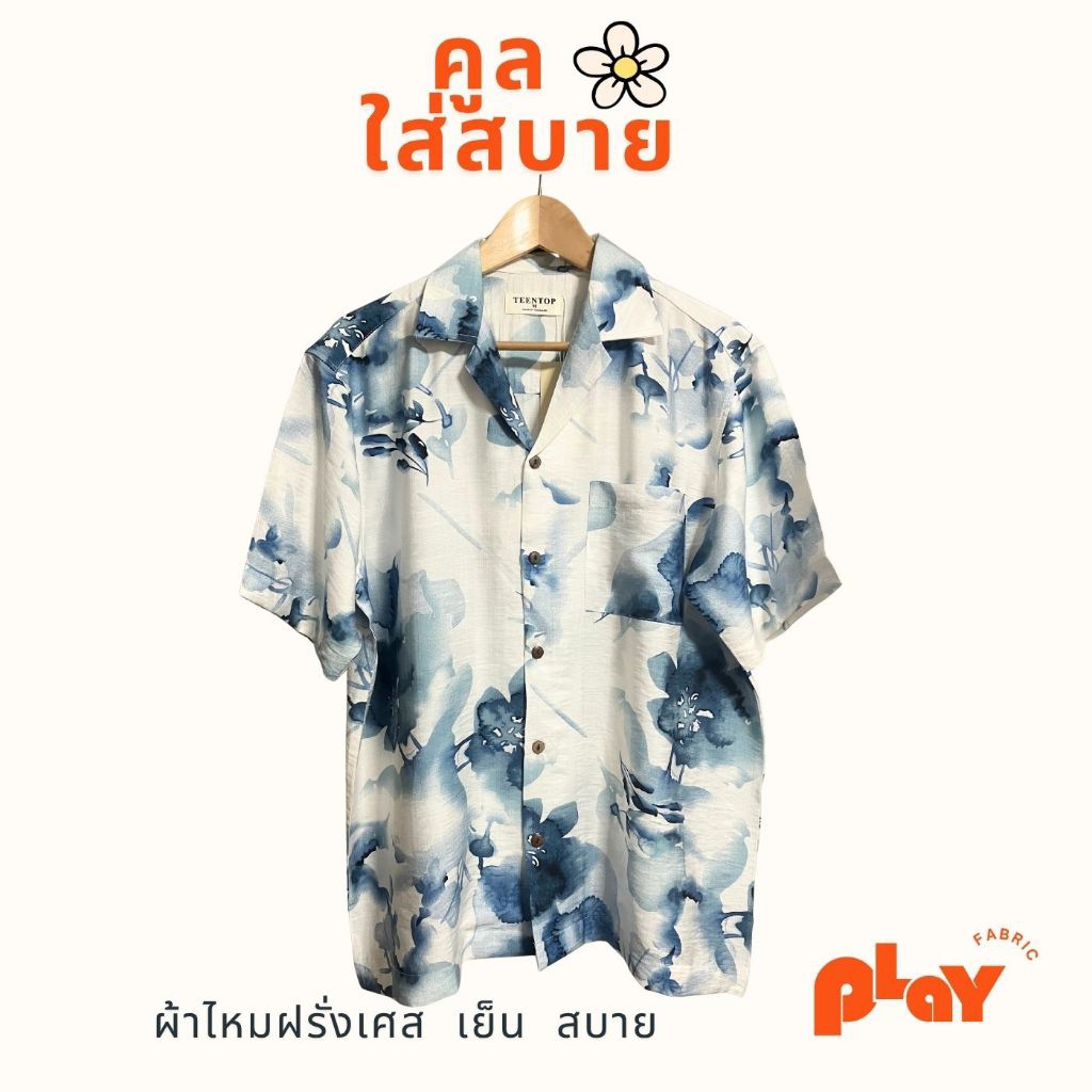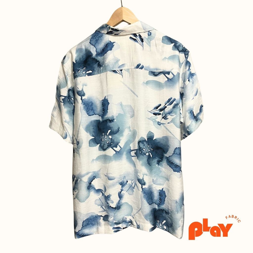เสื้อฮาวาย ผ้าไหมฝรั่งเศส ลายสีน้ำดอกไม้น้ำเงิน Splash and Flower ใส่สบาย ระบายอากาศดี
