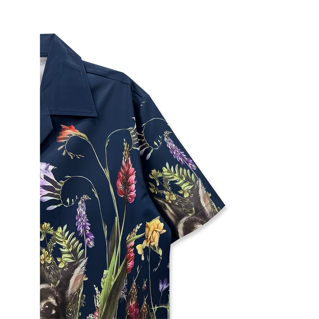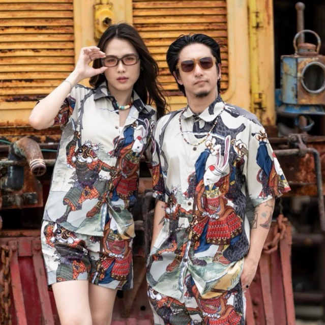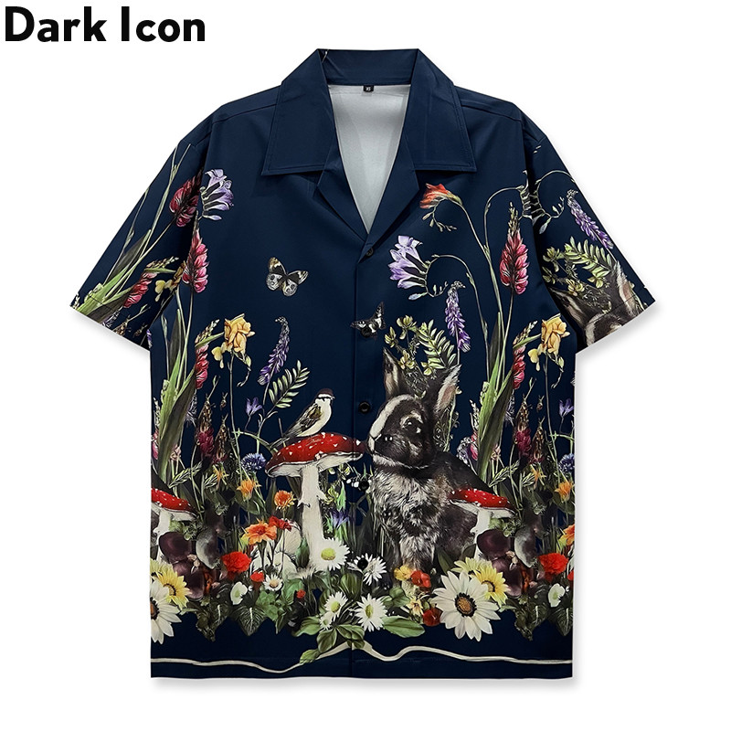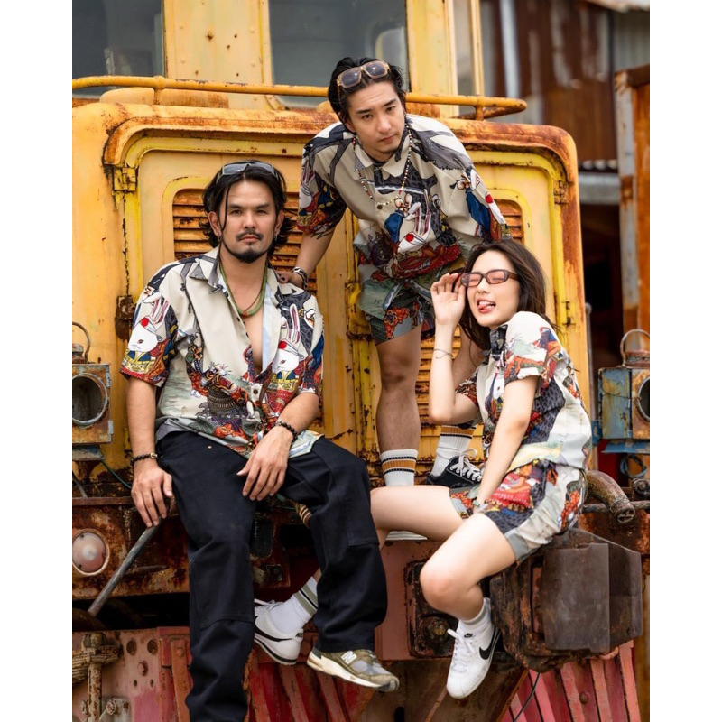 เสื้อฮาวาย.Dark Icon สำหรับผู้ชายและผู้หญิง แบบวินเทจ มีปุ่มปก เสื้อเชิ้ตฤดูร้อน